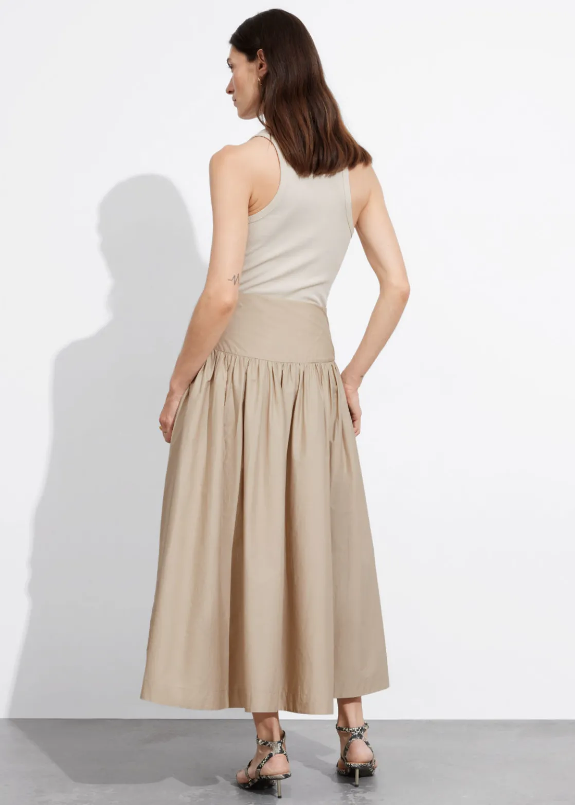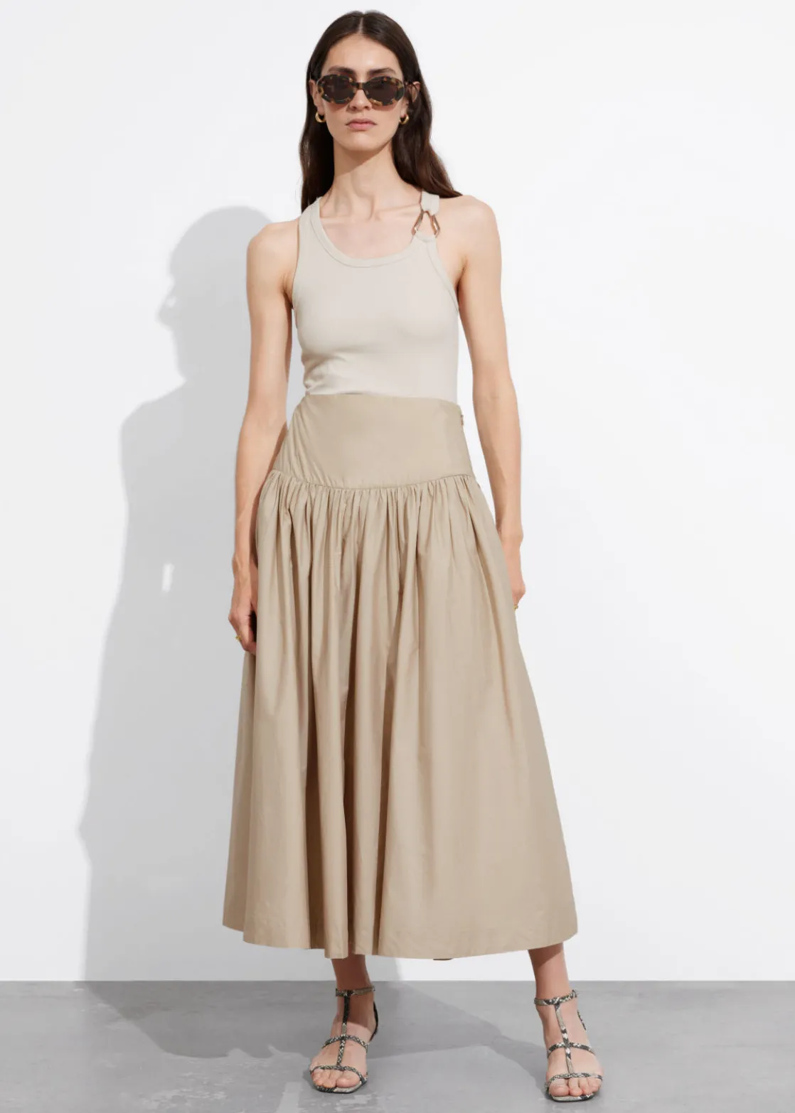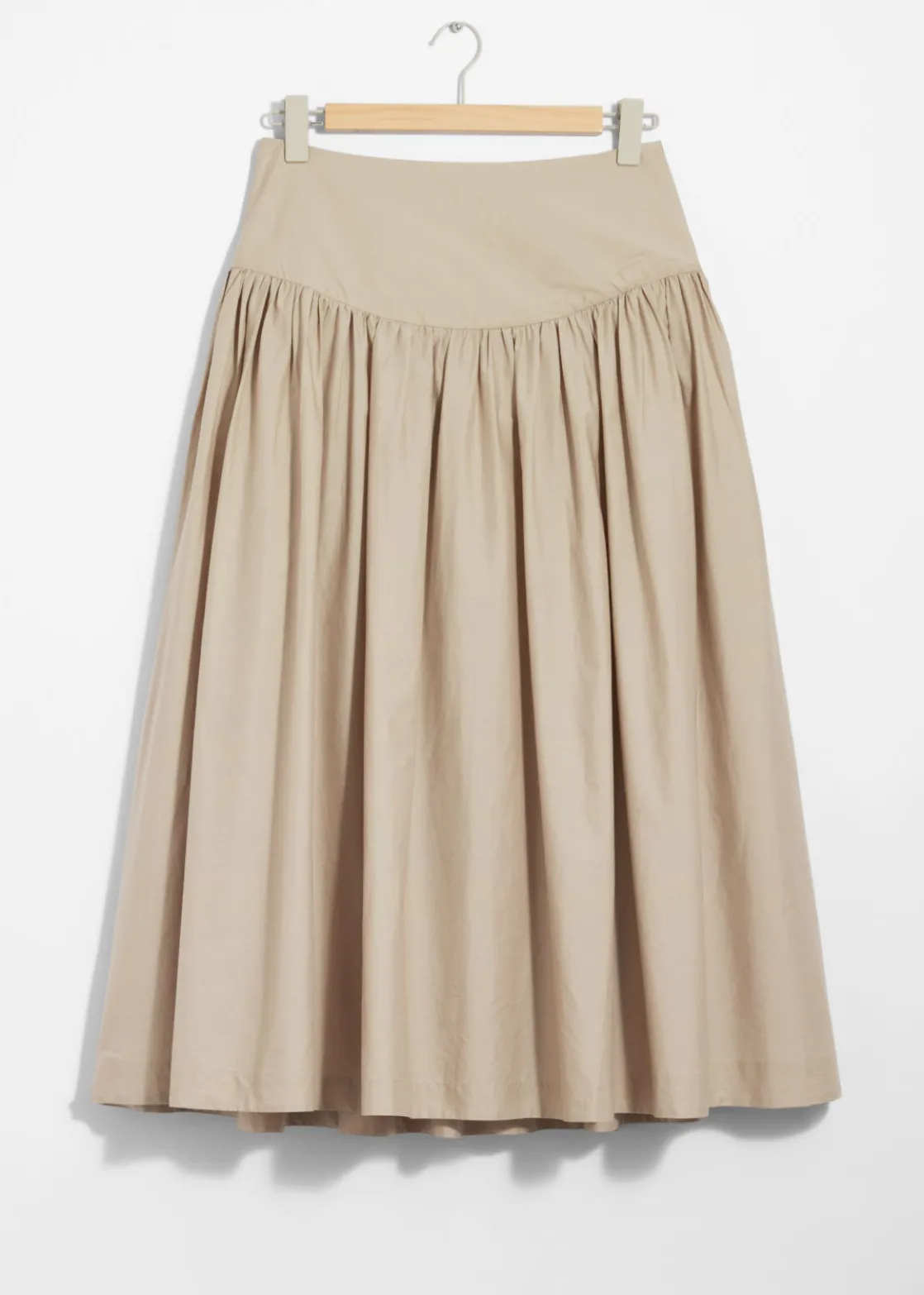 A-line midi skirt with a gently pleated silhouette. Fastened with a zipper at the side