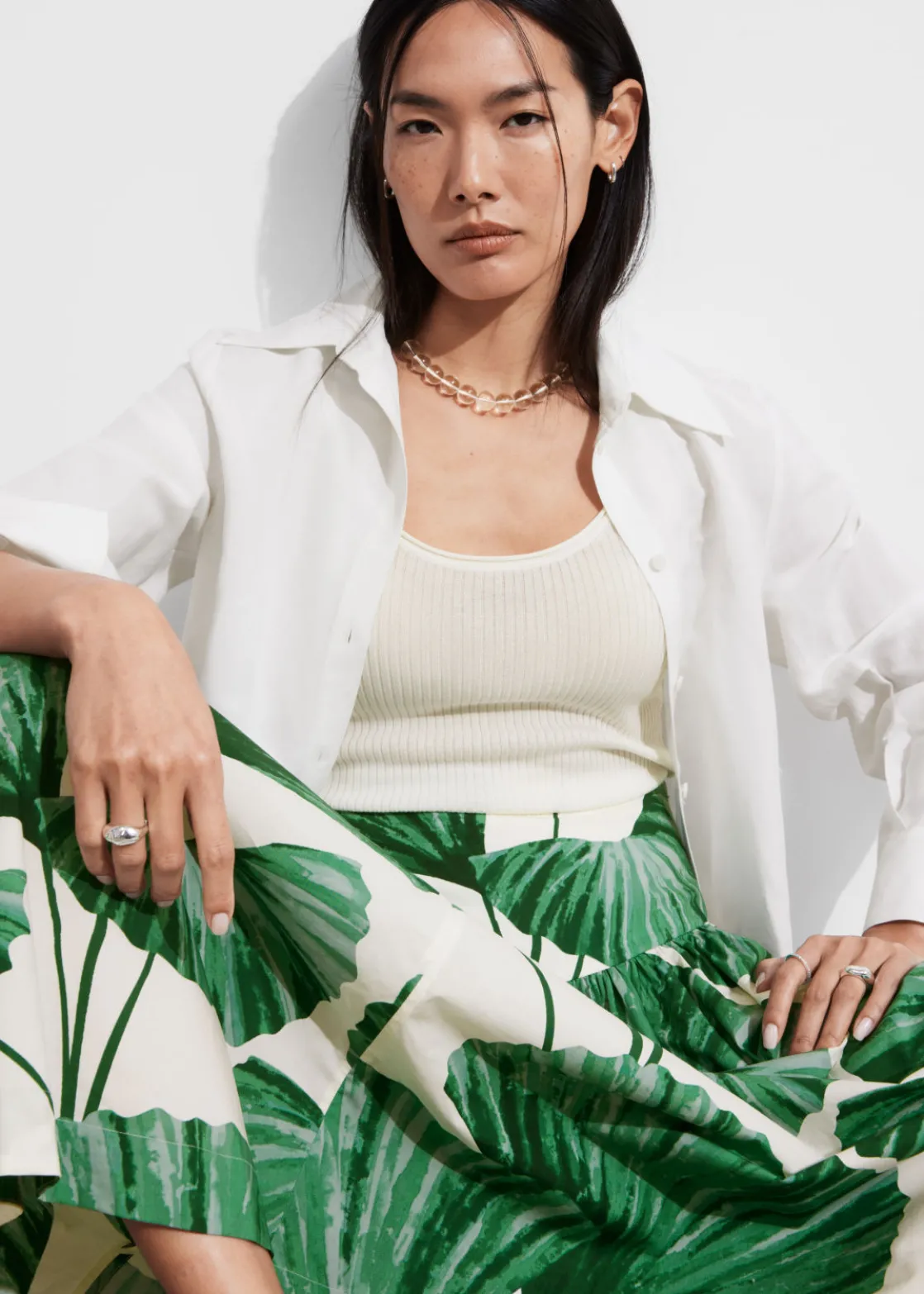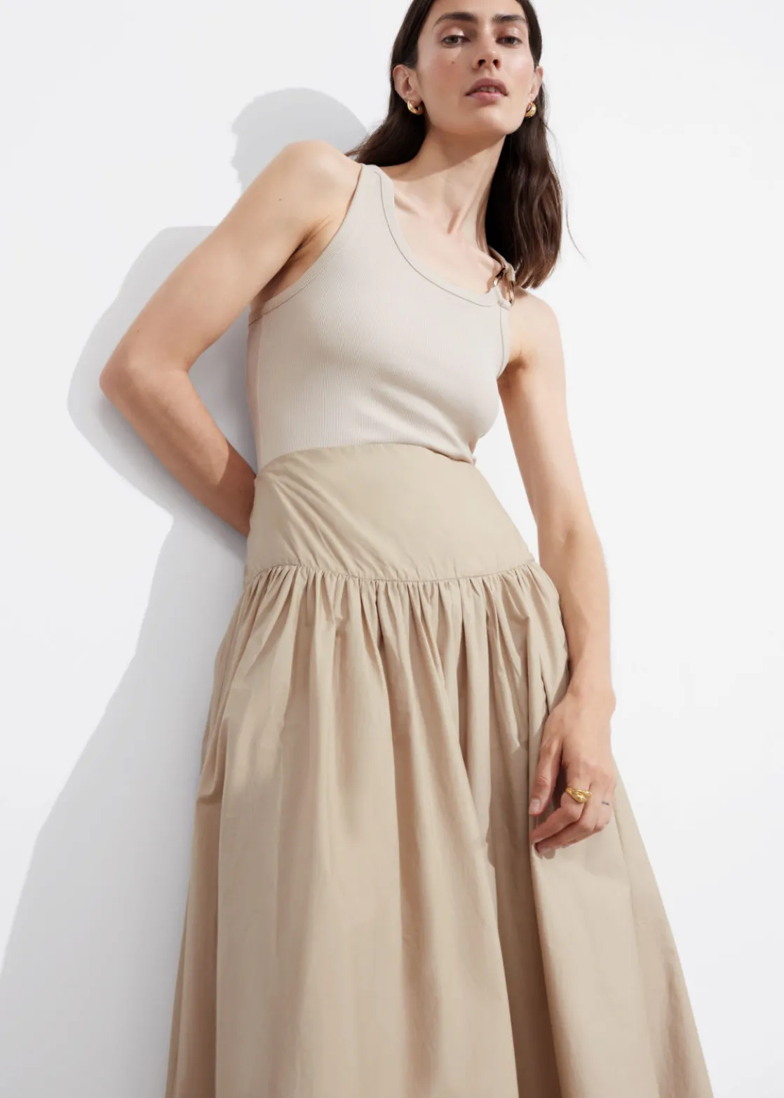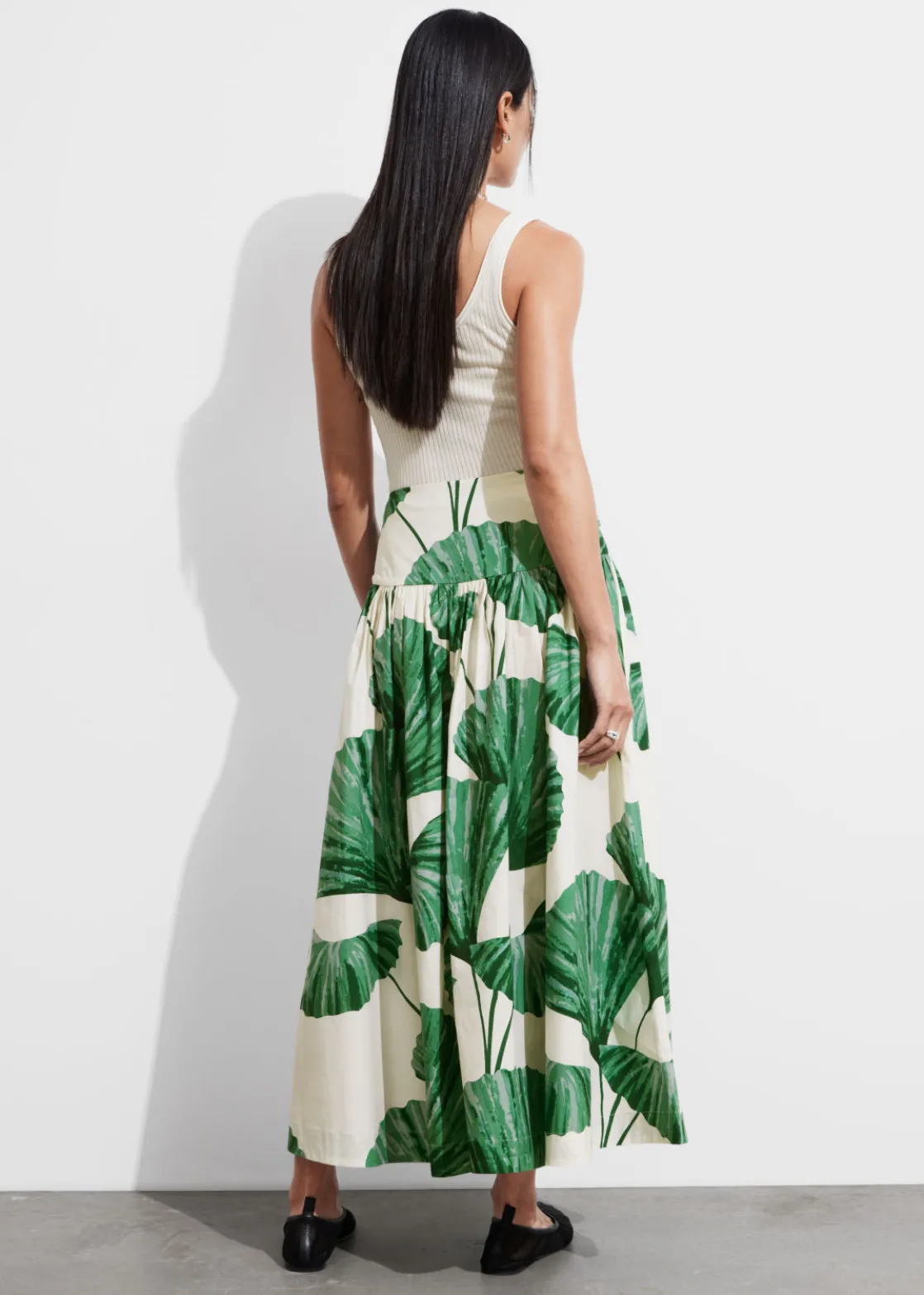 A-line midi skirt with a gently pleated silhouette. Fastened with a zipper at the side
