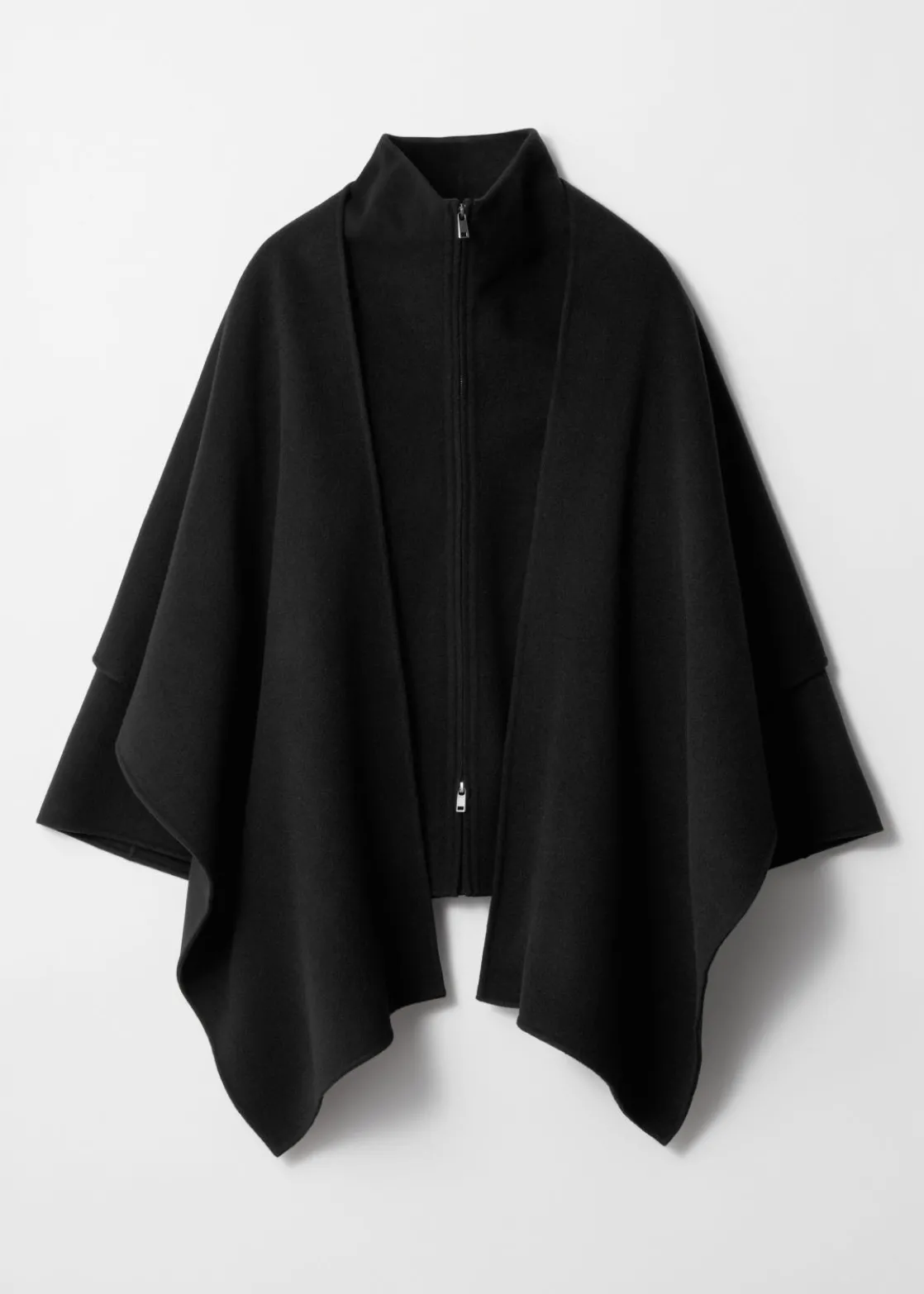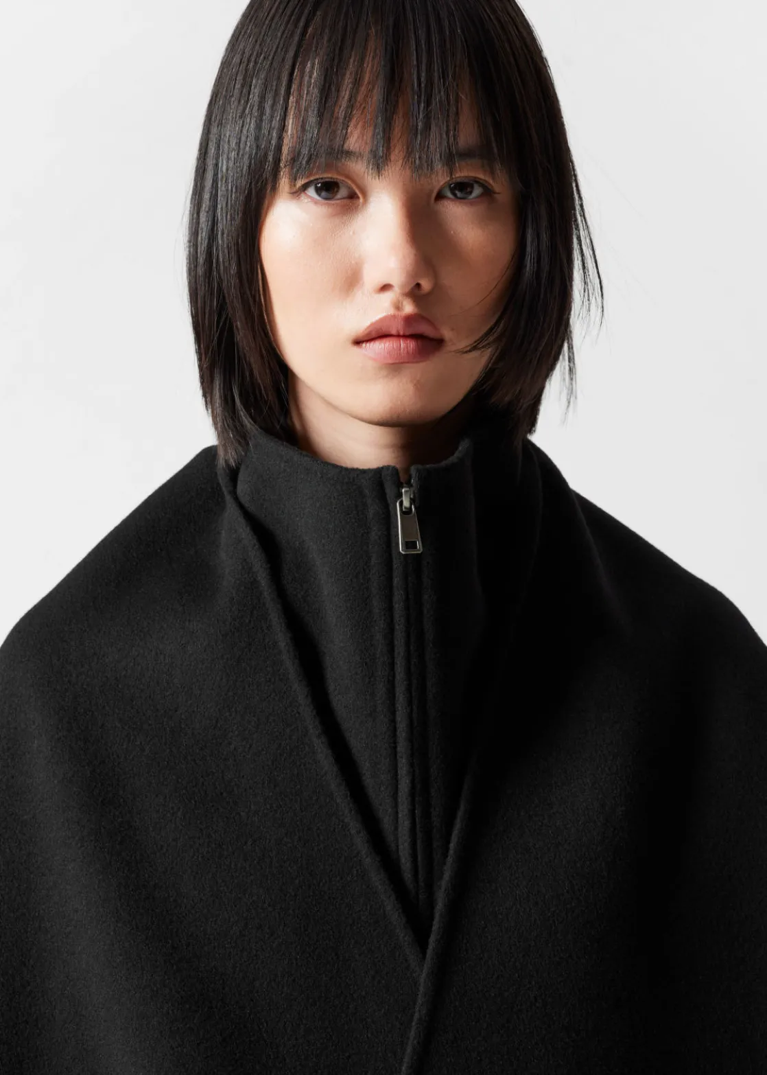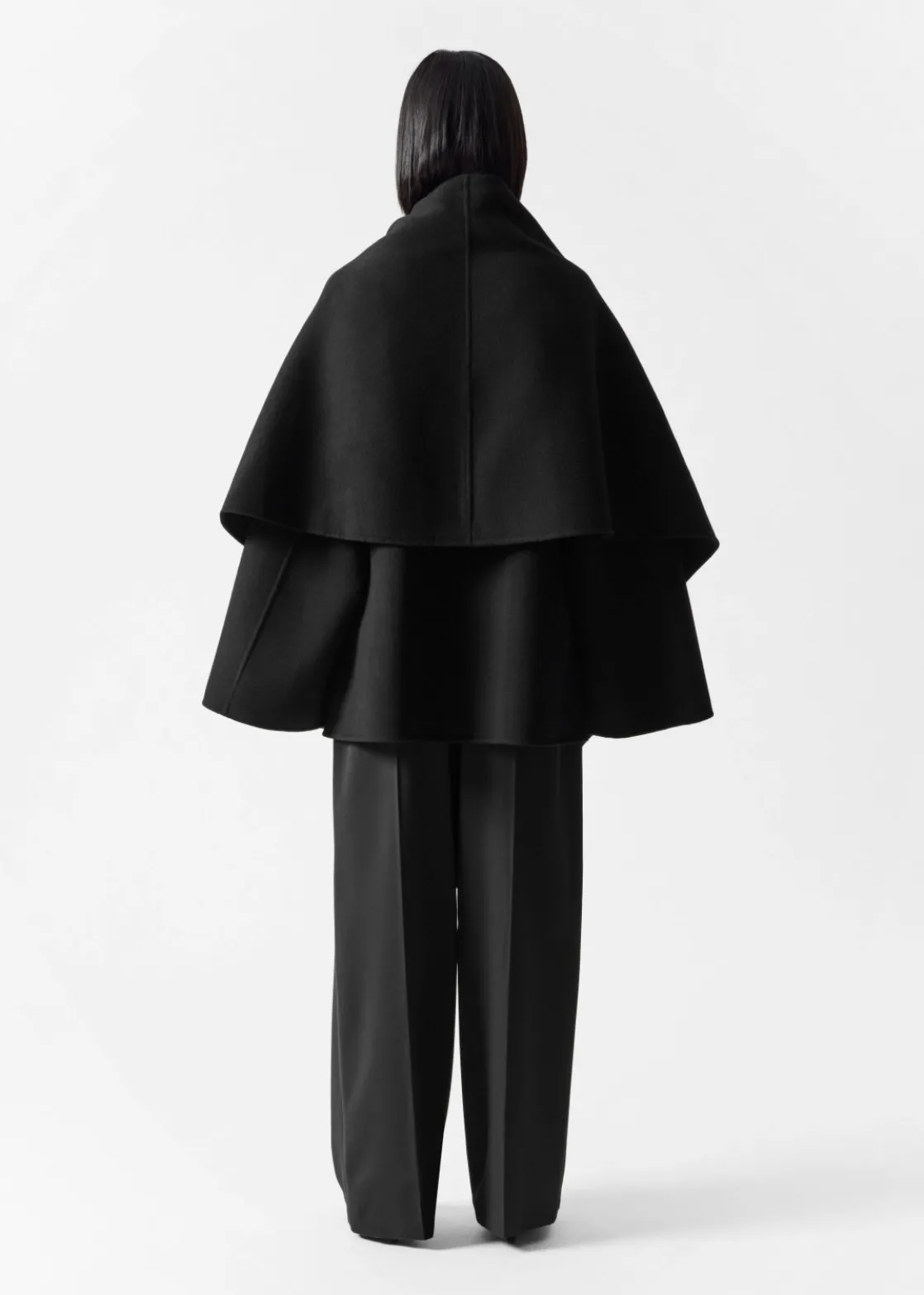 Wool-blend cape designed with a high collar and layered finish that falls that an asymmetric hemline.