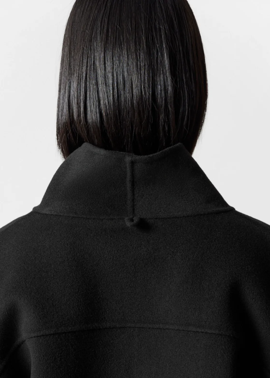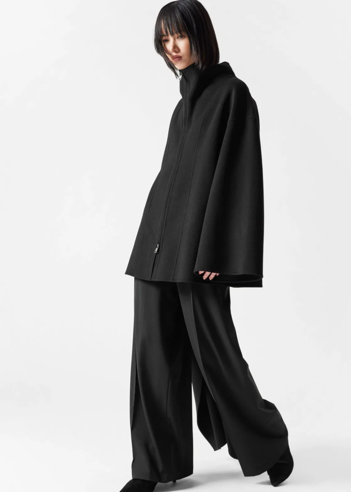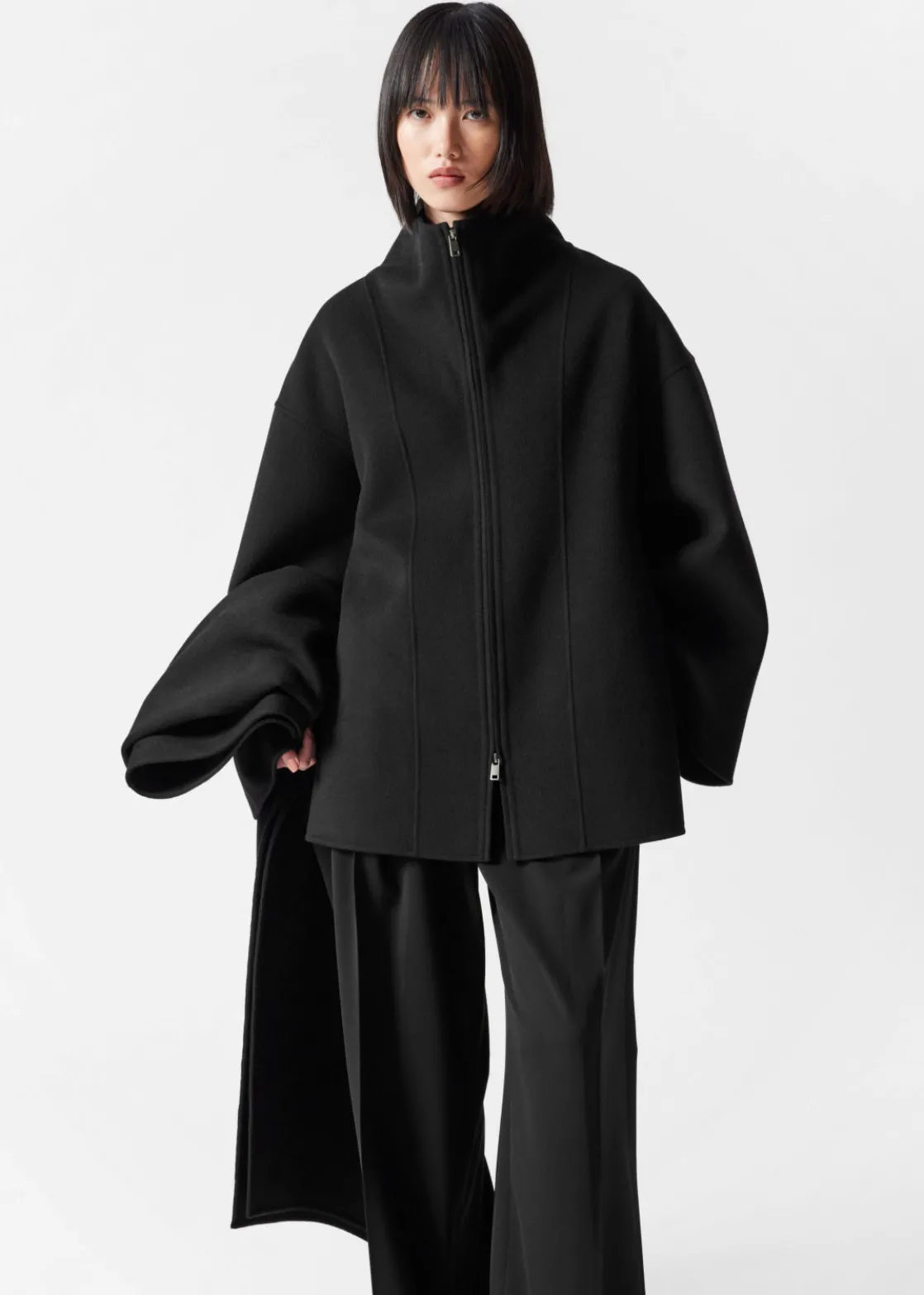 Wool-blend cape designed with a high collar and layered finish that falls that an asymmetric hemline.