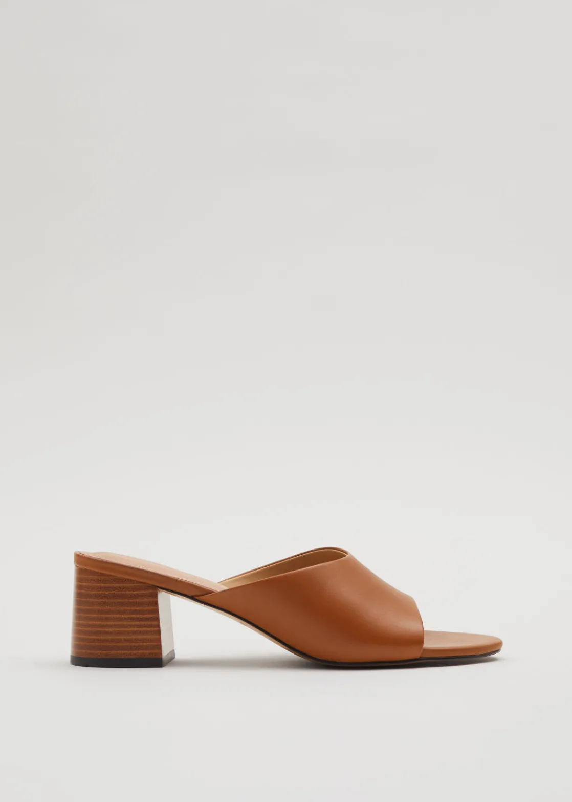 Mules crafted from nappa leather featuring a slight ’90s feel with minimalist lines, rounded toes and stacked block heels.