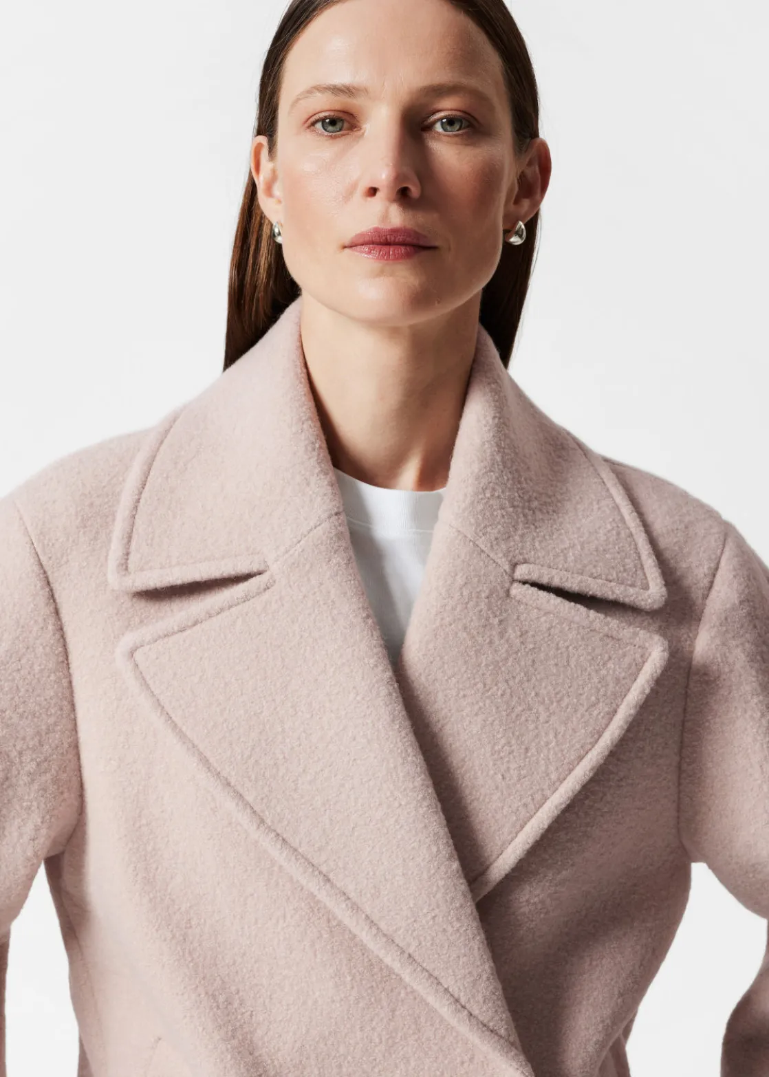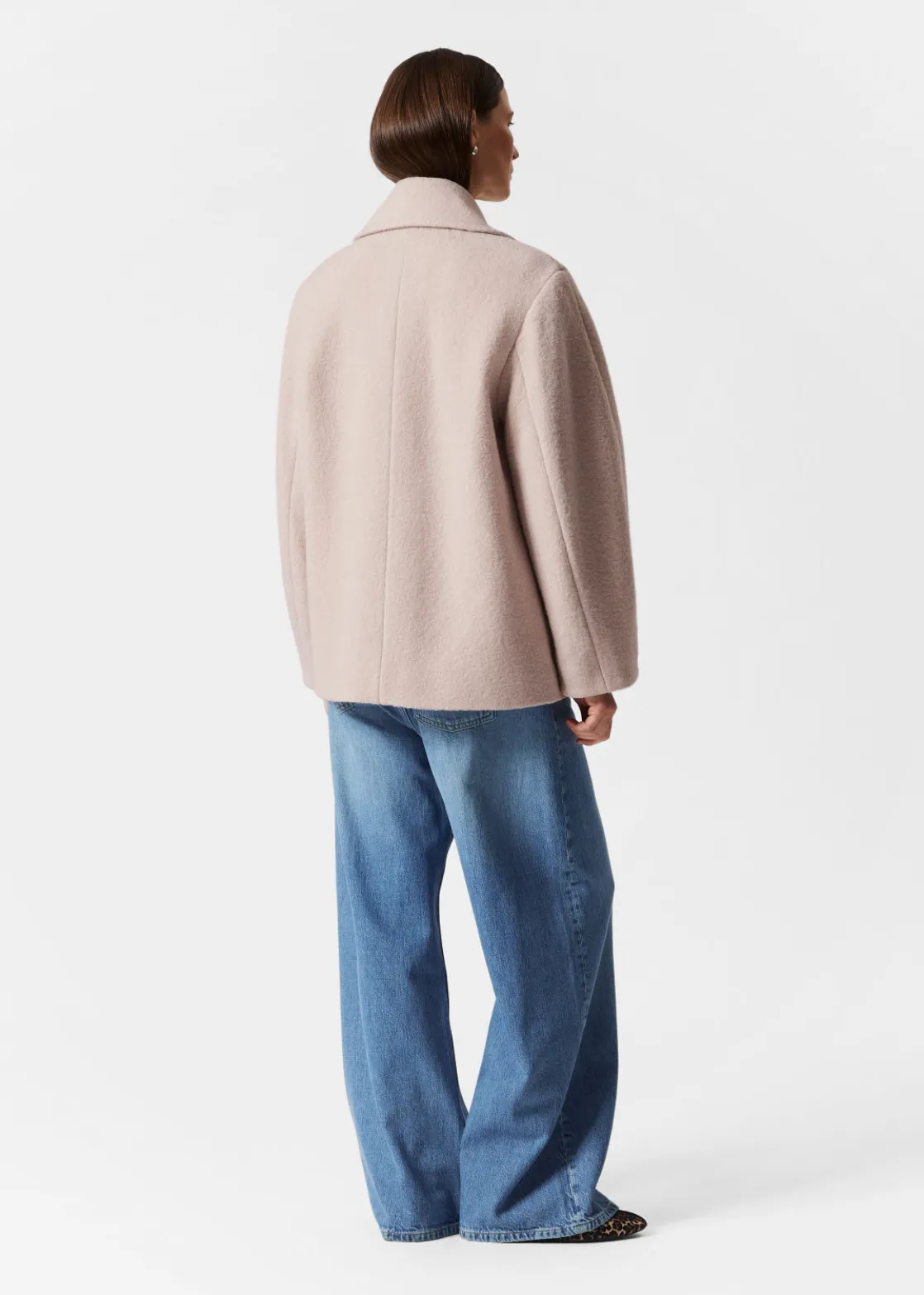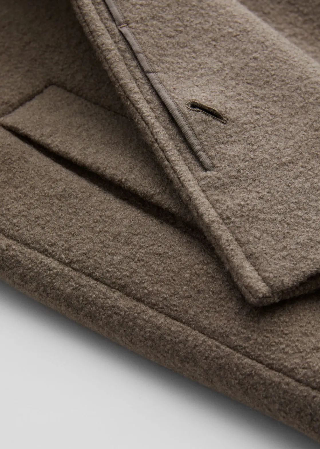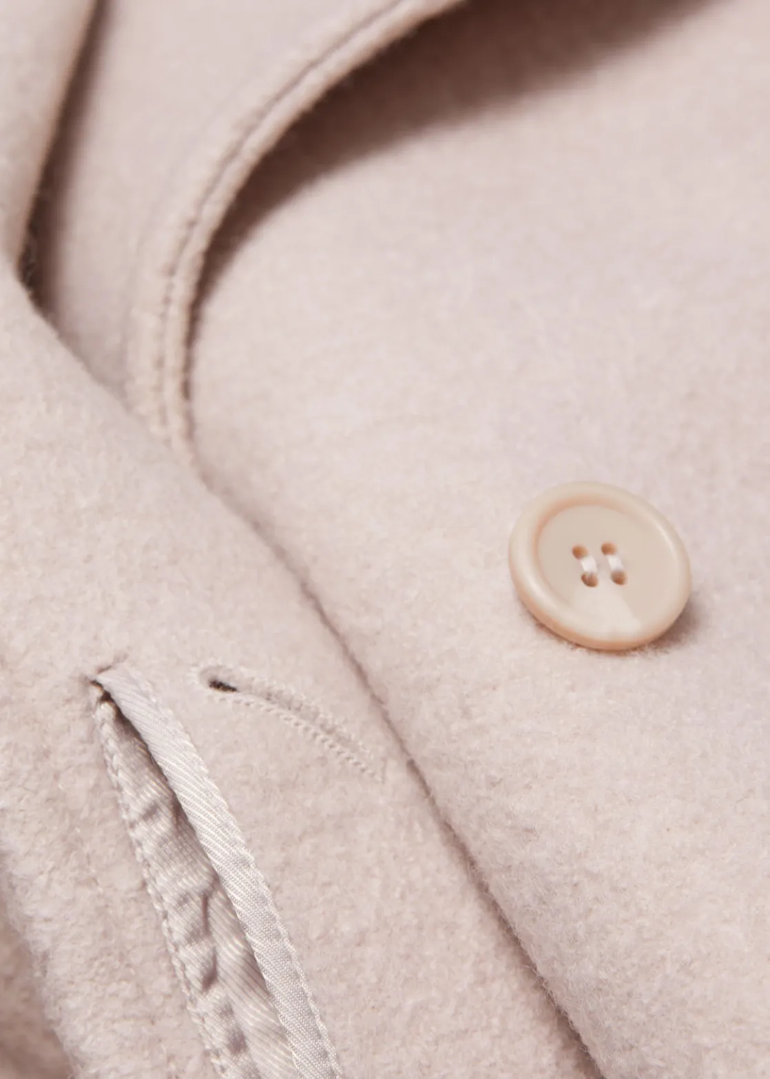 Double-breasted wool jacket designed with a large notched lapel collar and v-cut neckline.