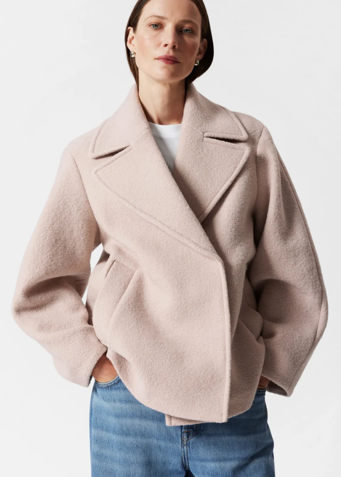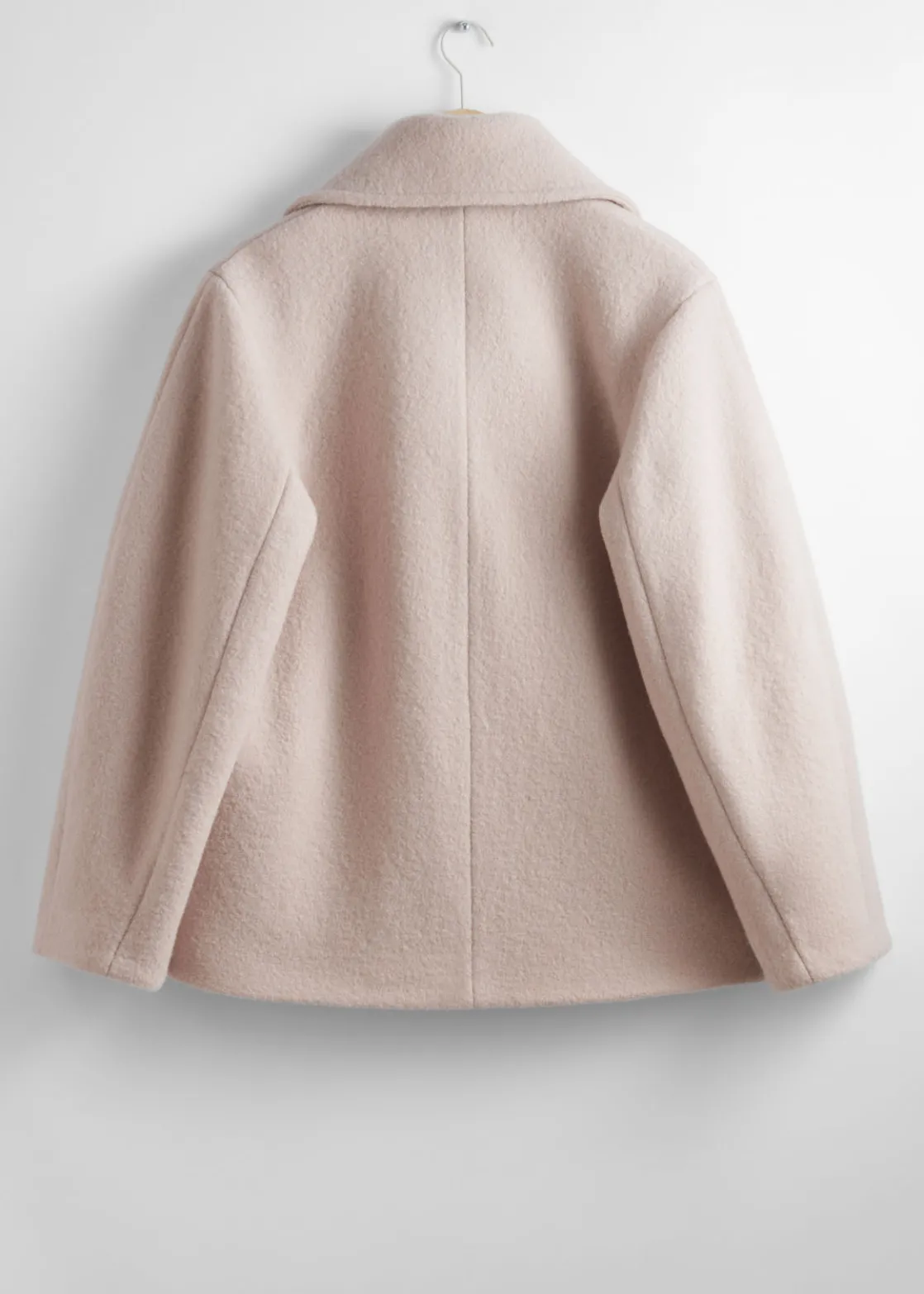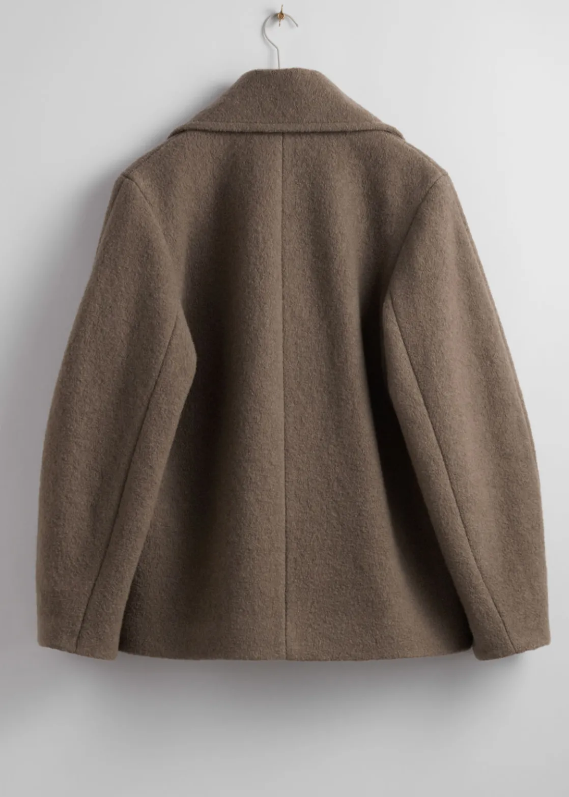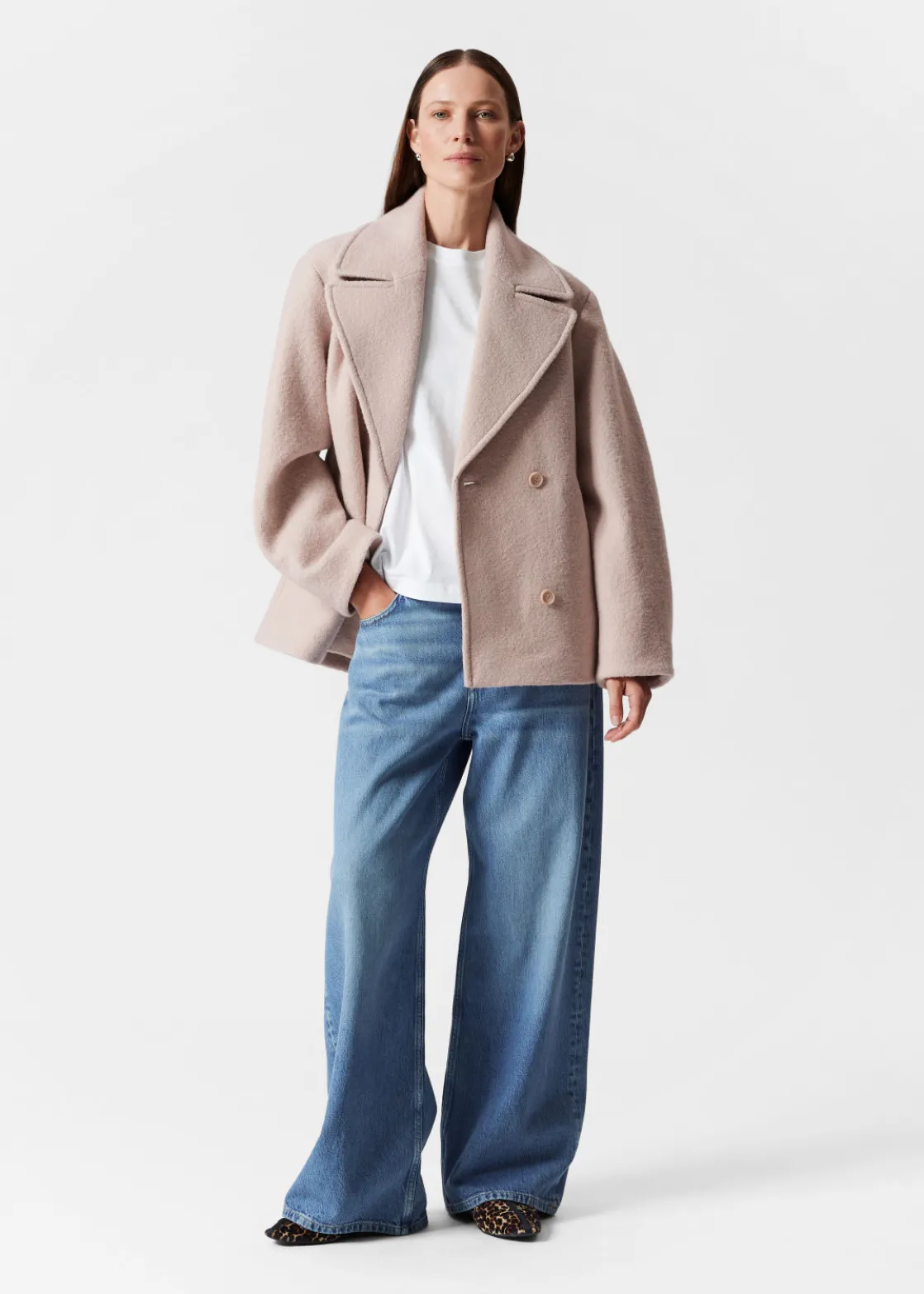 Double-breasted wool jacket designed with a large notched lapel collar and v-cut neckline.