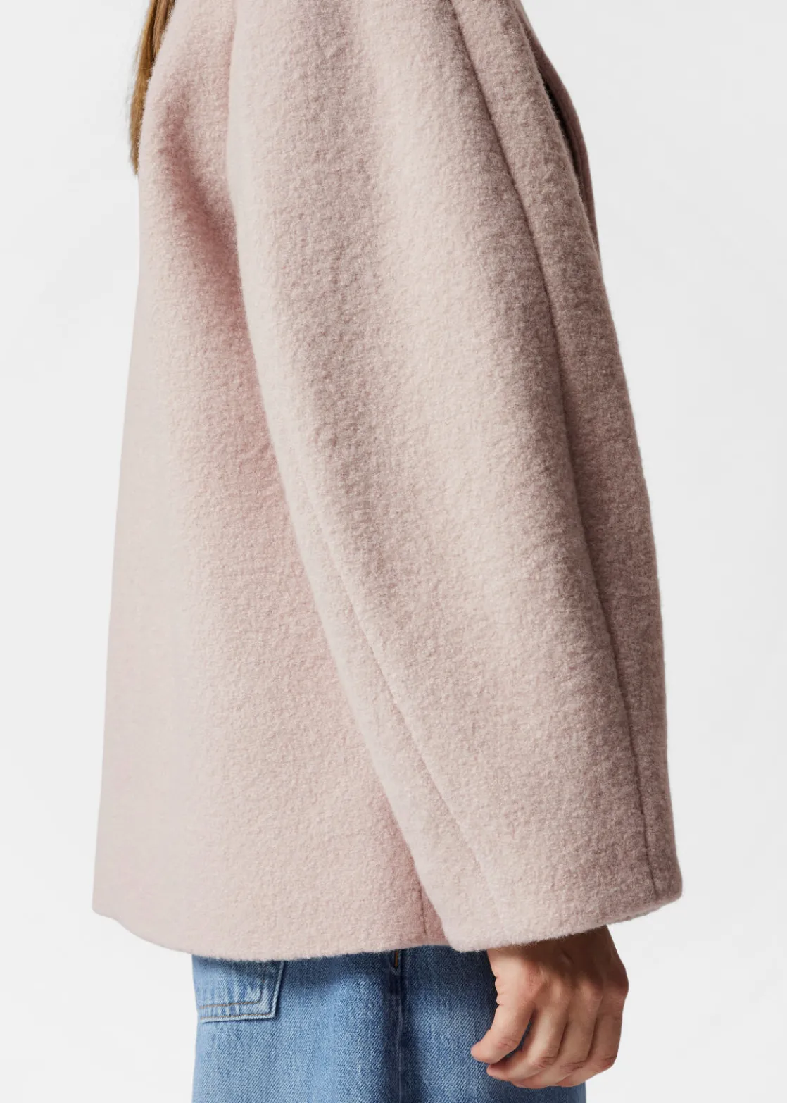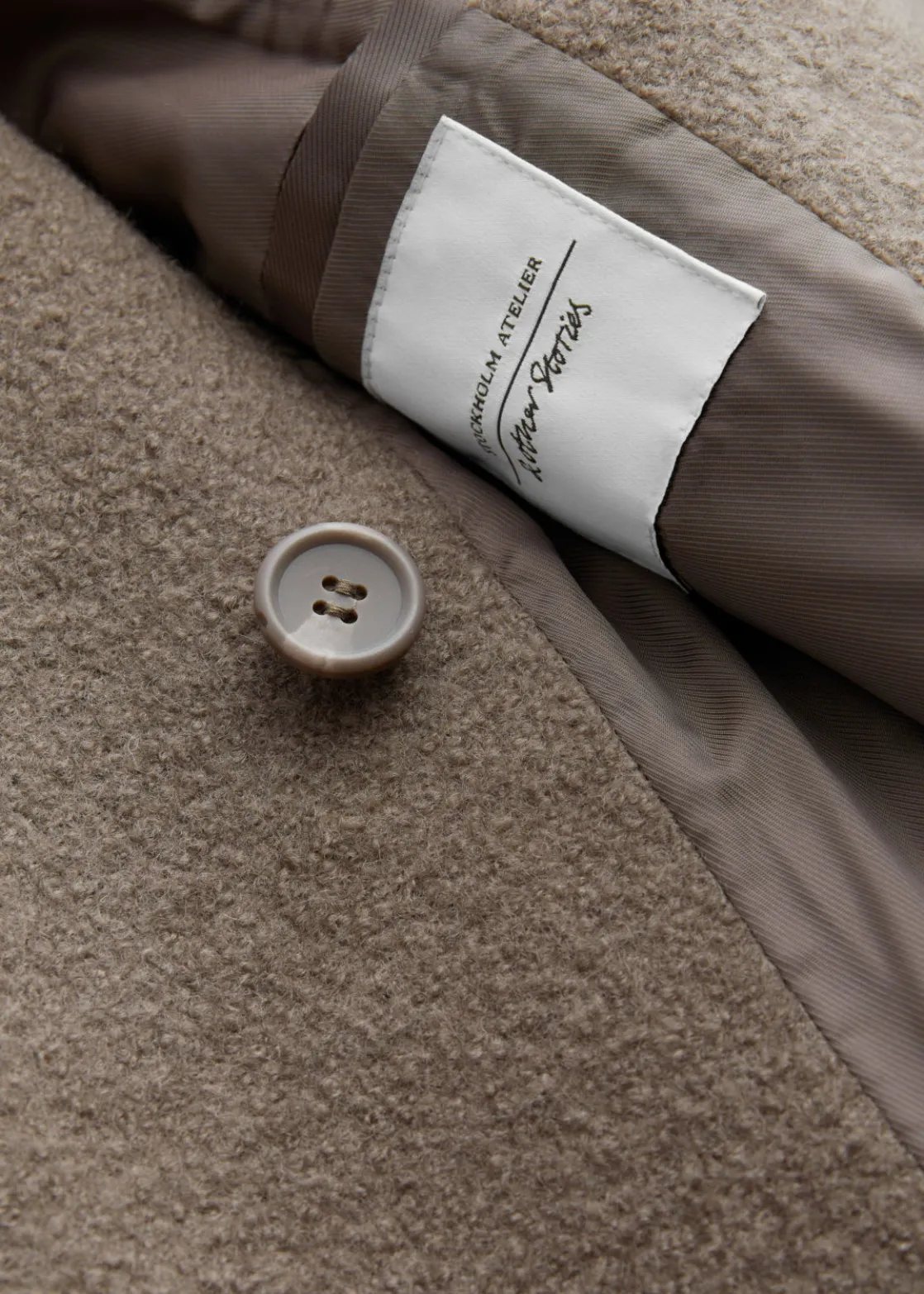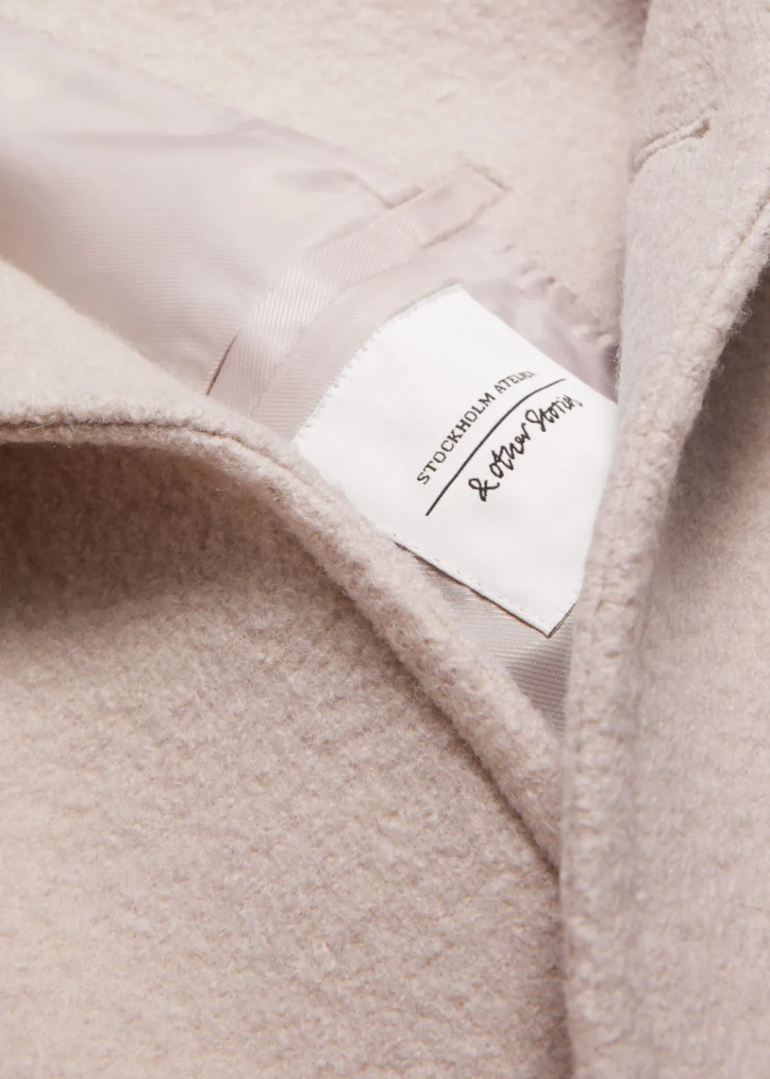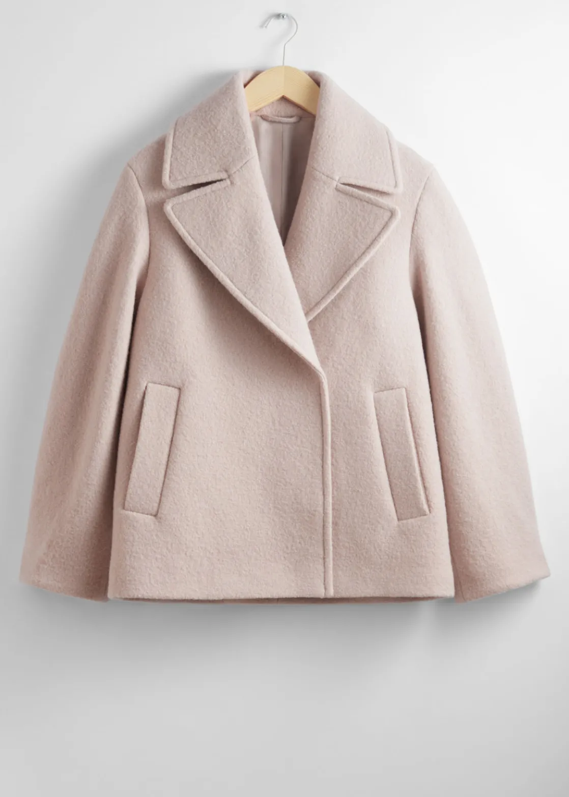 Double-breasted wool jacket designed with a large notched lapel collar and v-cut neckline.