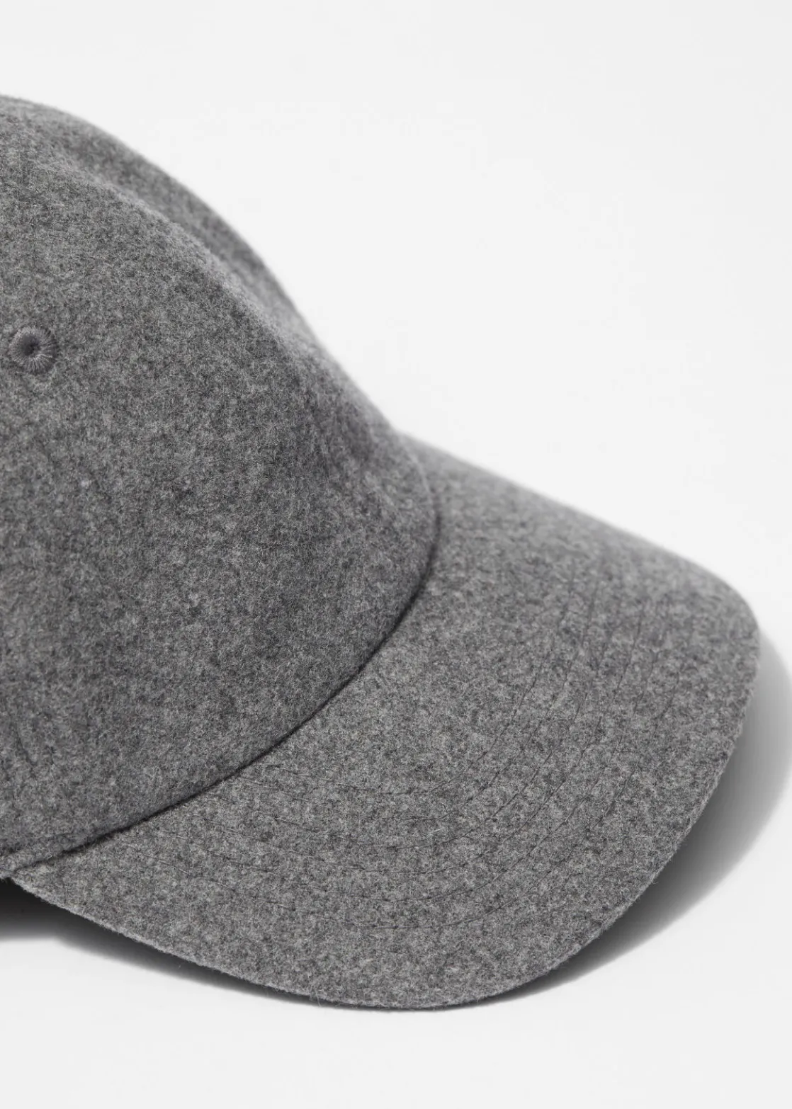 Baseball cap made from a plush wool-felt, with a classic curved brim and paneled design. Slider buckle at the back and topstitch detailing.