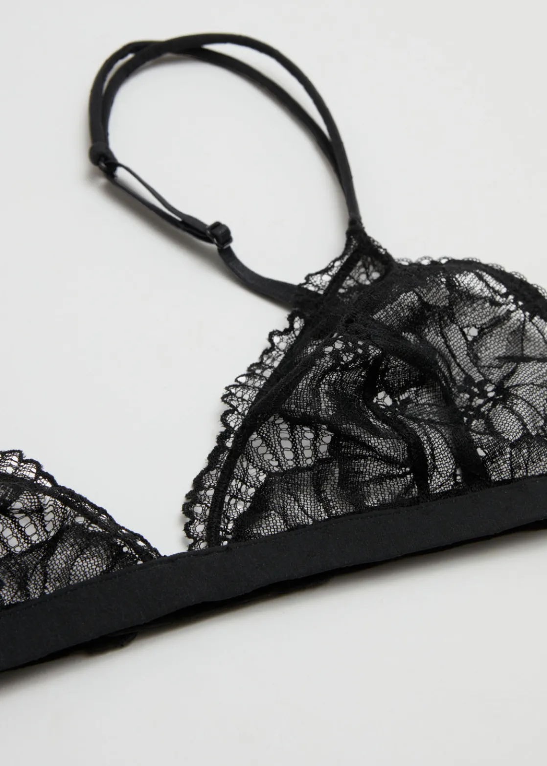 Triangle soft bra cut from soft fancy elastic floral lace adorned with scalloped lace-trimming. Finished with adjustable shoulder straps and back hook closure.