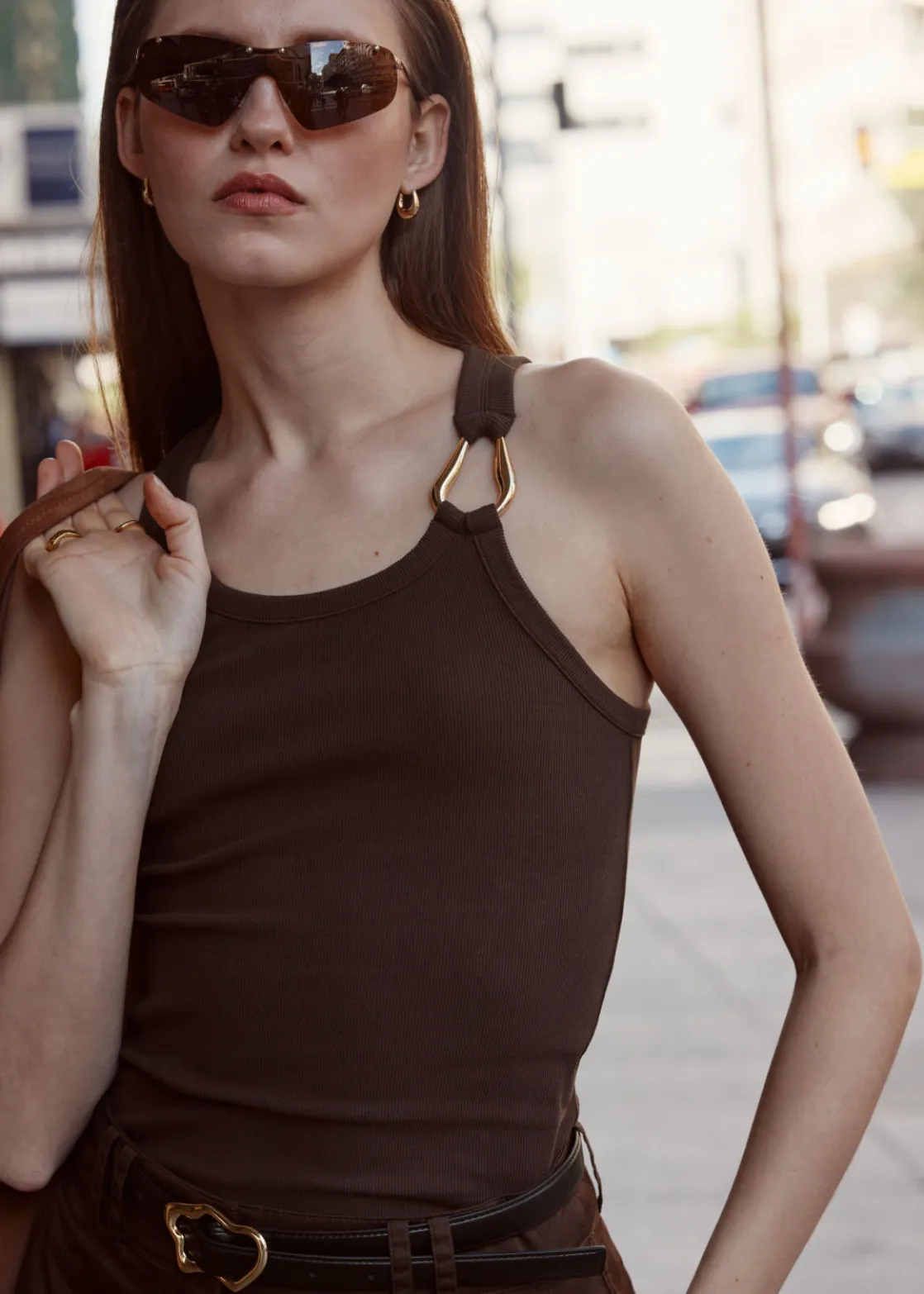 Tank top defined by a gold-toned metal buckle at the shoulder.