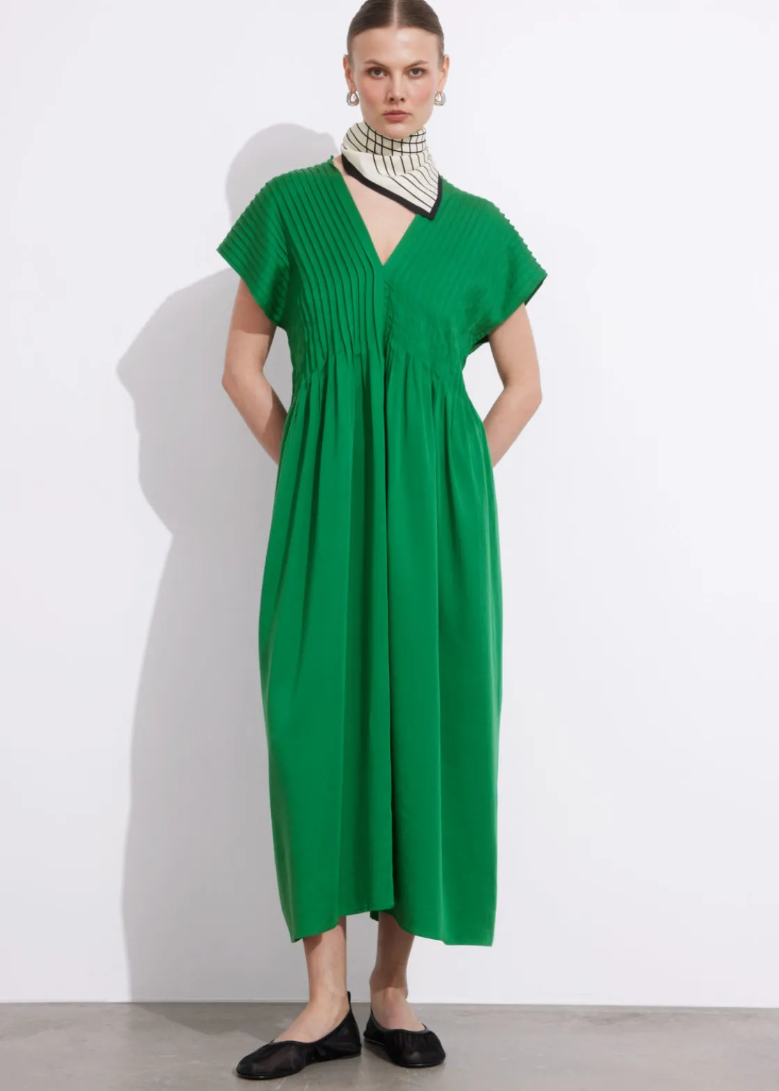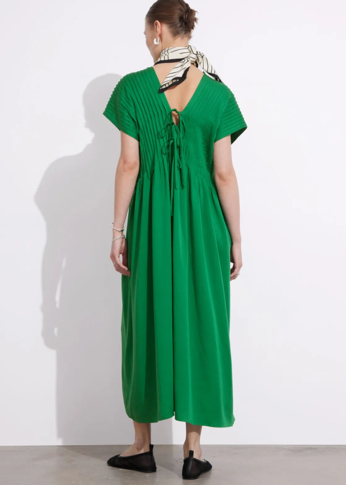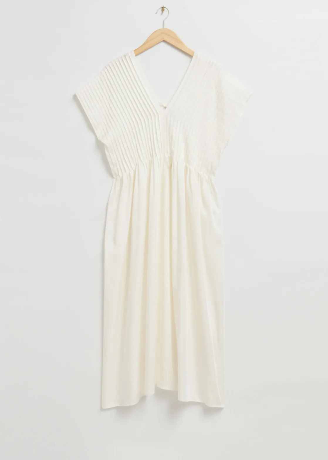 Midi dress designed with pleated detailing, a v-cut neckline and short sleeves. Secured at the back with thin ties.