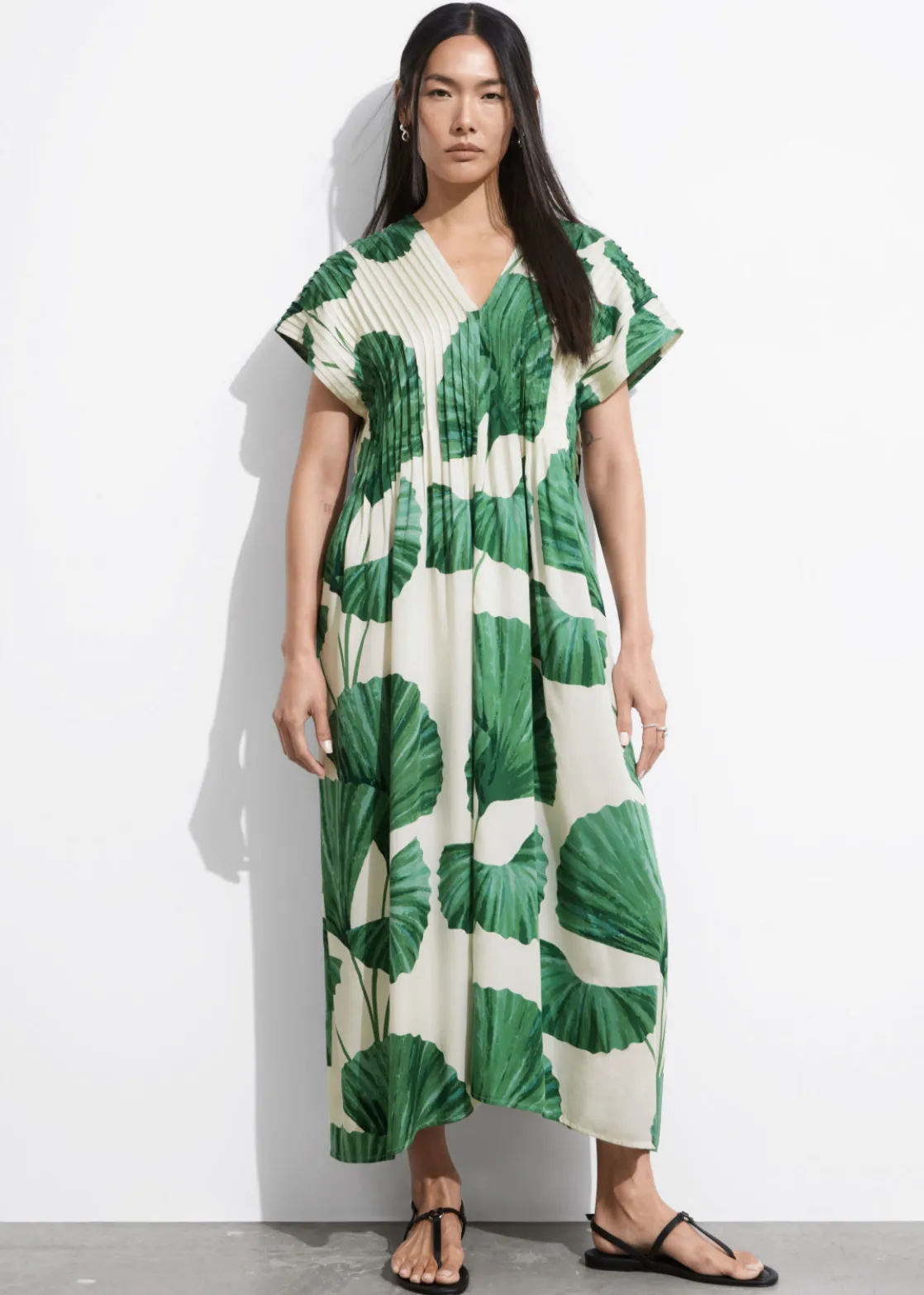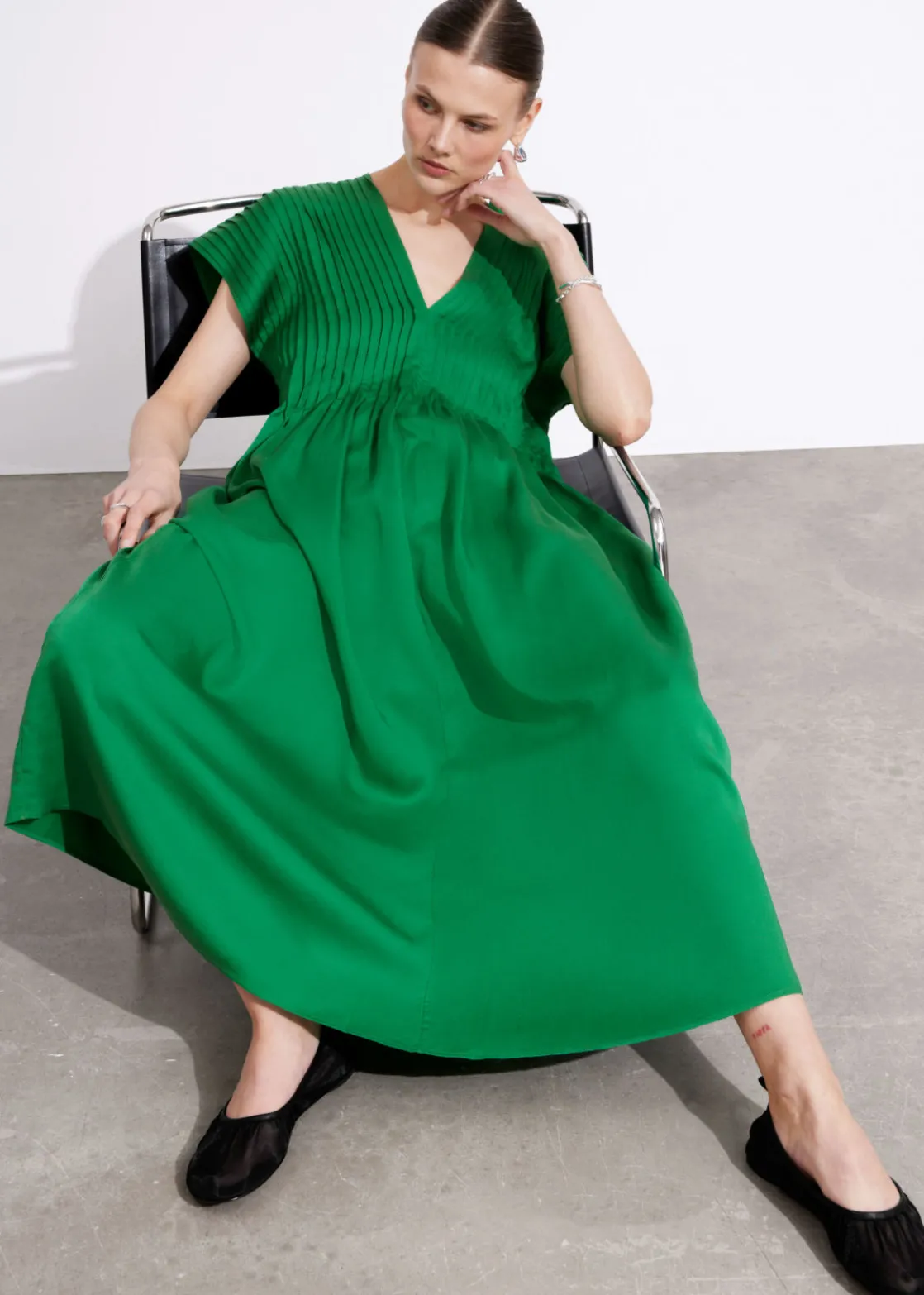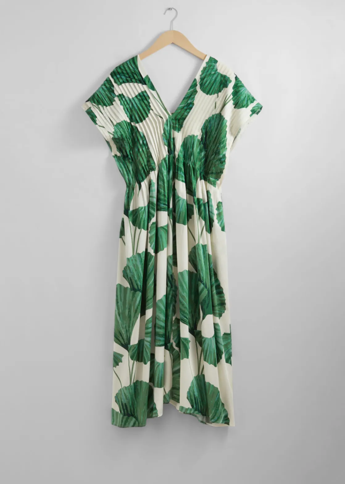 Midi dress designed with pleated detailing, a v-cut neckline and short sleeves. Secured at the back with thin ties.