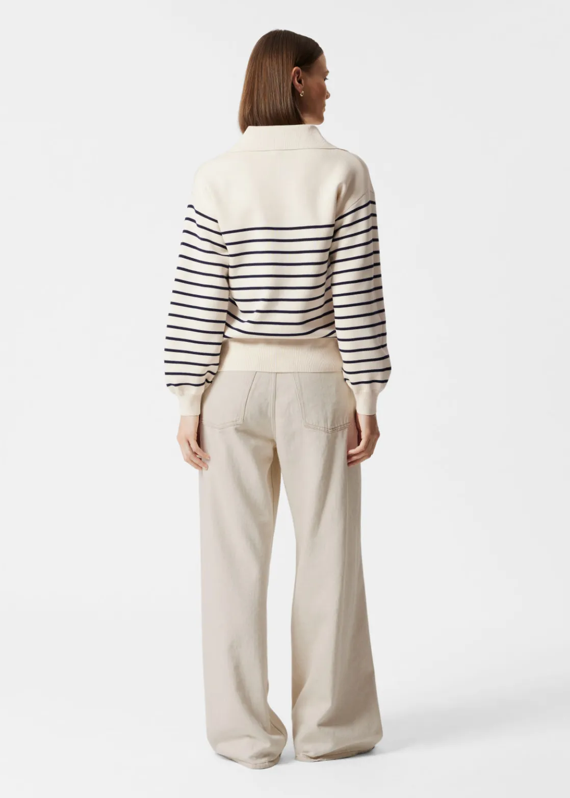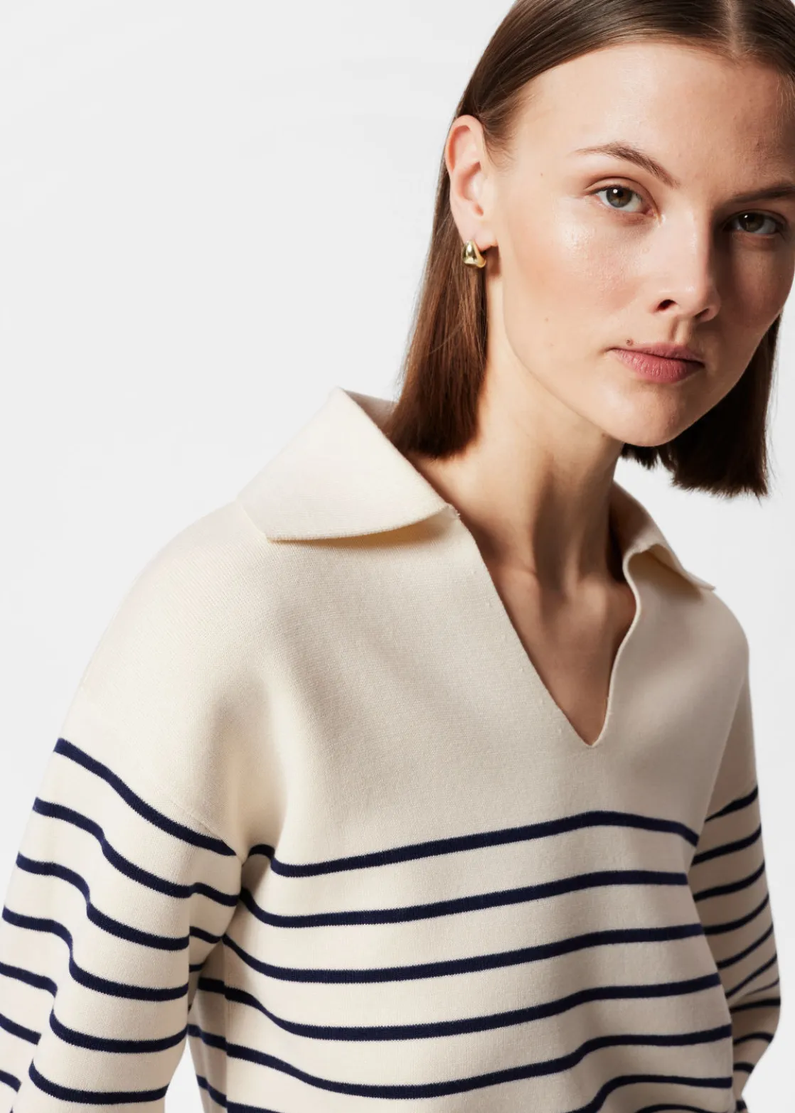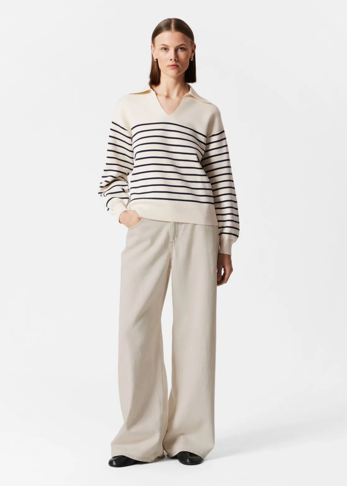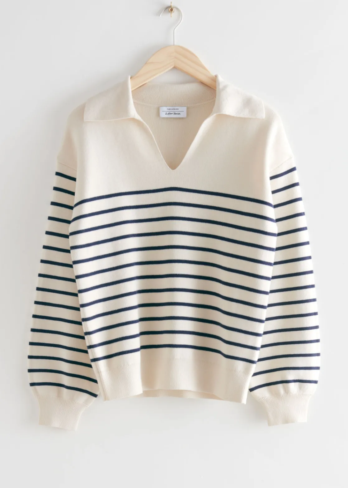 Relaxed collared sweater crafted from a knitted cotton blend. Featuring a turn-down collared, long sleeves. Finished with ribbed cuffs and hemline in a relaxed silhouette.