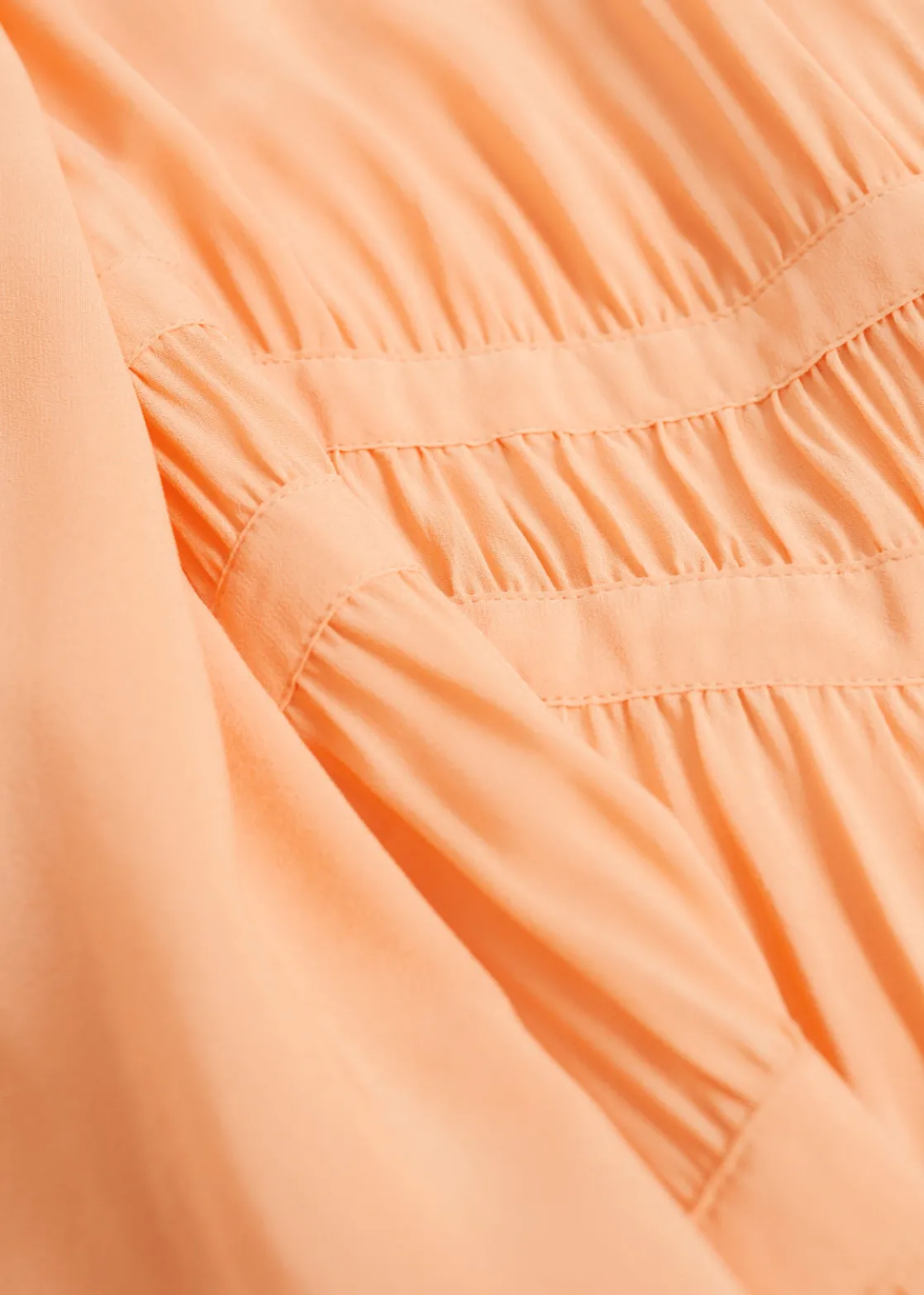 Ruched relaxed-fit asymmetric dress crafted from silk like quality material. Featuring a ruched body with four double-layer banded sections from bust to top of leg finished with an asymmetric hemline, loose three quarter length sleeves, and shank button back closure.