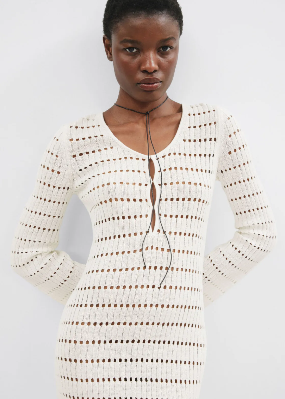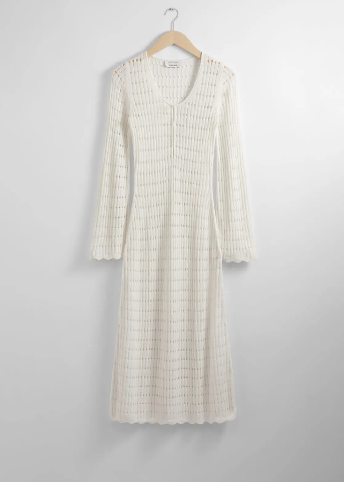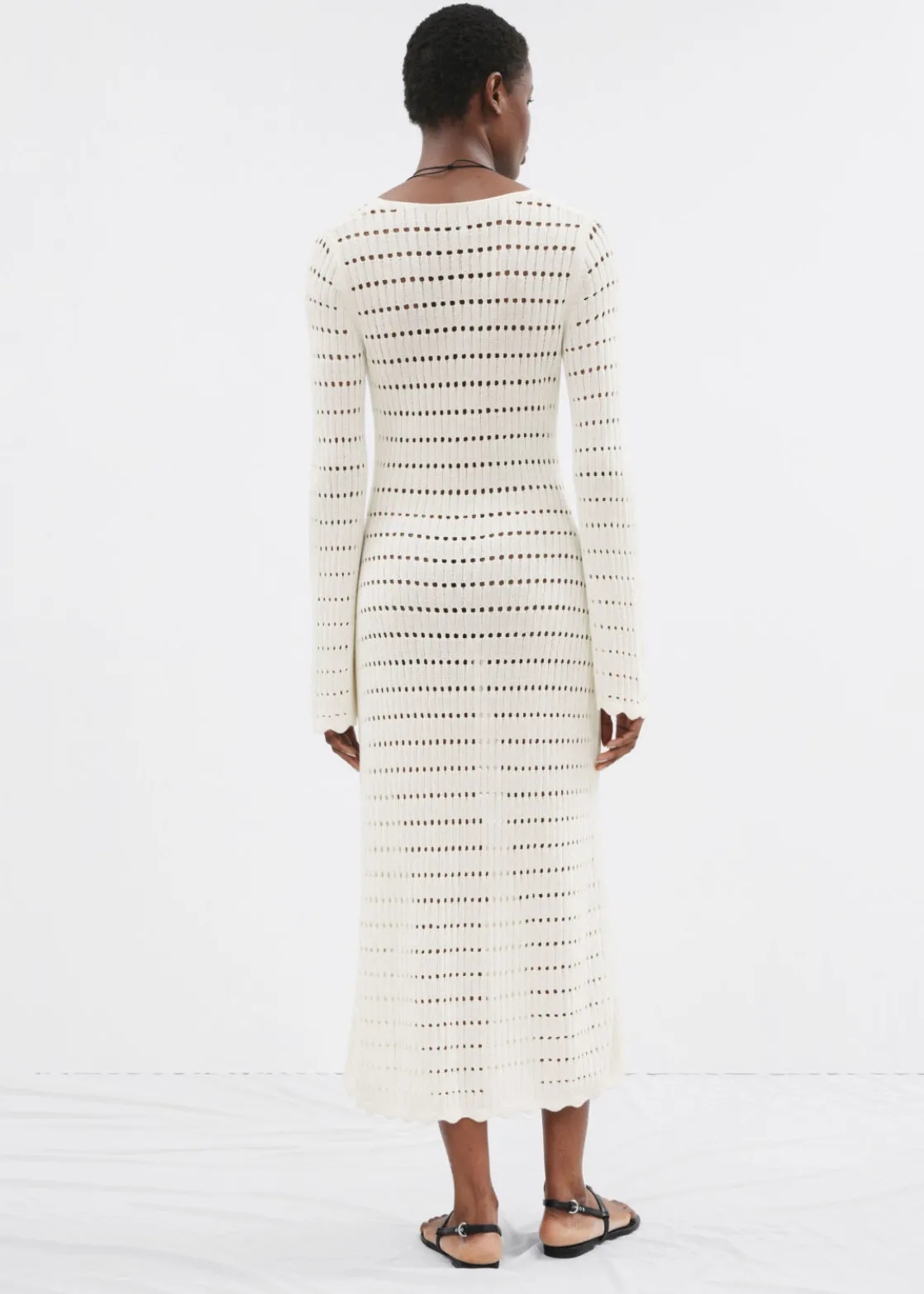 Long-sleeve midi dress featuring an open-knit structure. Detailed with scalloped cuffs and hemline.