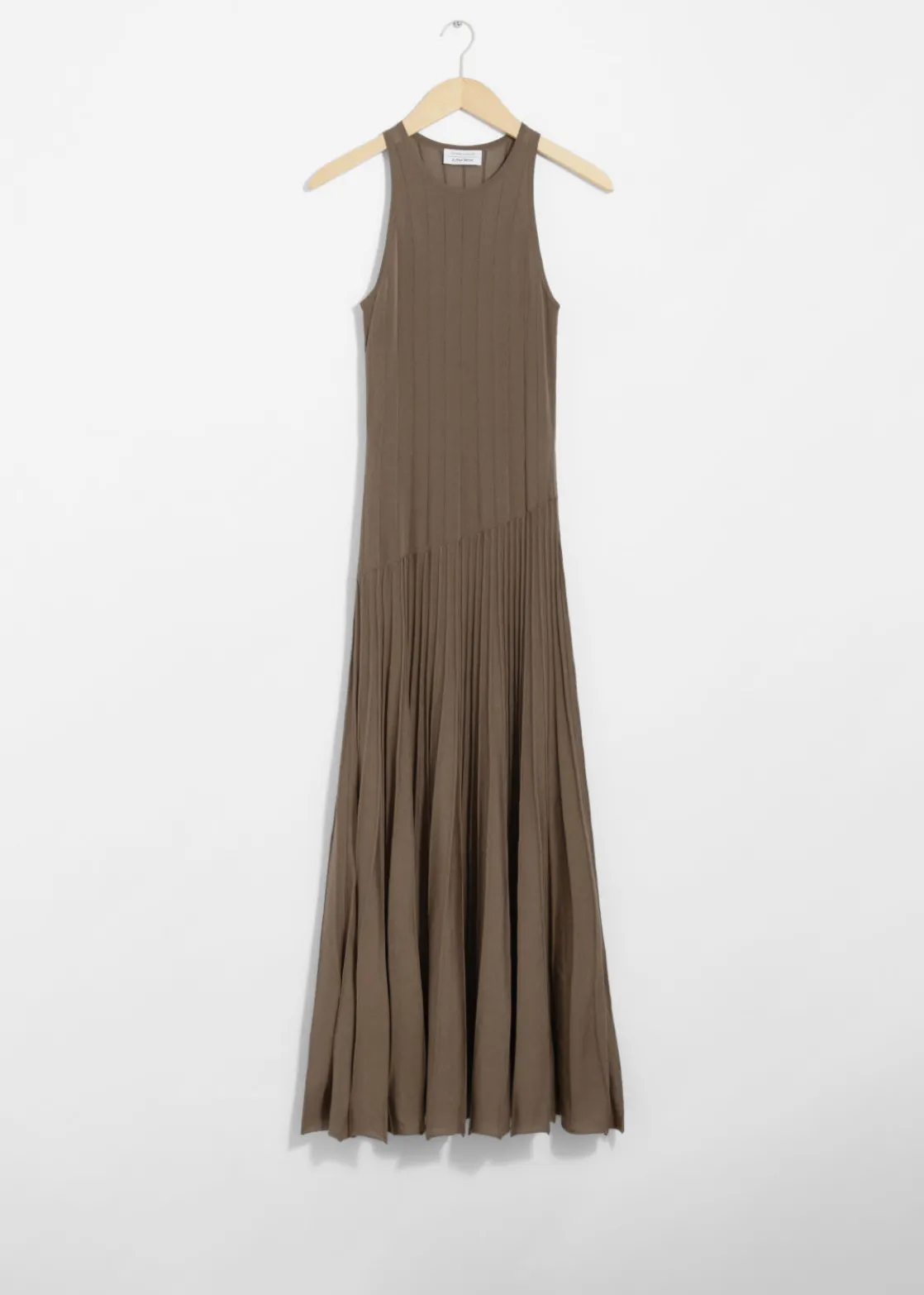 Sleeveless knitted maxi dress with a sheer, pleated finish.