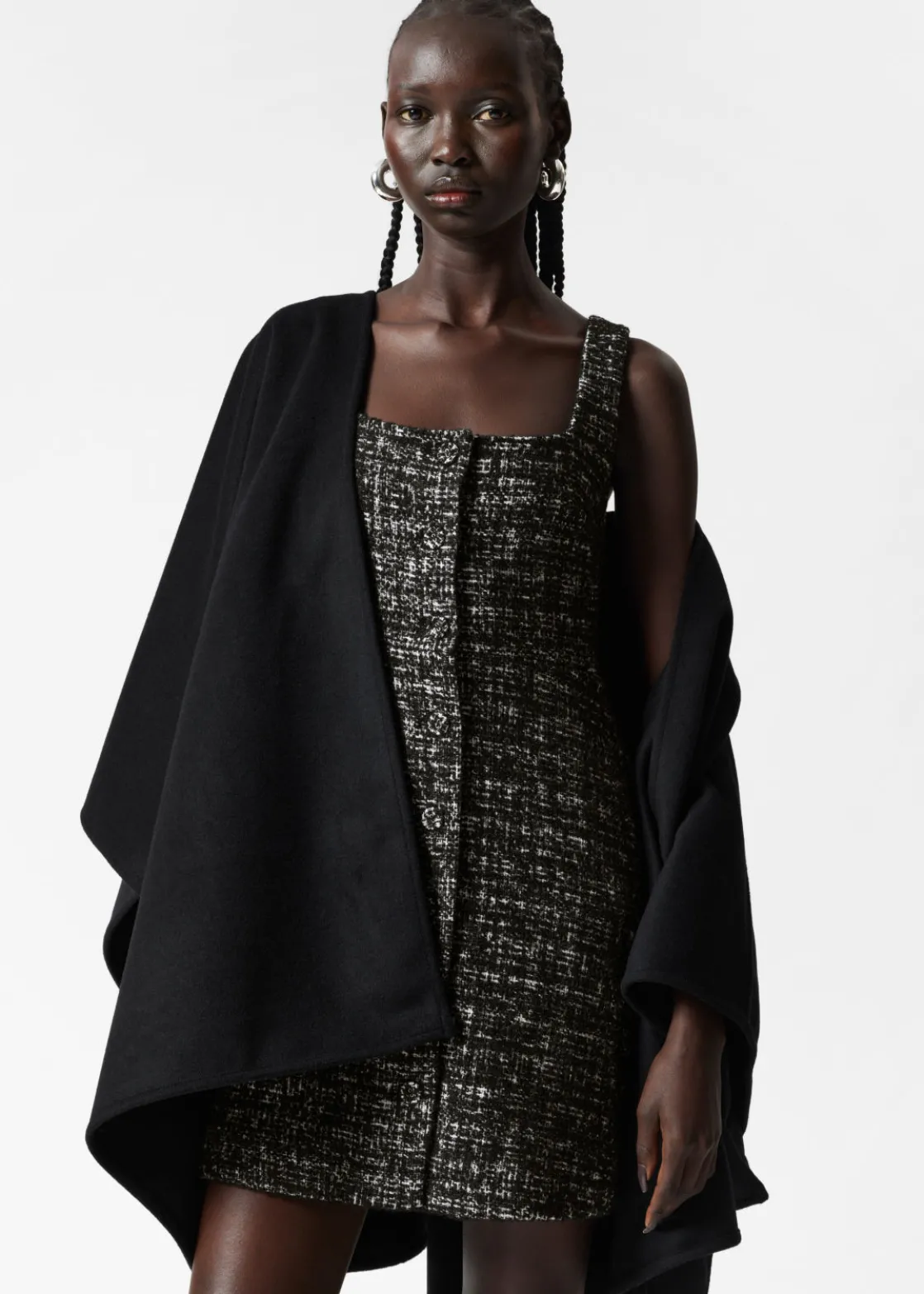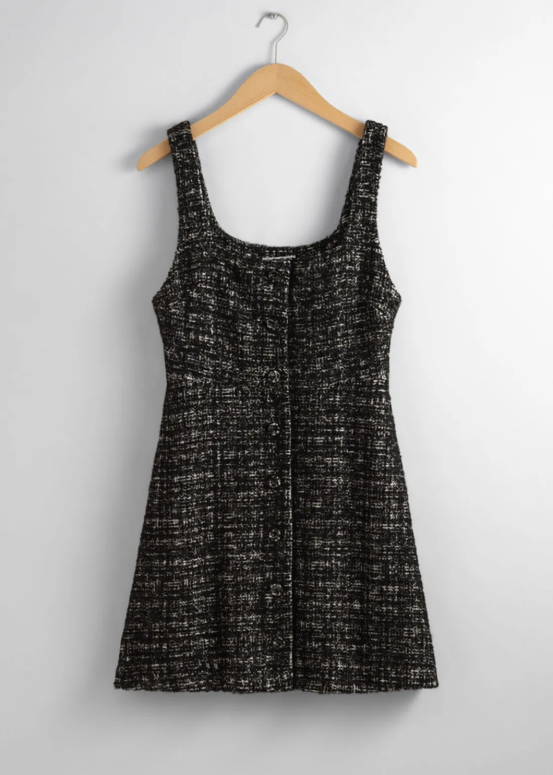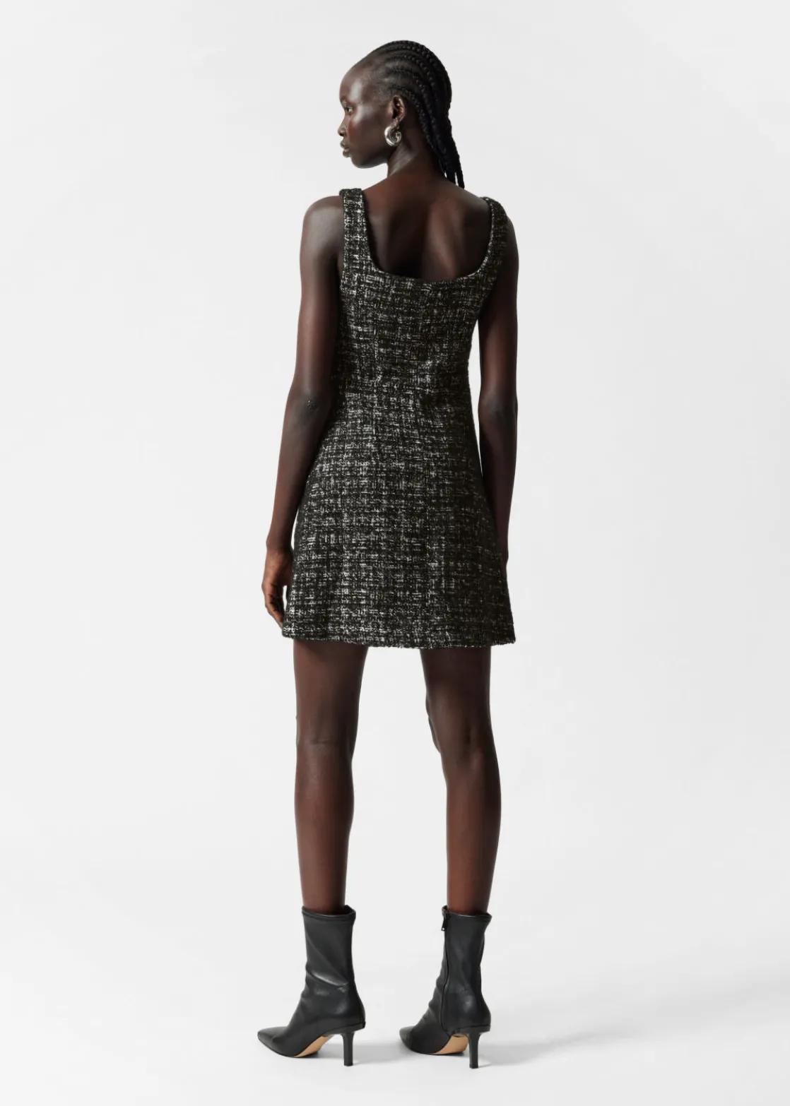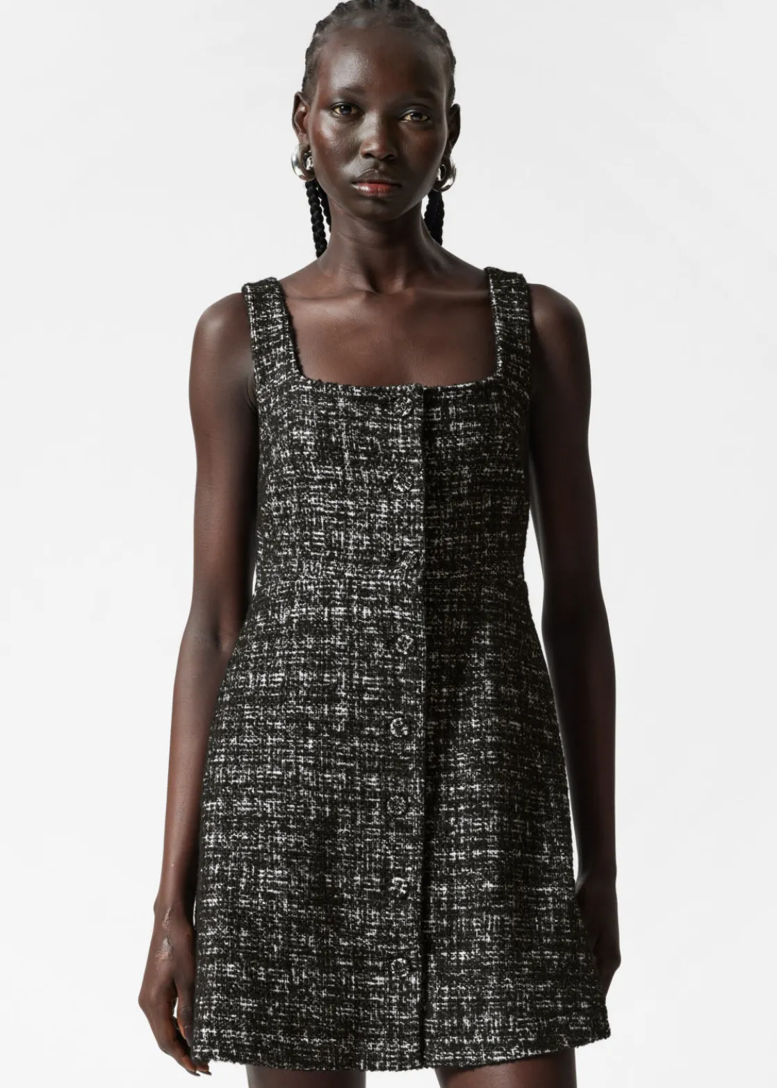 Sleeveless A-line tweed mini dress traced with centre front button closures. Featuring duo side seam pockets.