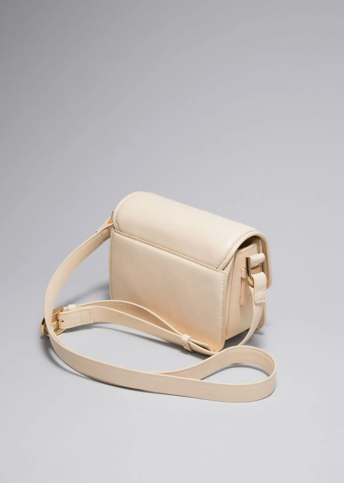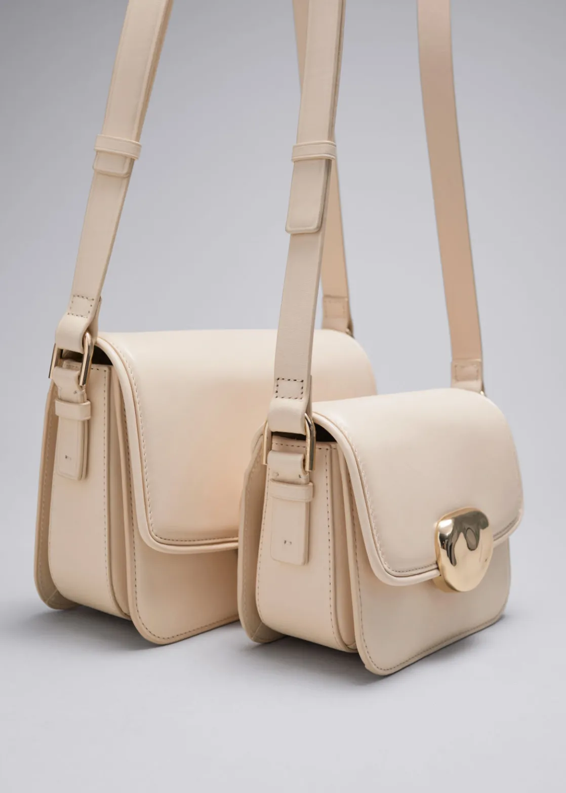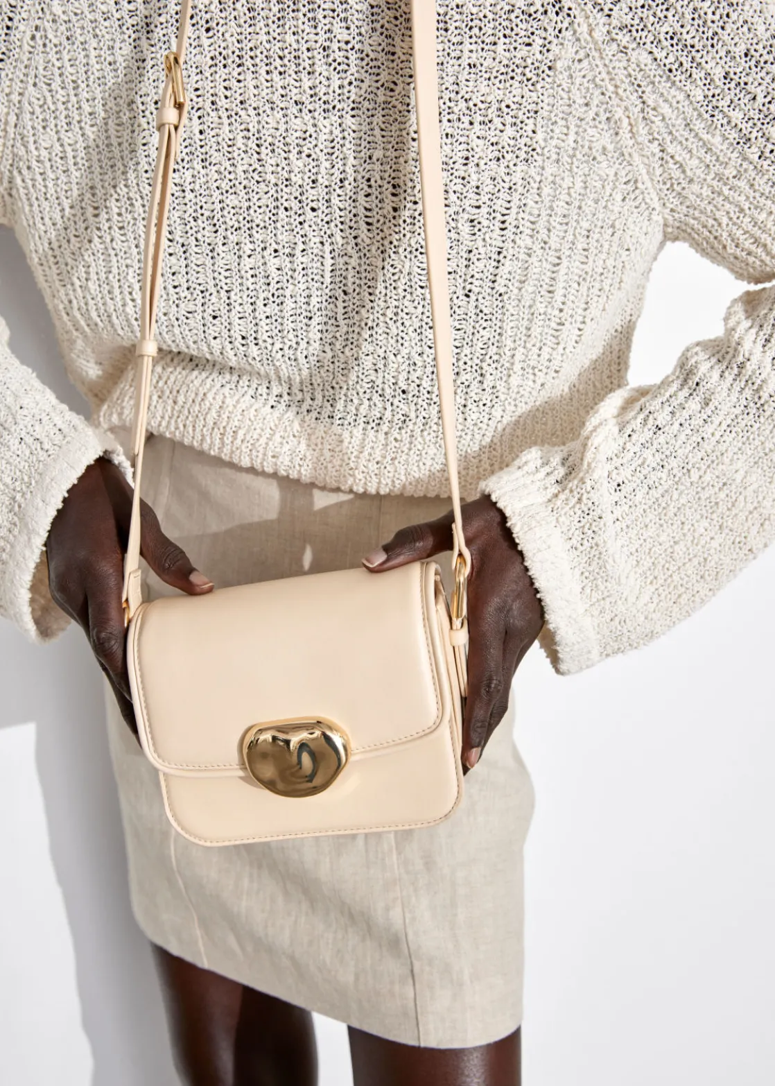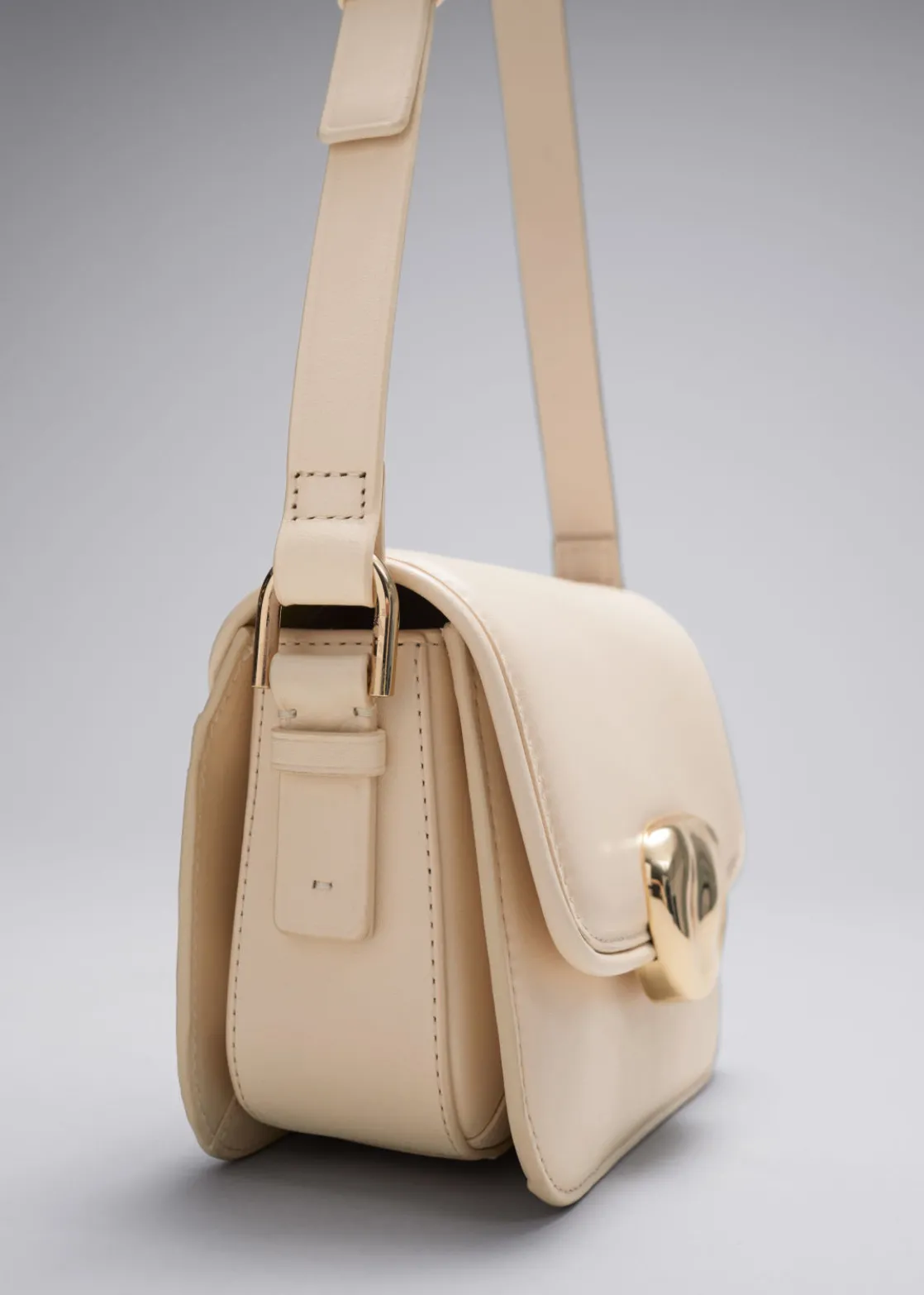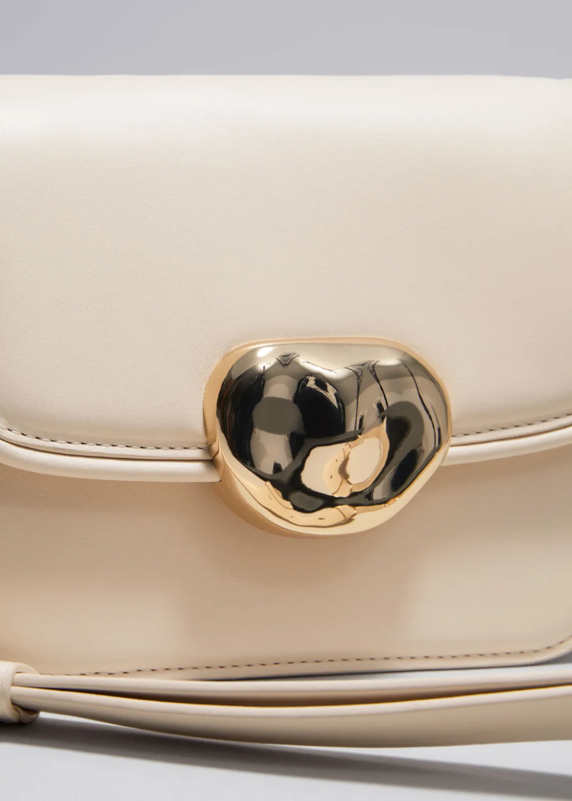 Small crossbody bag crafted from smooth structured leather. Featuring three inner compartments, one of which is zippered. Detailed with a sculptural gold-toned buckle closure and adjustable shoulder strap.