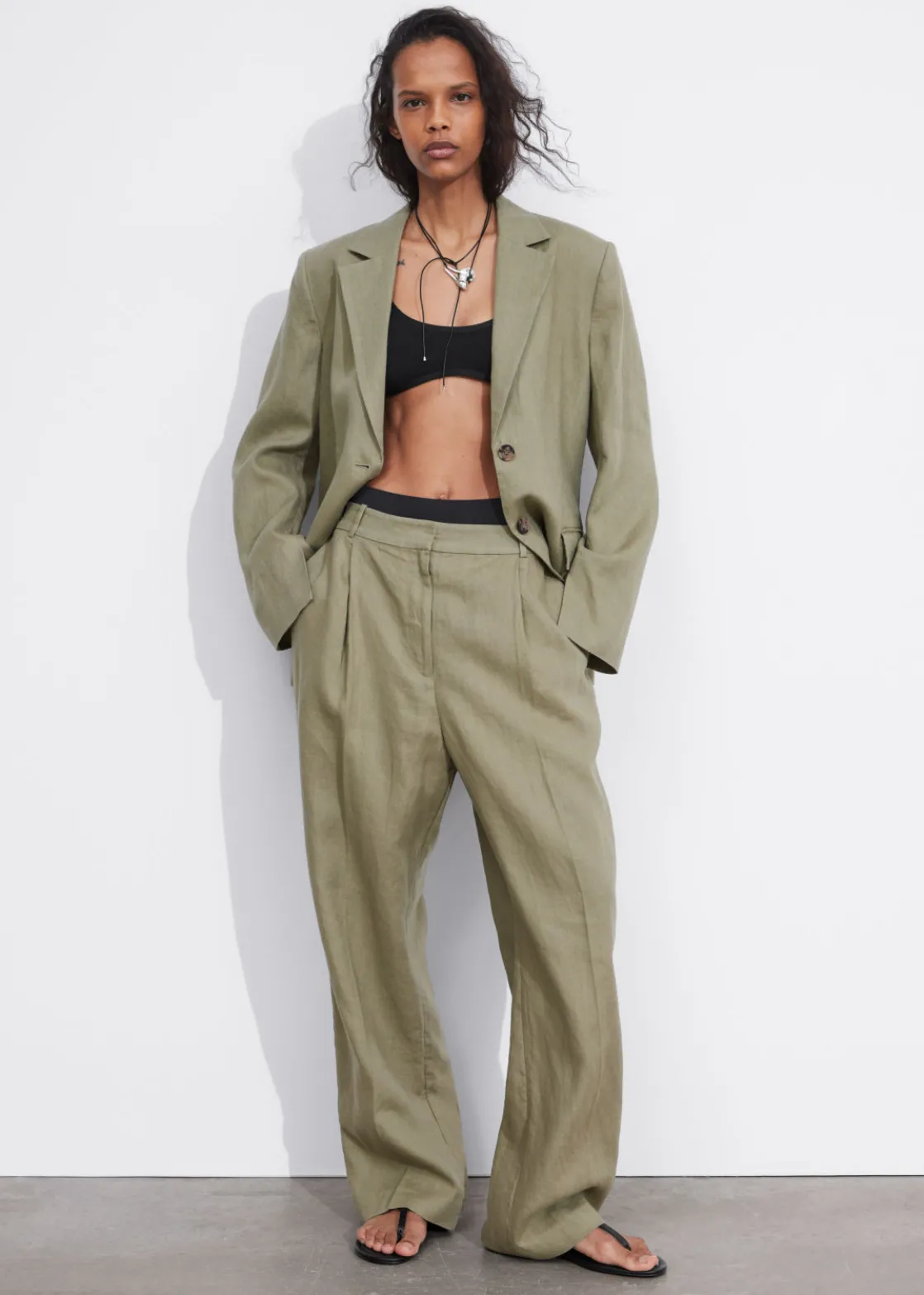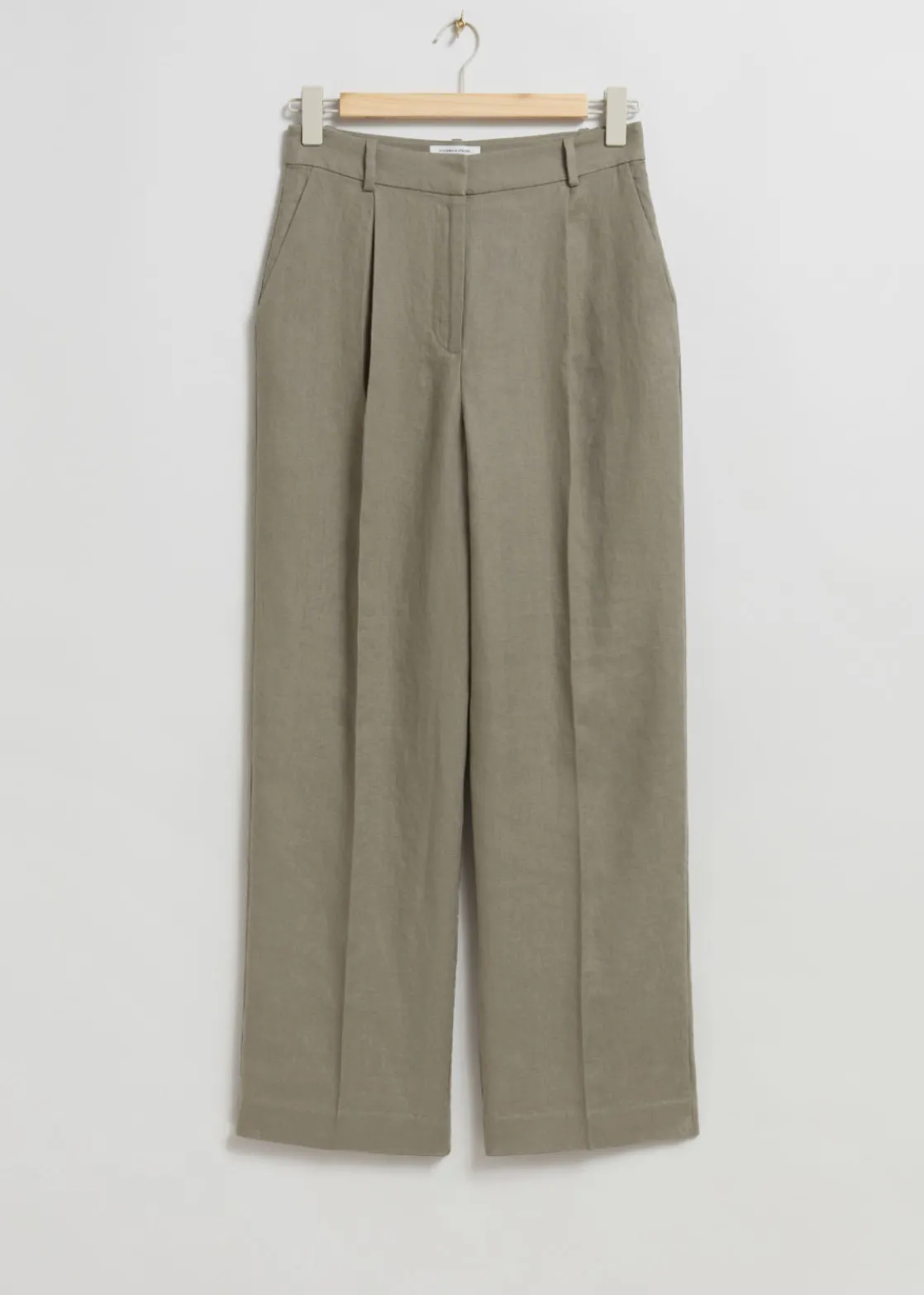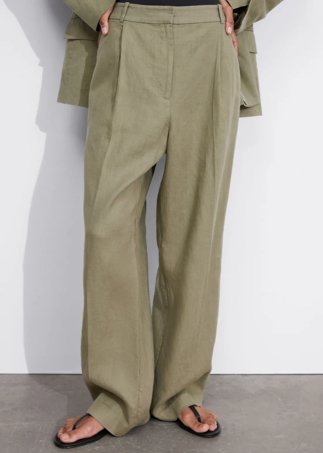 Wide high-waist trousers crafted from linen. Finished with centre front pleats.