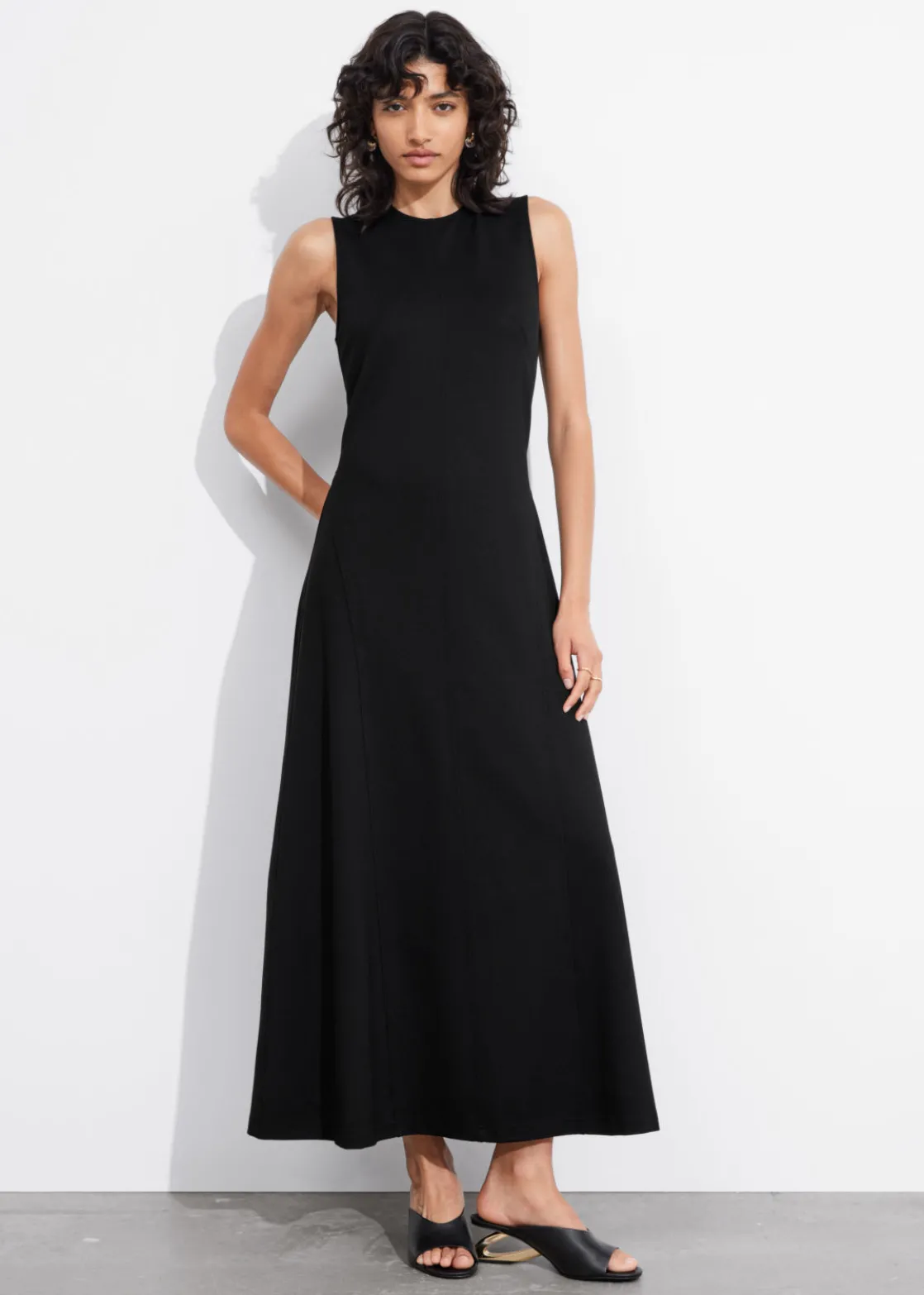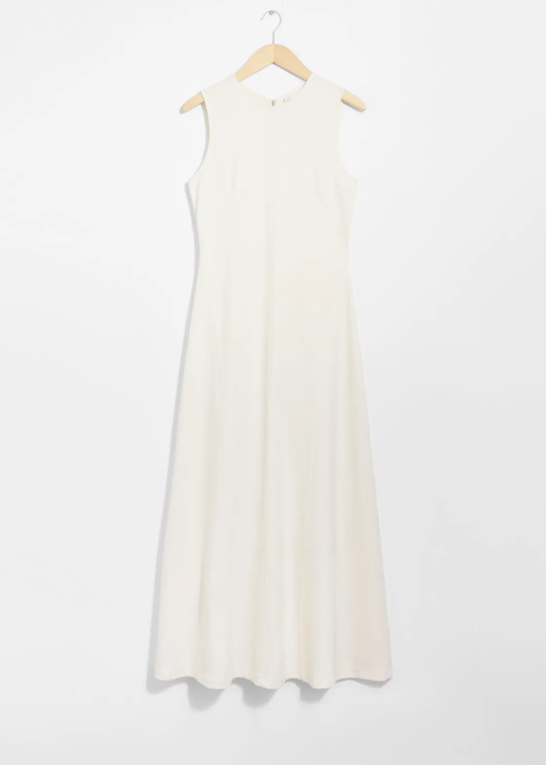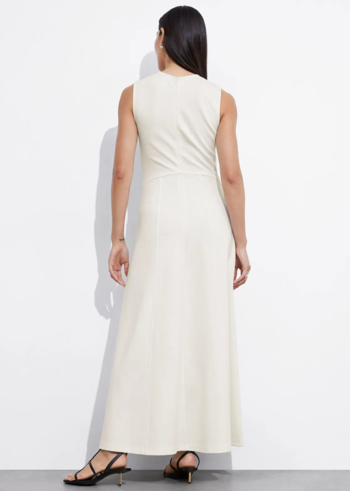 Sleeveless A-line maxi dress finished with vertical cutlines.