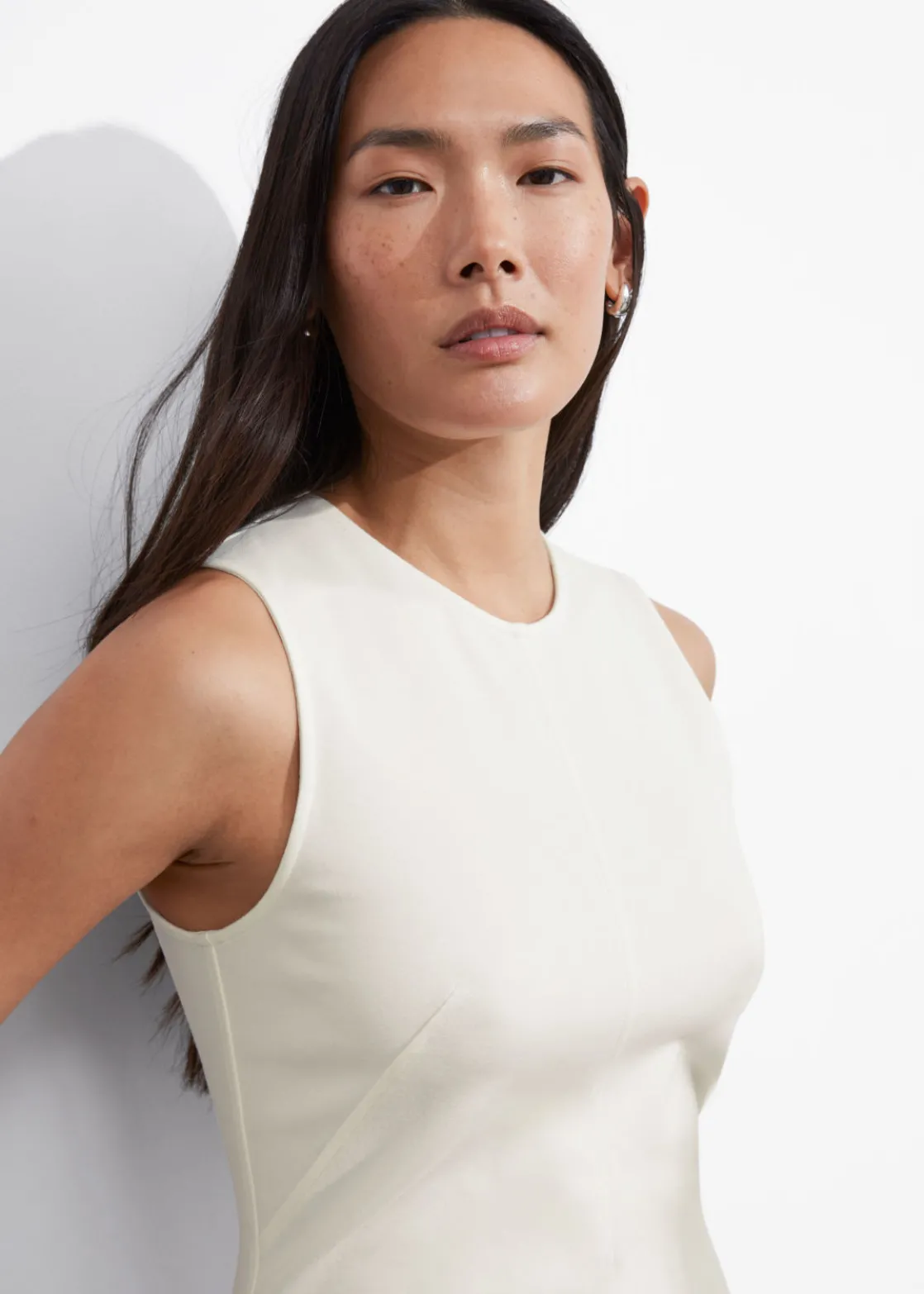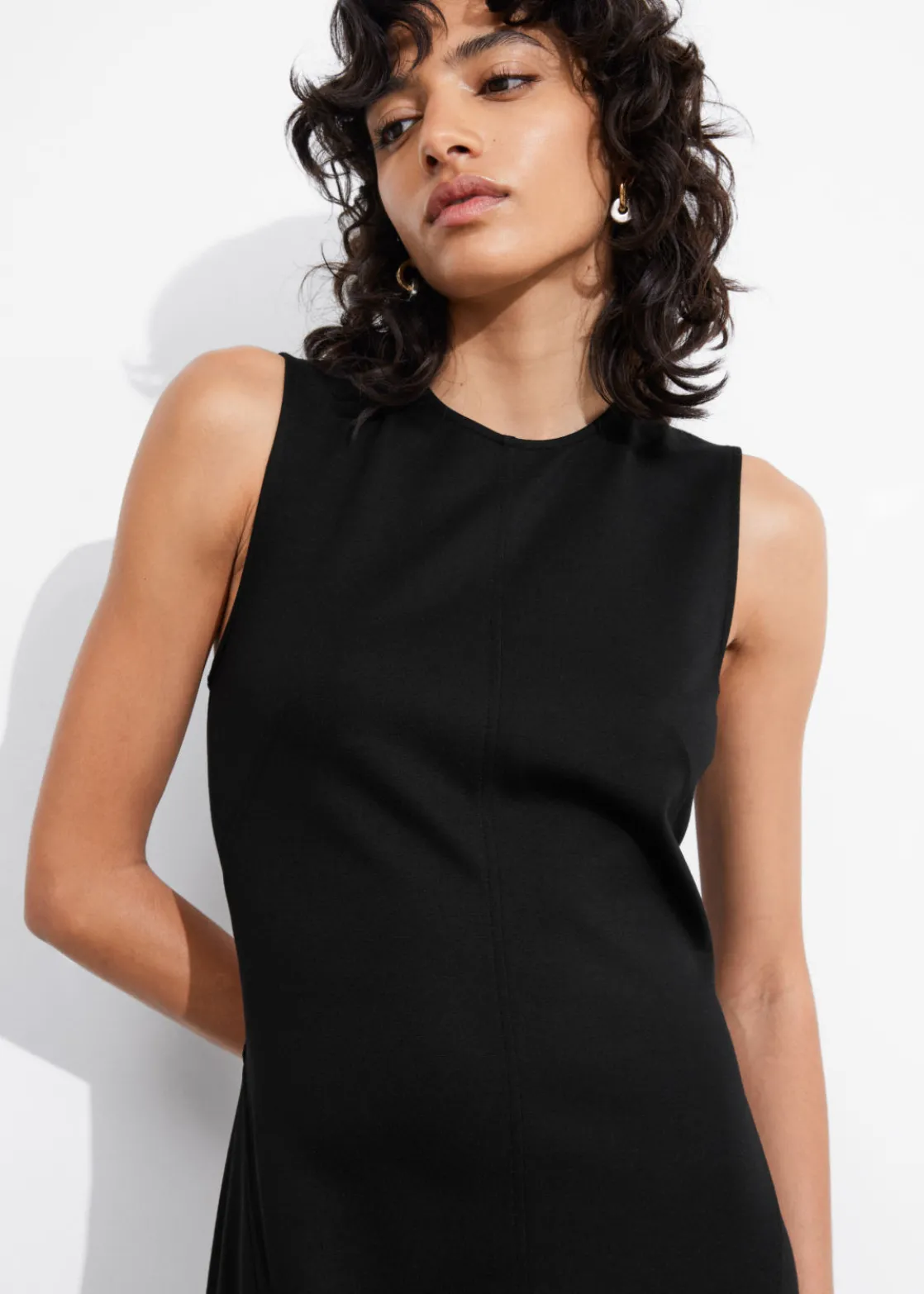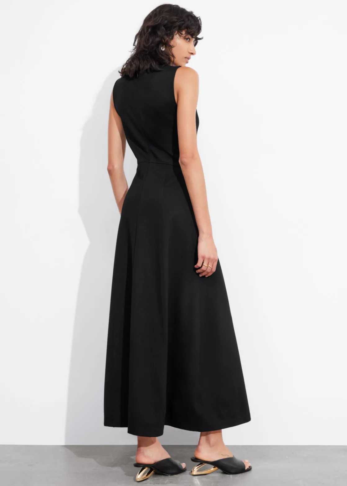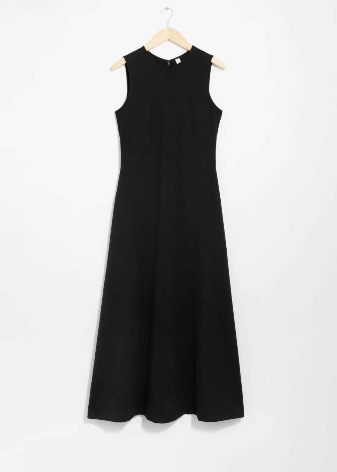Sleeveless A-line maxi dress finished with vertical cutlines.