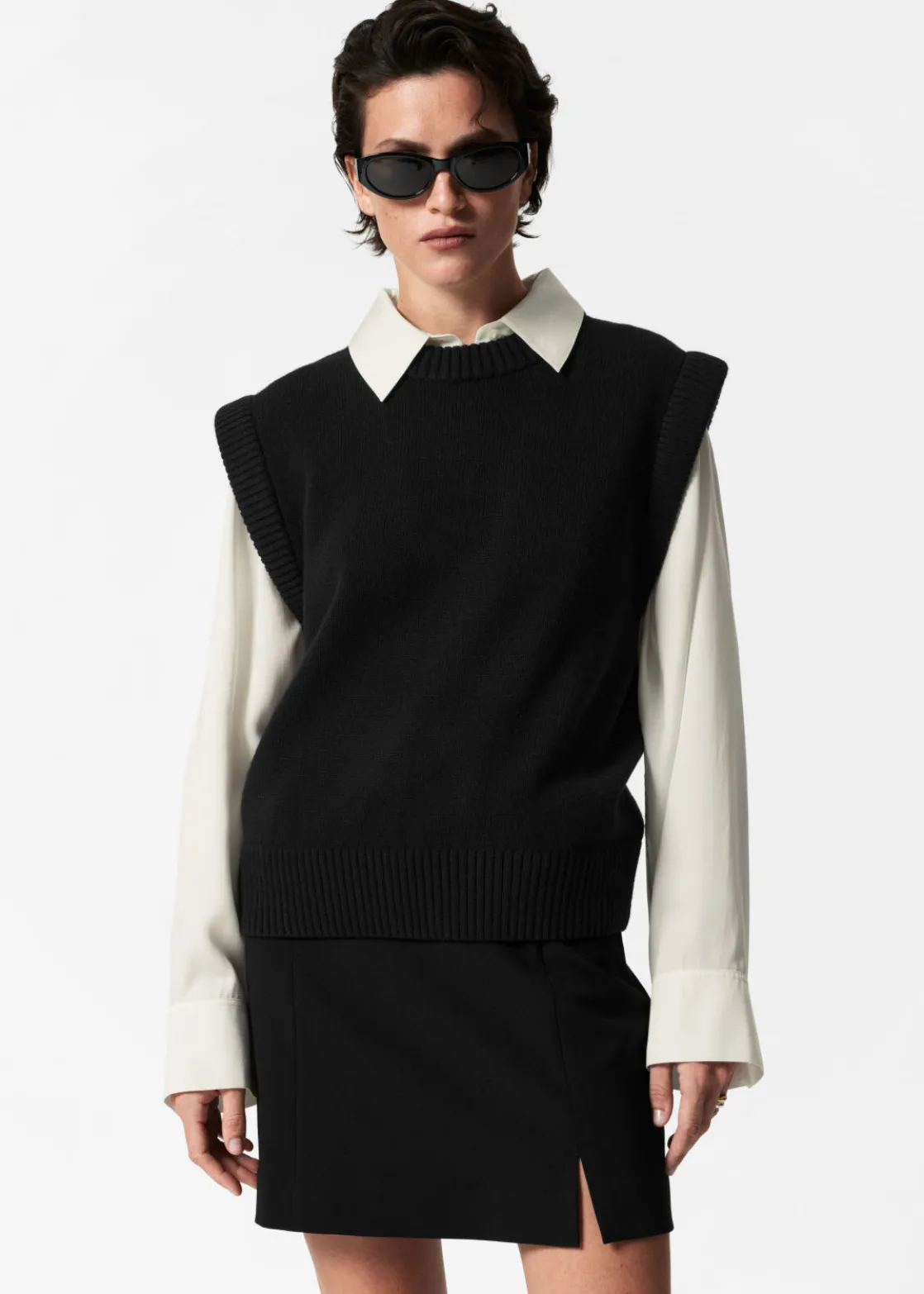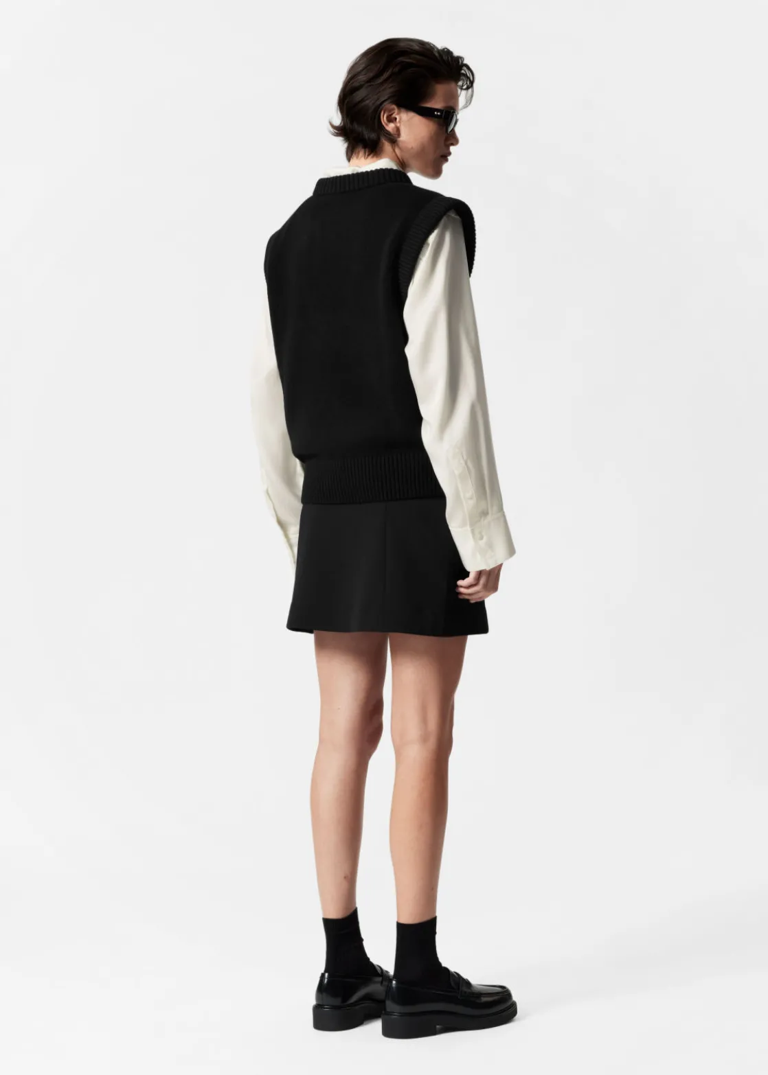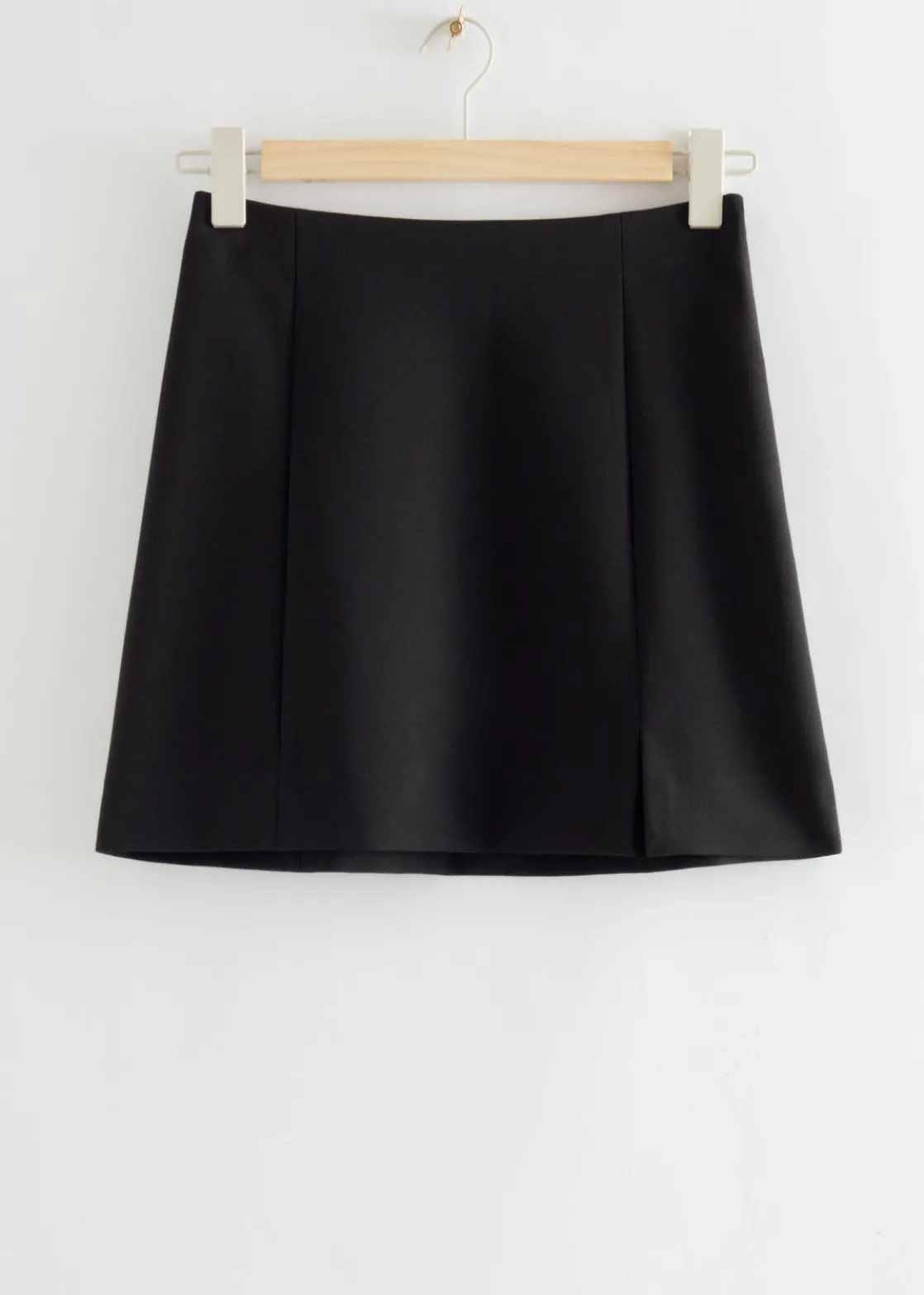 ’90s inspired A-line mini skirt detailed with cutlines and a slit.