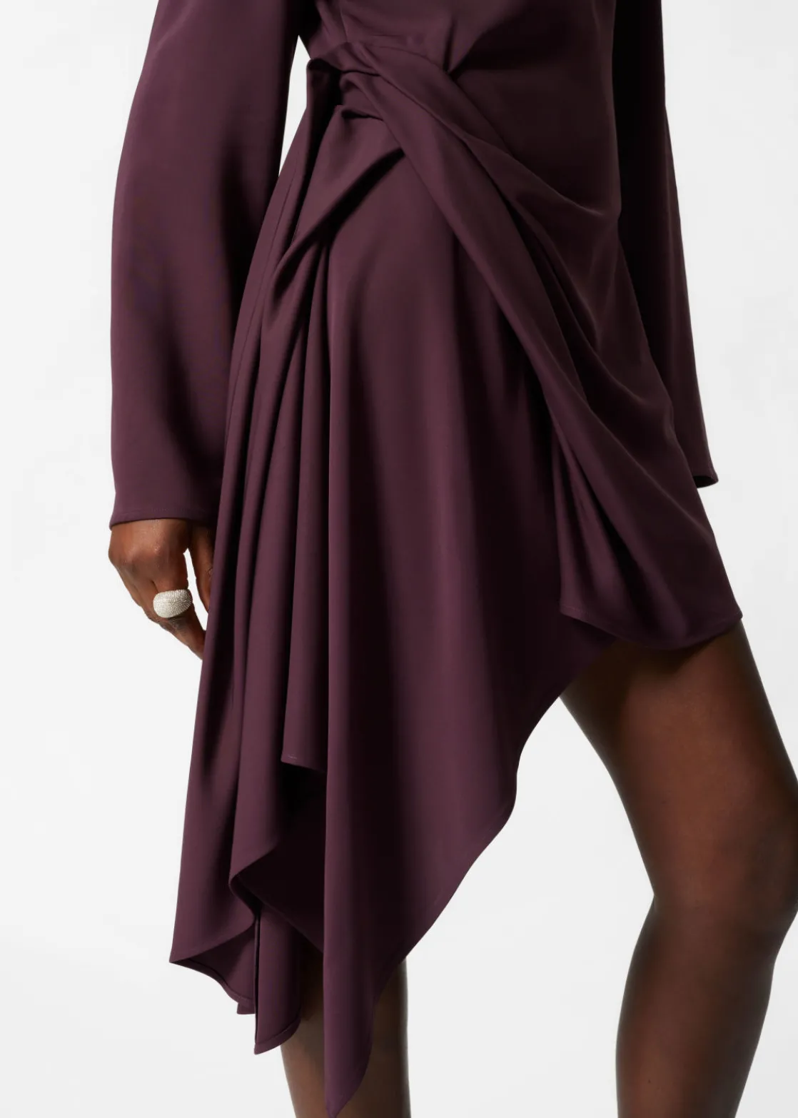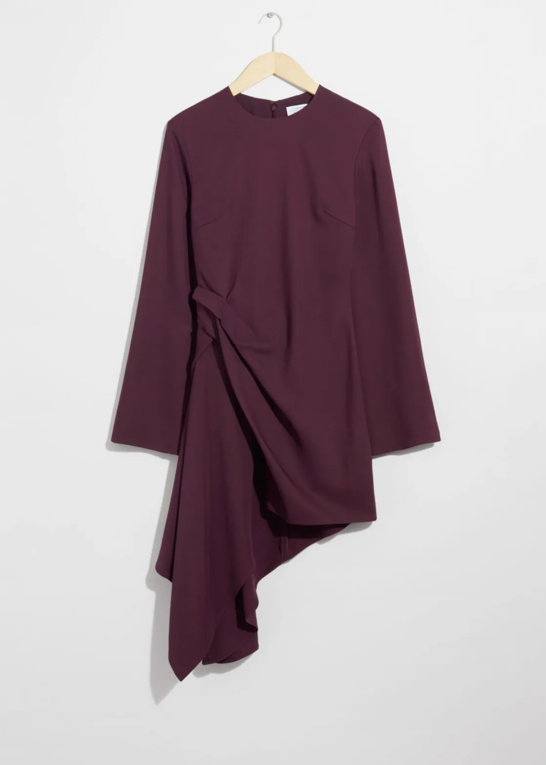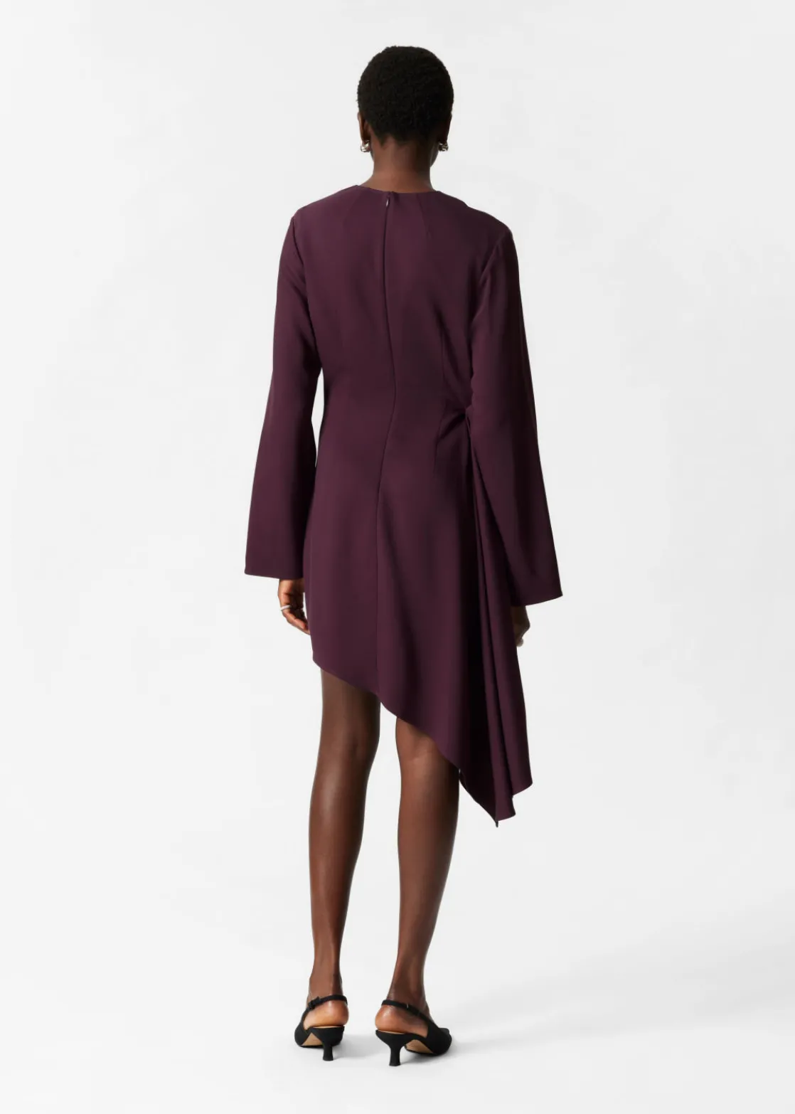 Long-sleeve mini dress featuring pleated detailing at the side, creating an asymmetric hemline.