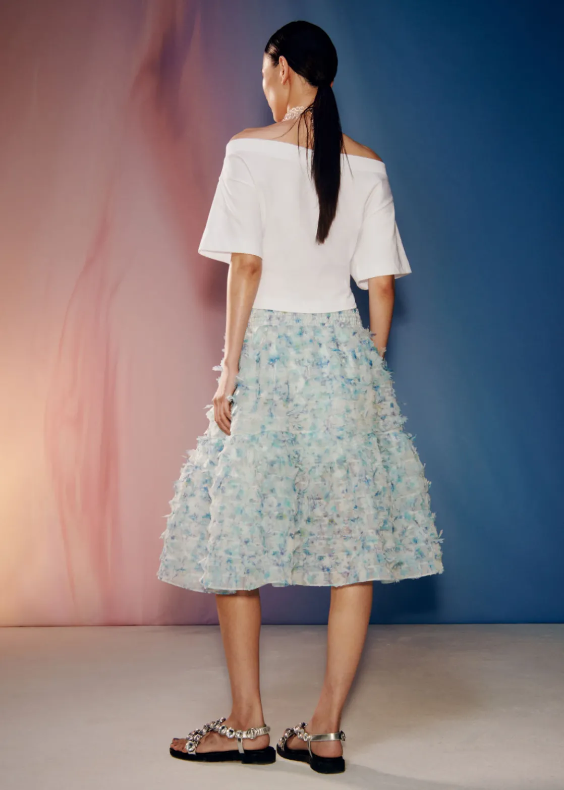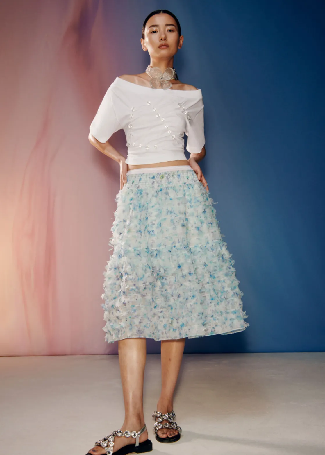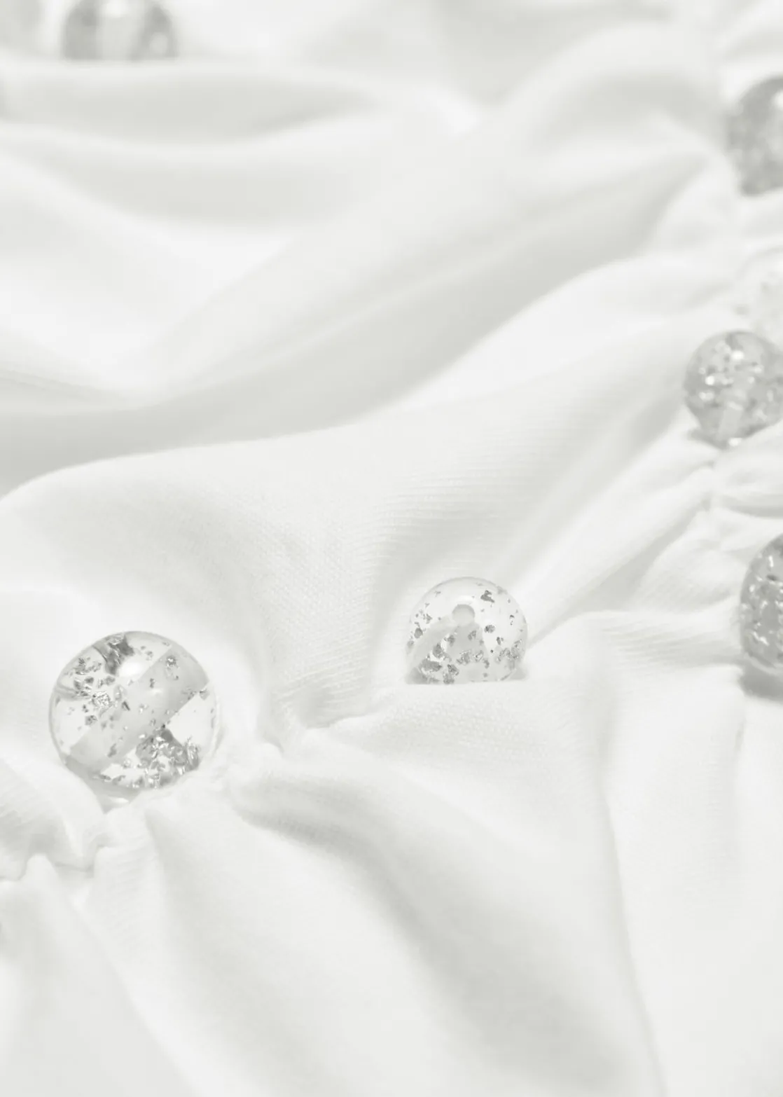 Cropped jersey top featuring an off-shoulder finish. Adorned with spherical, glitter-speckled beads inspired by water drops.