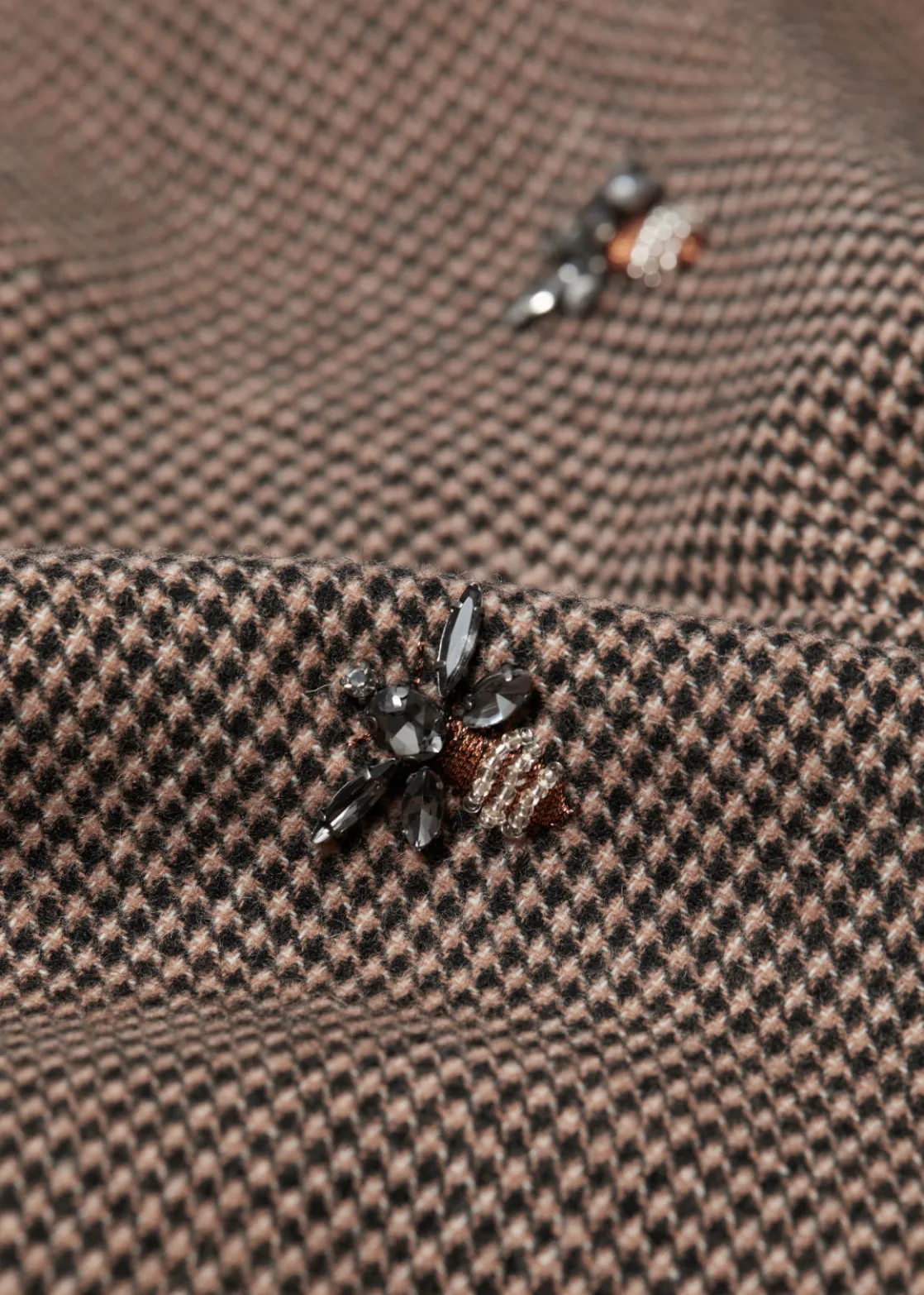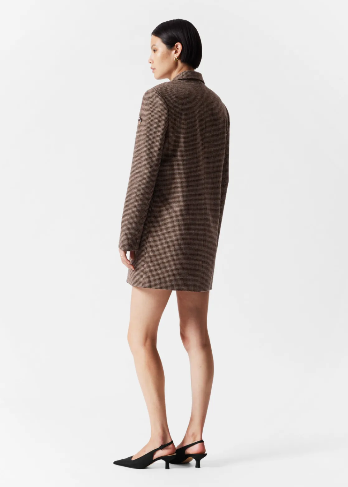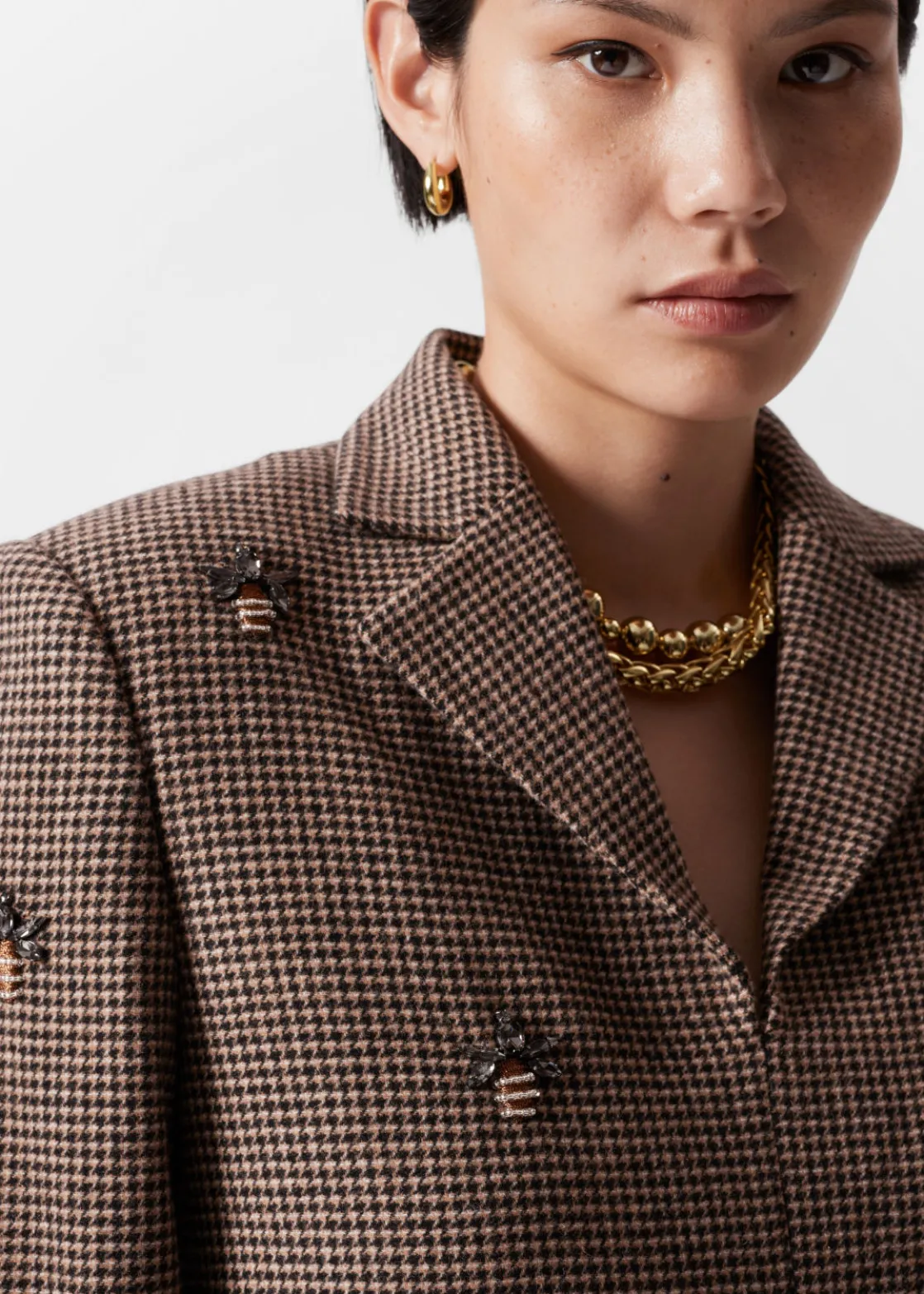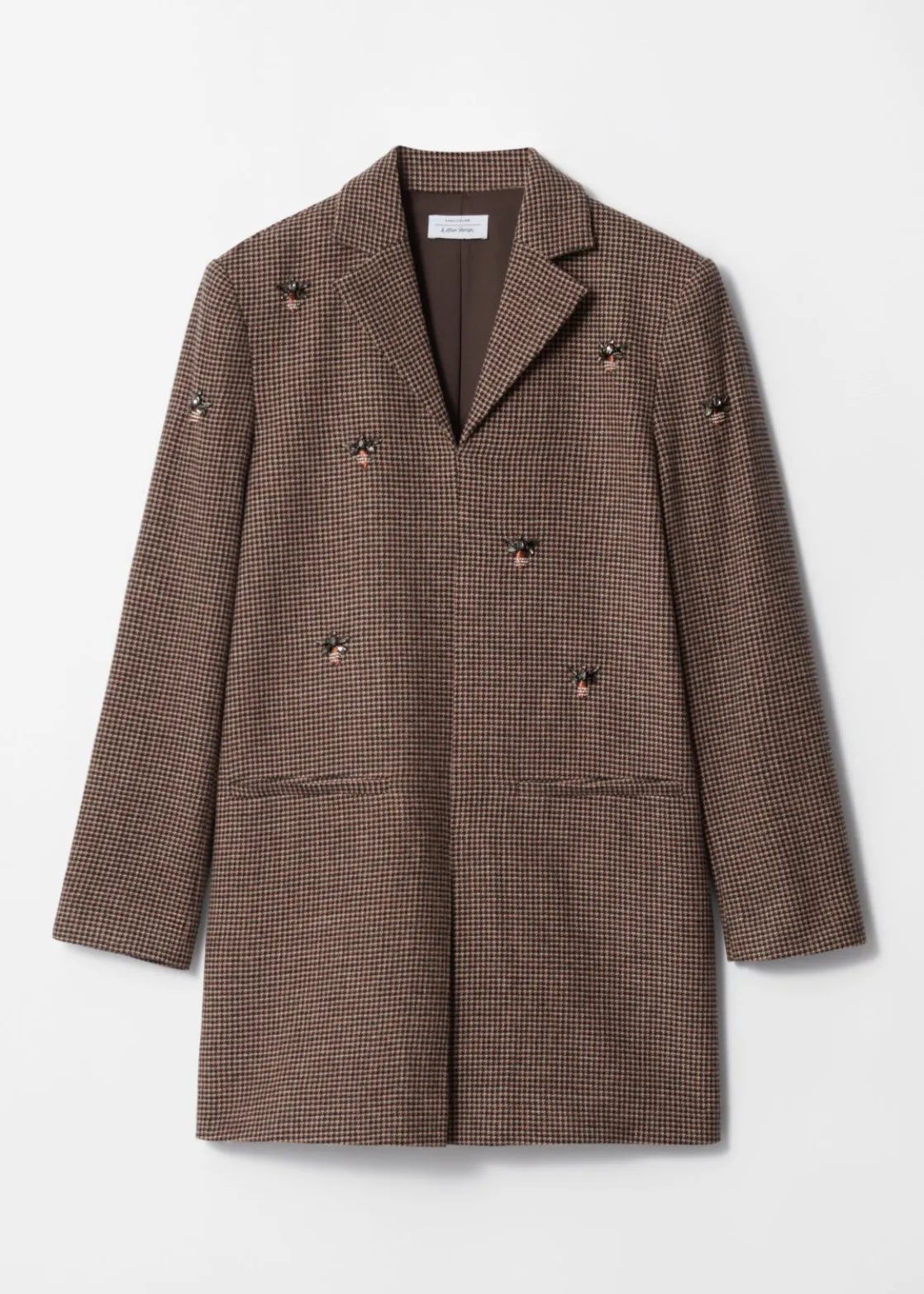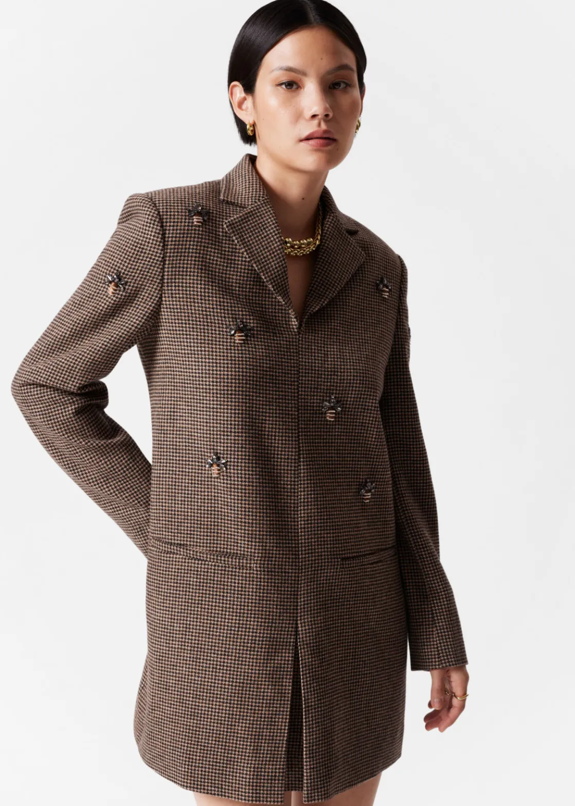 Blazer mini dress in a wool-blend tweed finish. Accented with rhinestone bee embroidery.