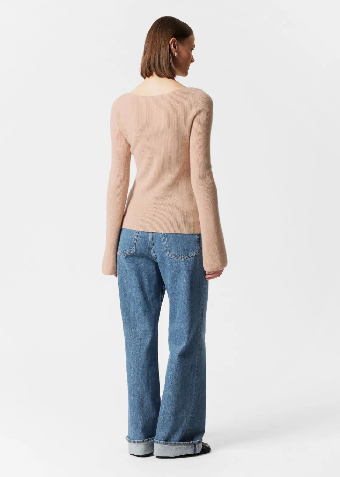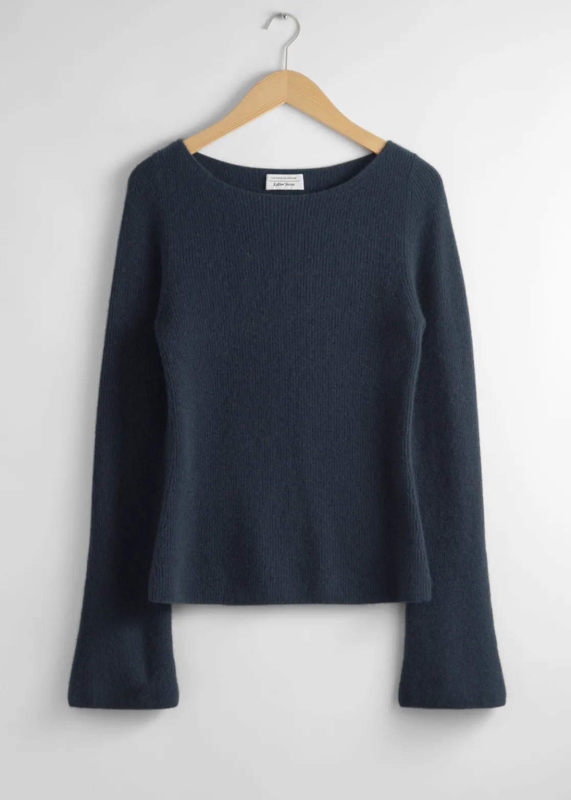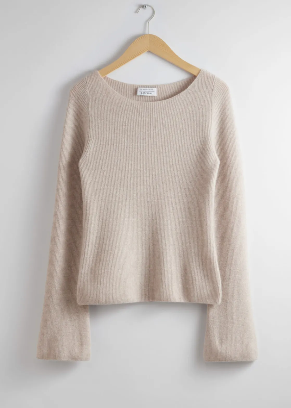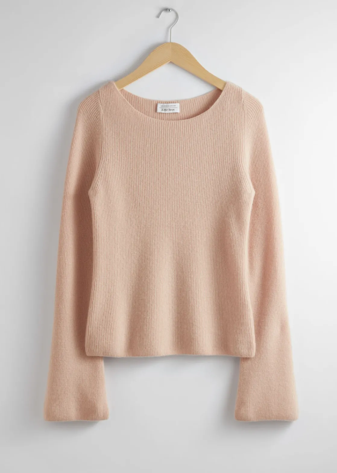 Ribbed cashmere knit sweater with a fitted silhouette and bell sleeves.