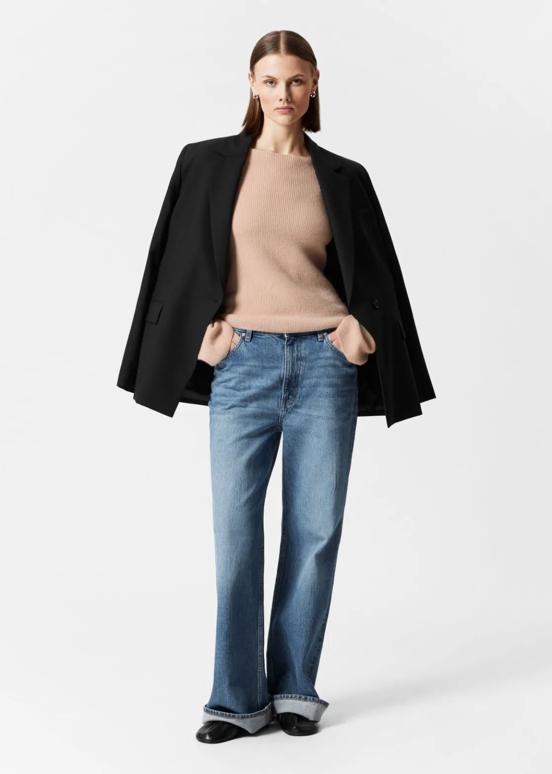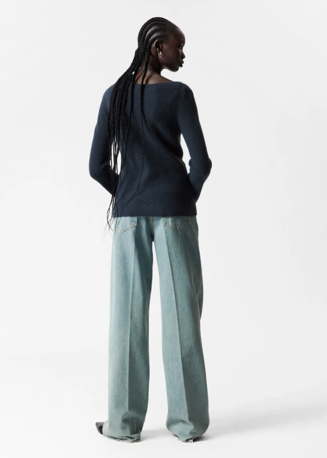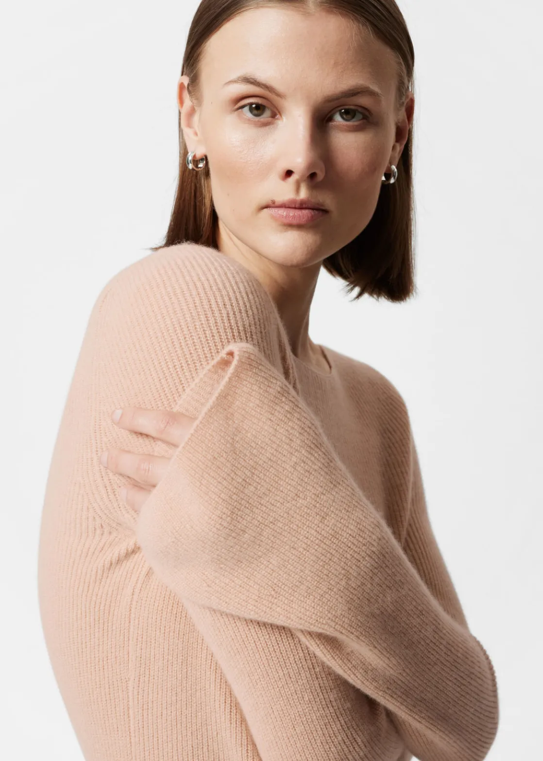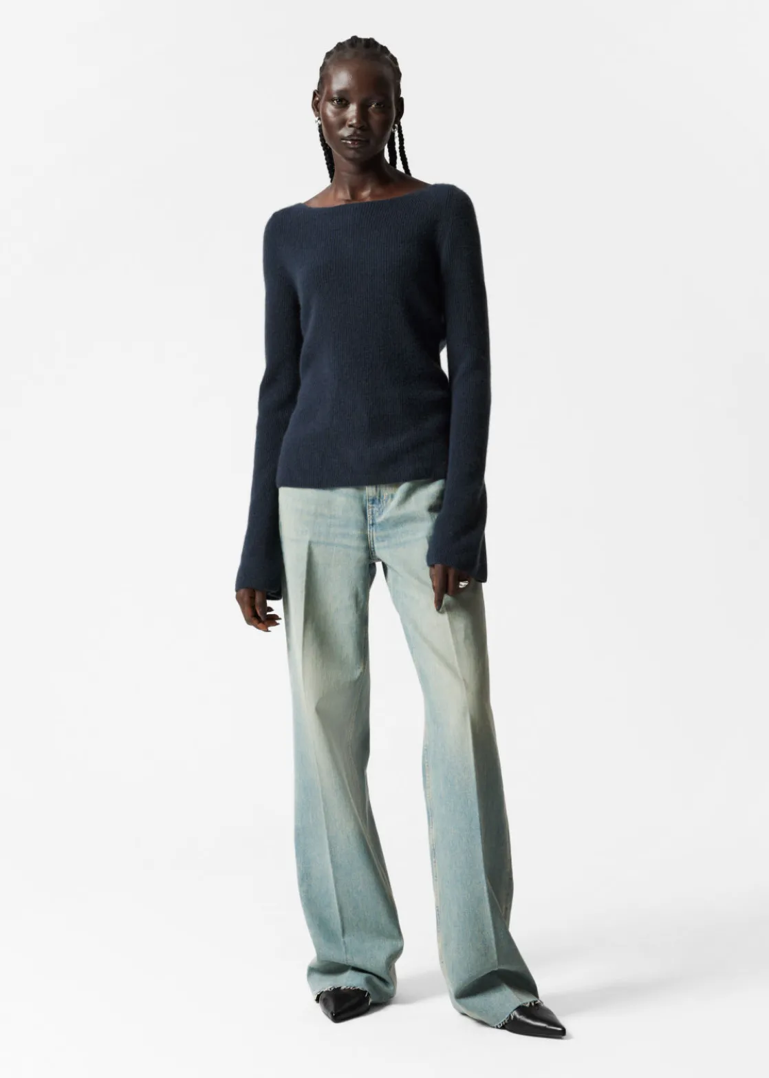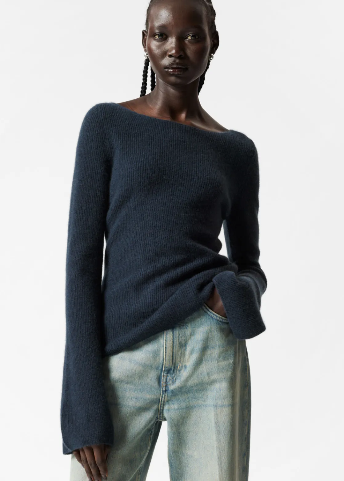 Ribbed cashmere knit sweater with a fitted silhouette and bell sleeves.