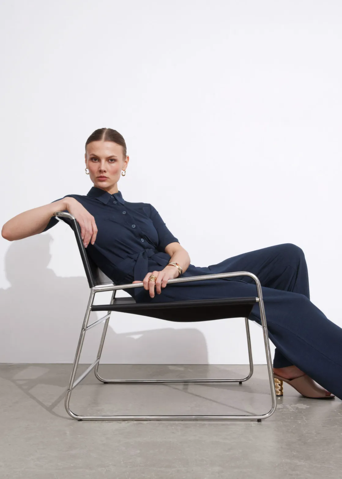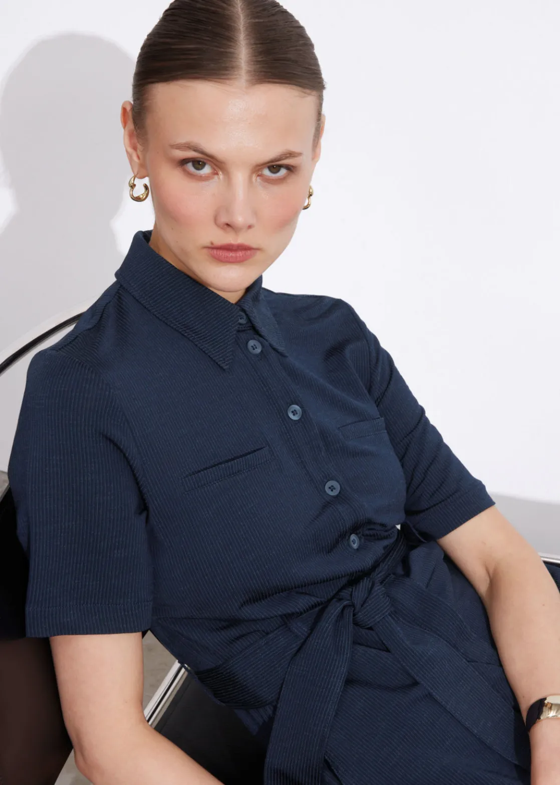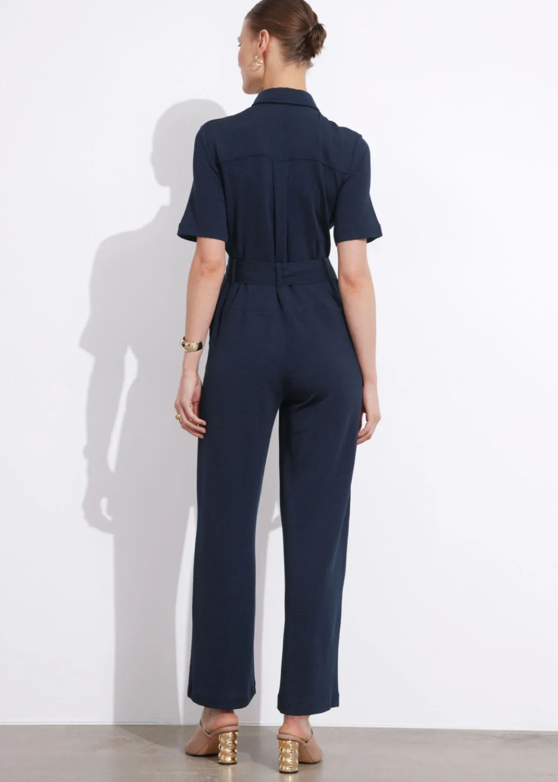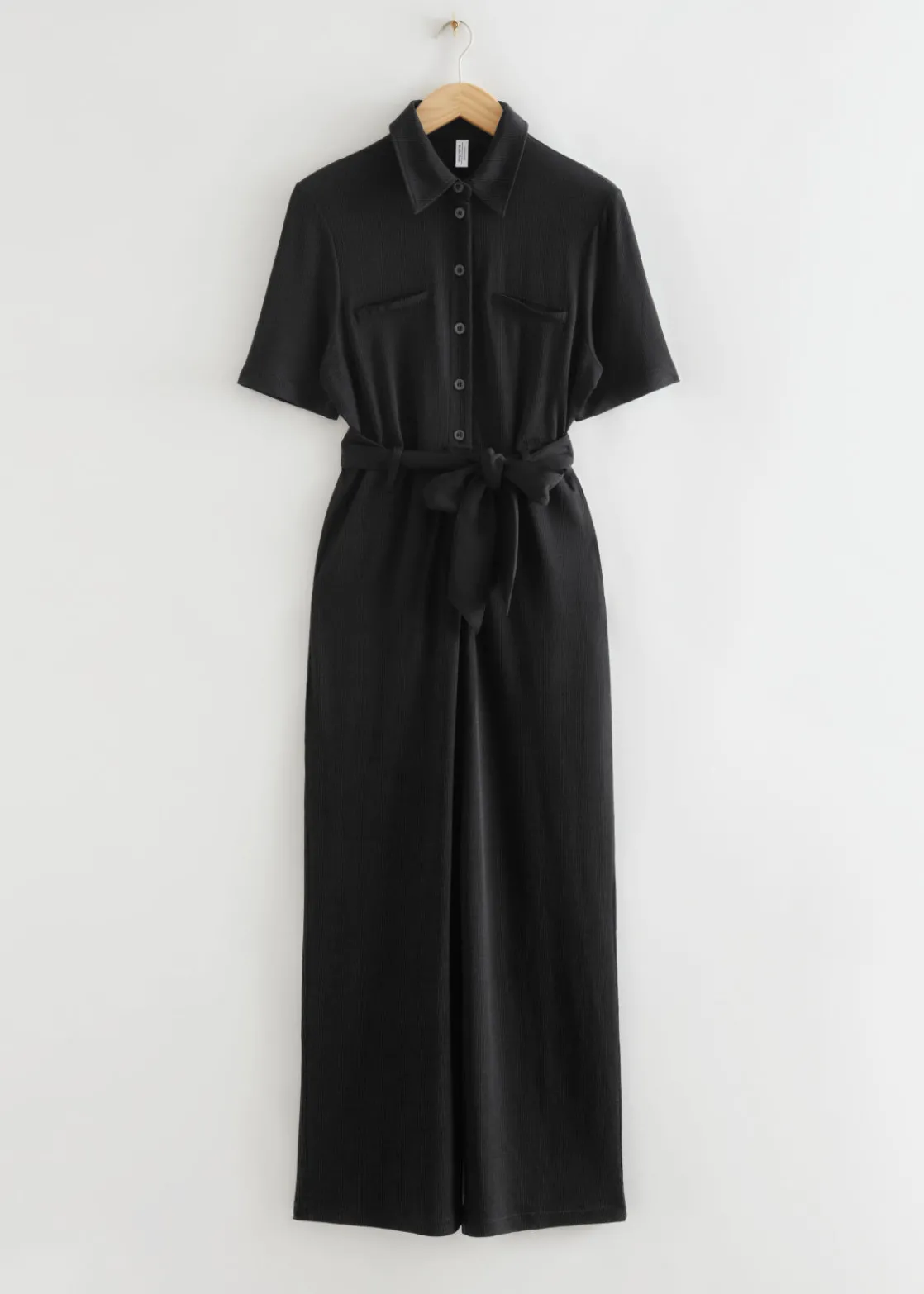 Buttoned and collared short sleeve jumpsuit with a fluid silhouette, featuring a tonal self-tie belt.