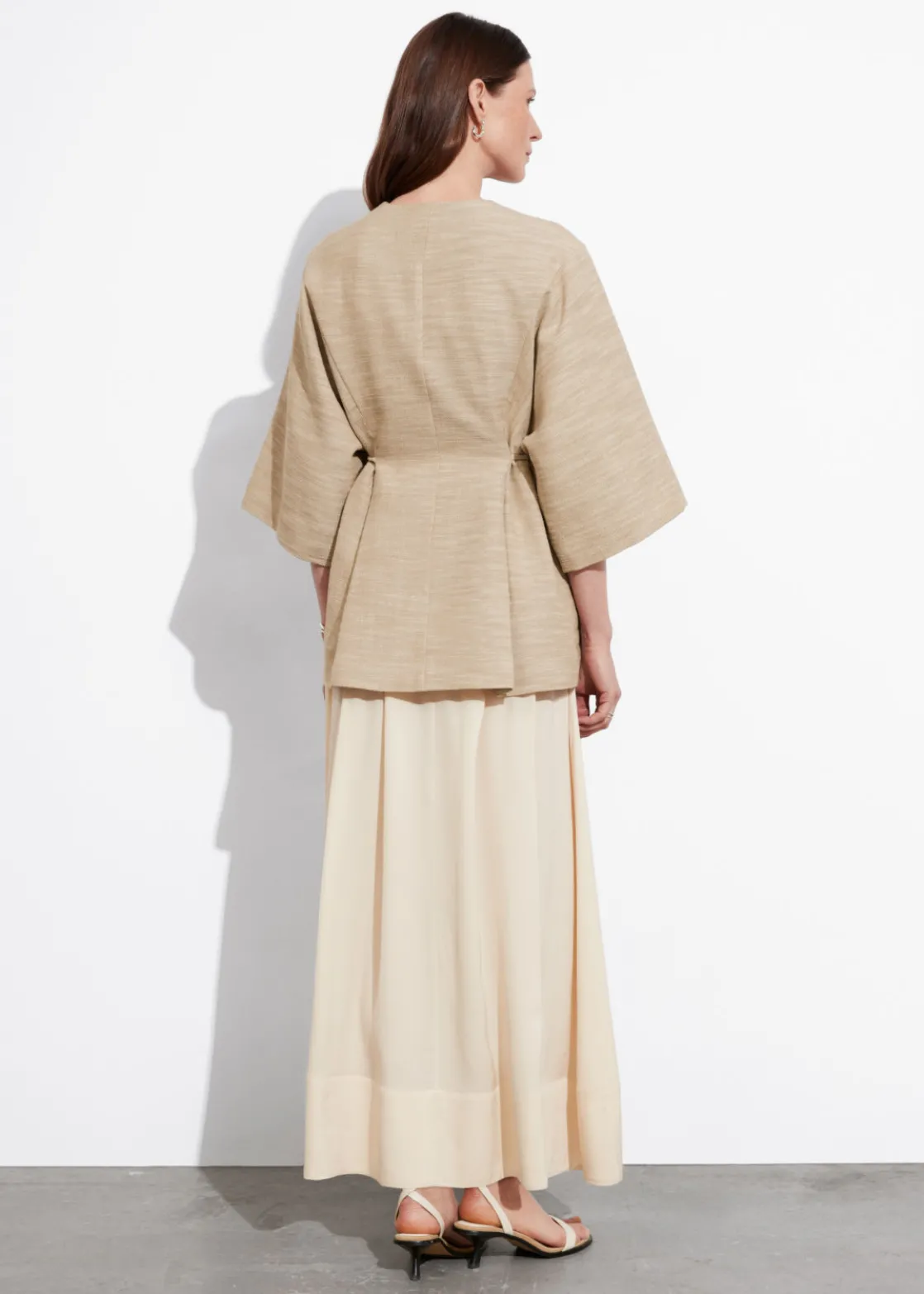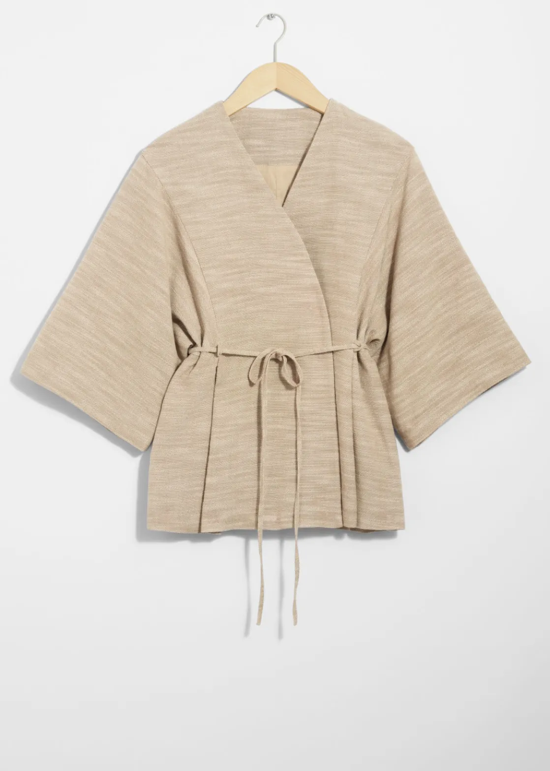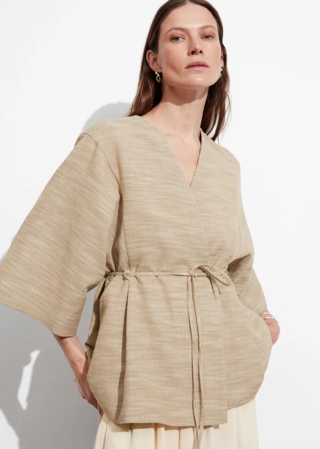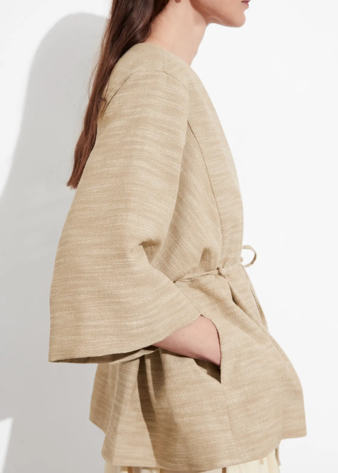 Jacket made from a silk-blend, featuring wide three-quarter sleeves and a thin, tonal self-tie belt.