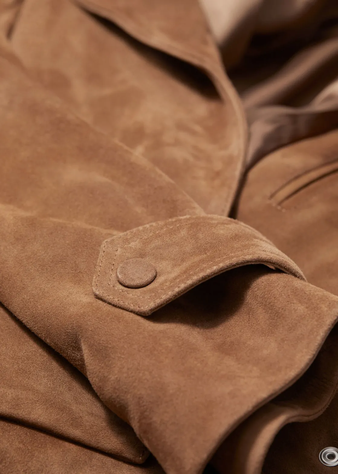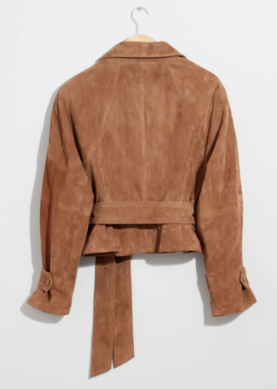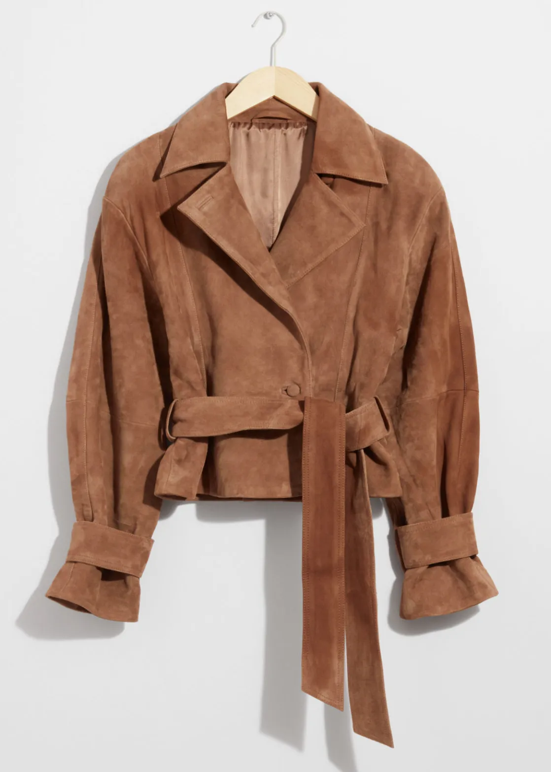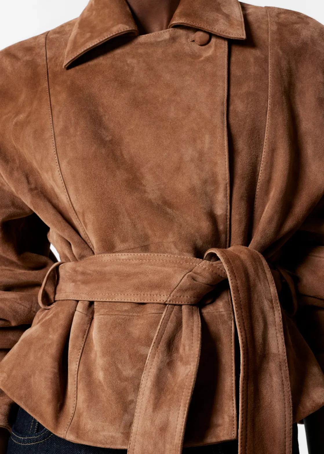 Suede jacket secured with a button and a tonal self-tie belt.