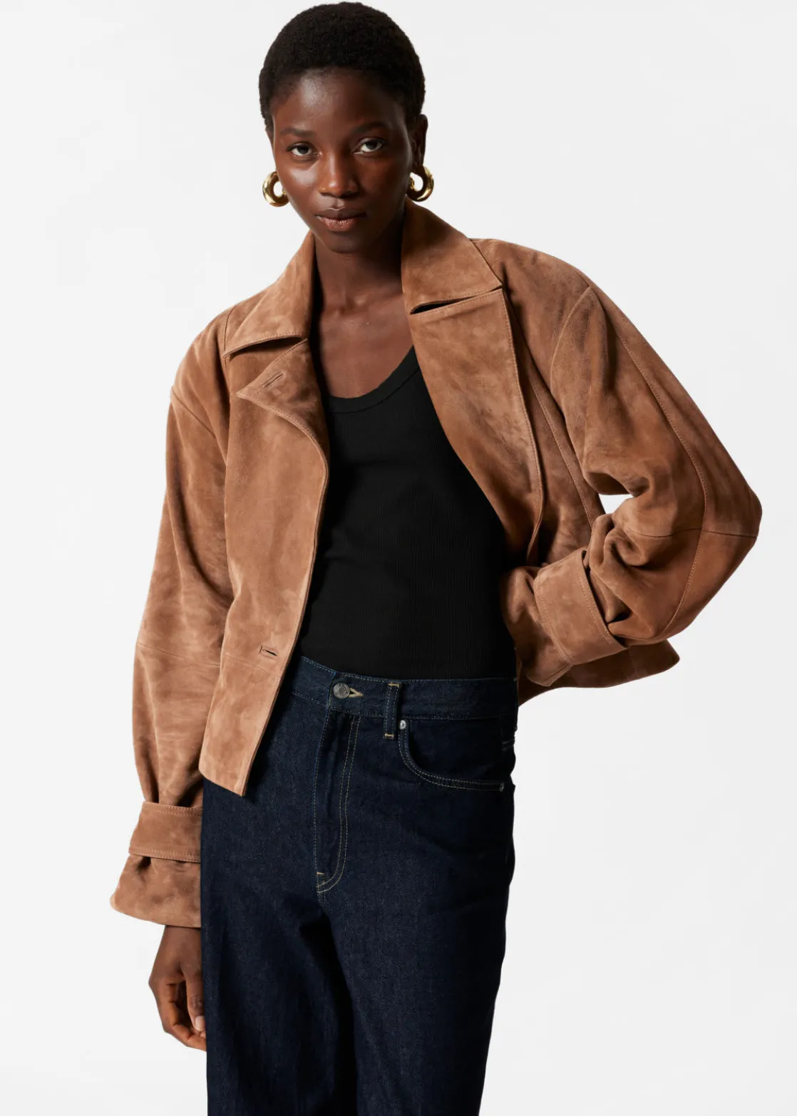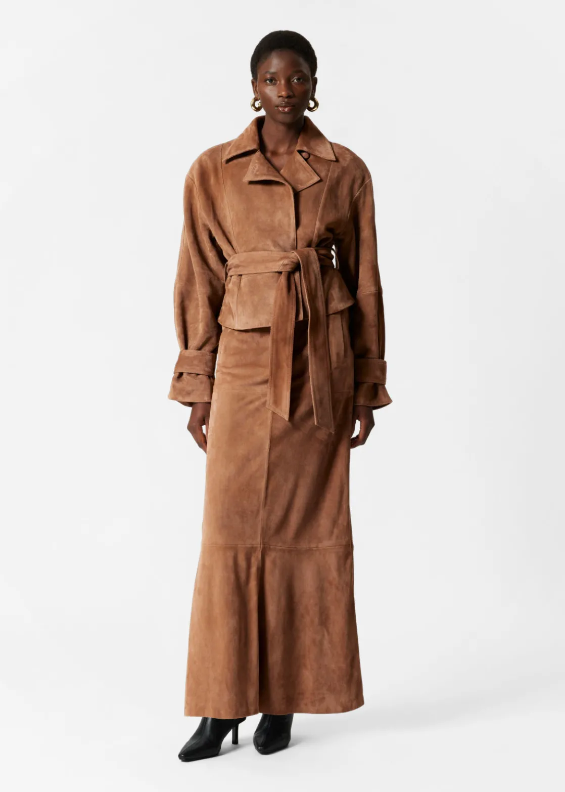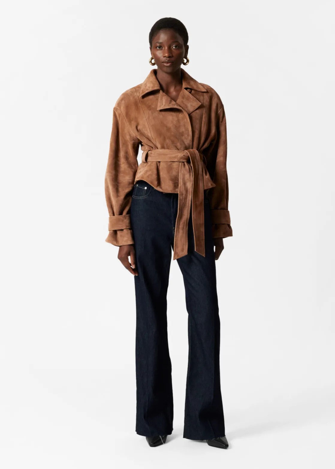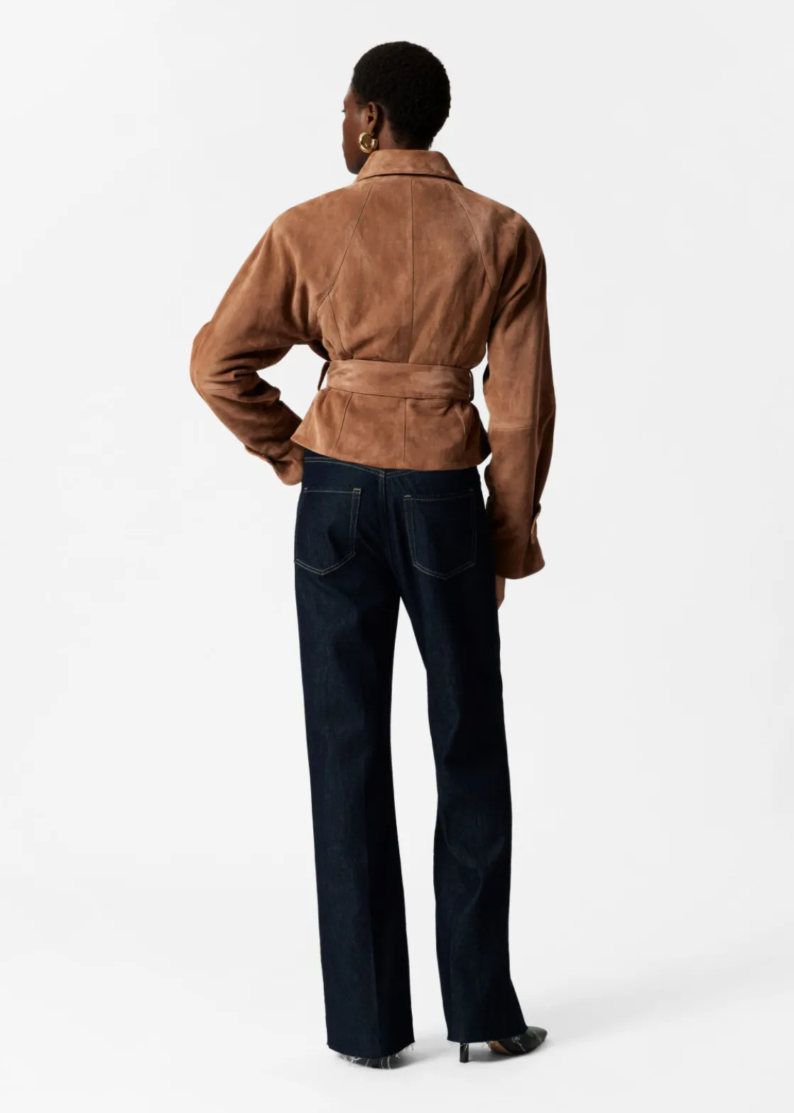 Suede jacket secured with a button and a tonal self-tie belt.