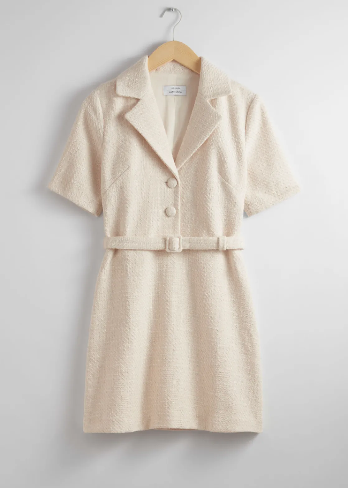Collared tweed mini dress featuring short sleeves. Traced with duo button closures and secured with a tonal belt.