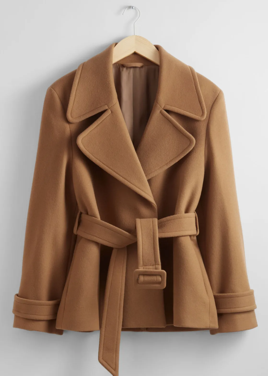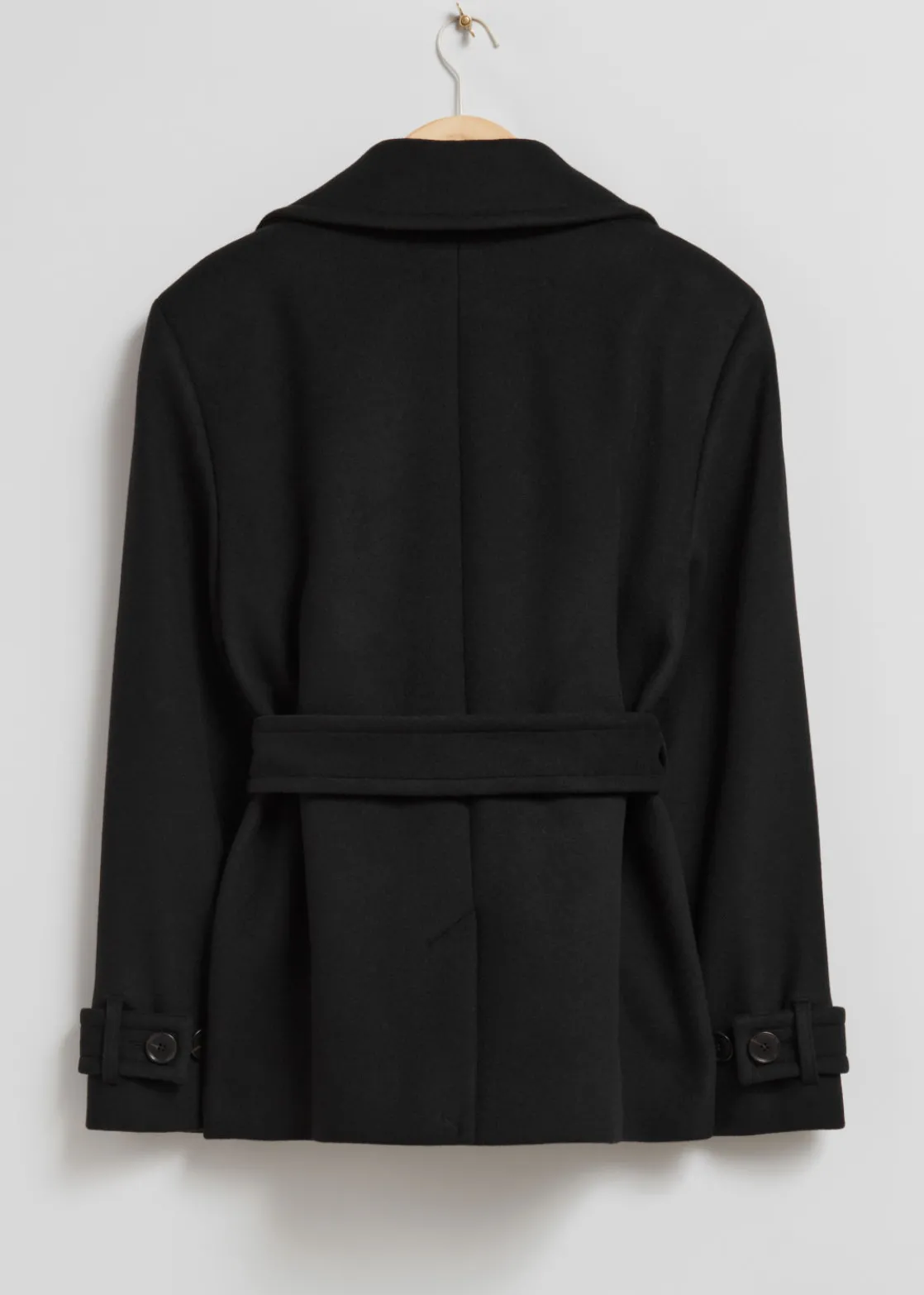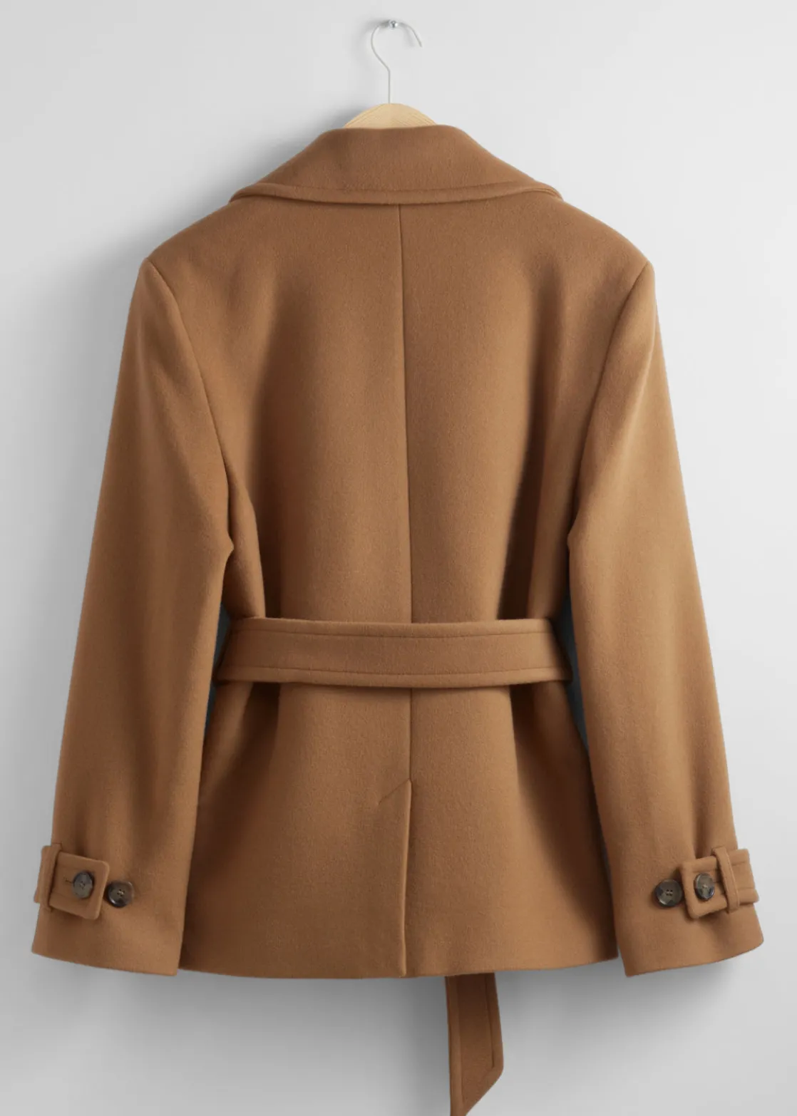 Relaxed wool jacket featuring padded shoulders and a buckle belt.