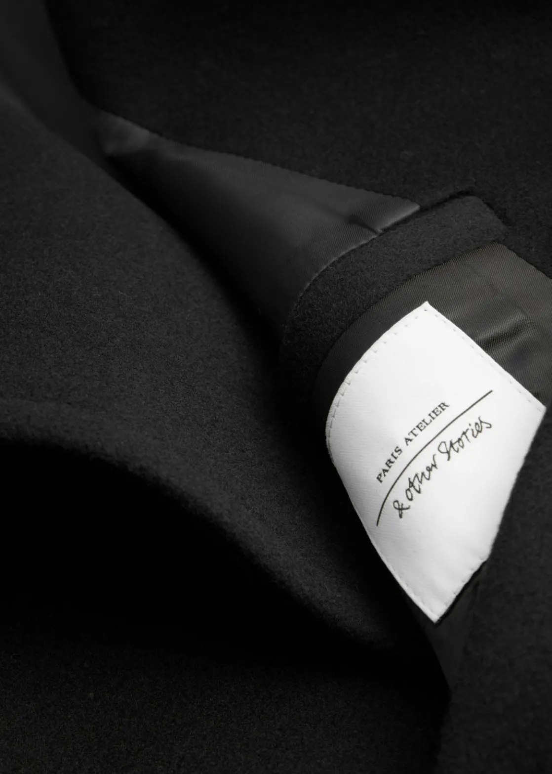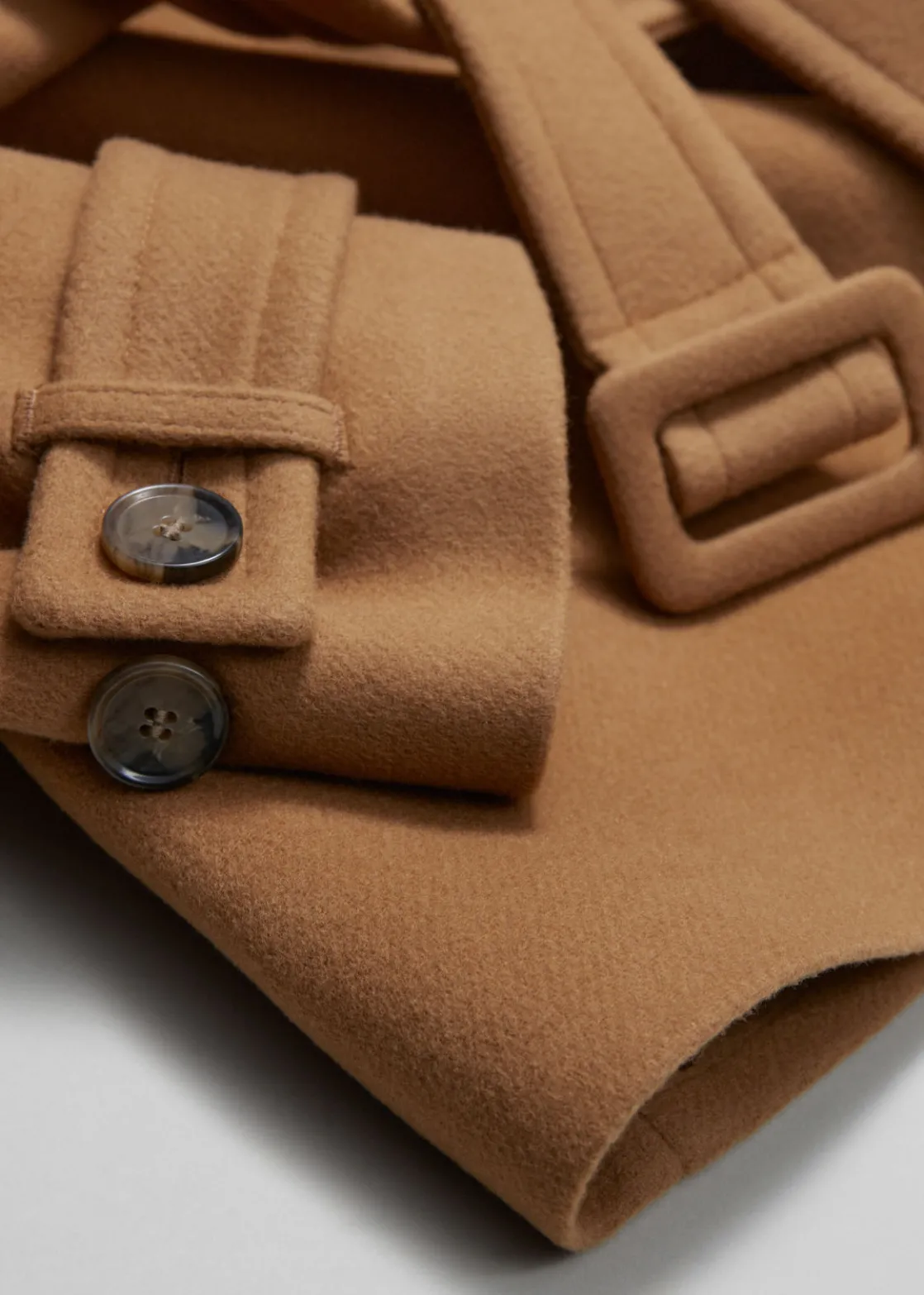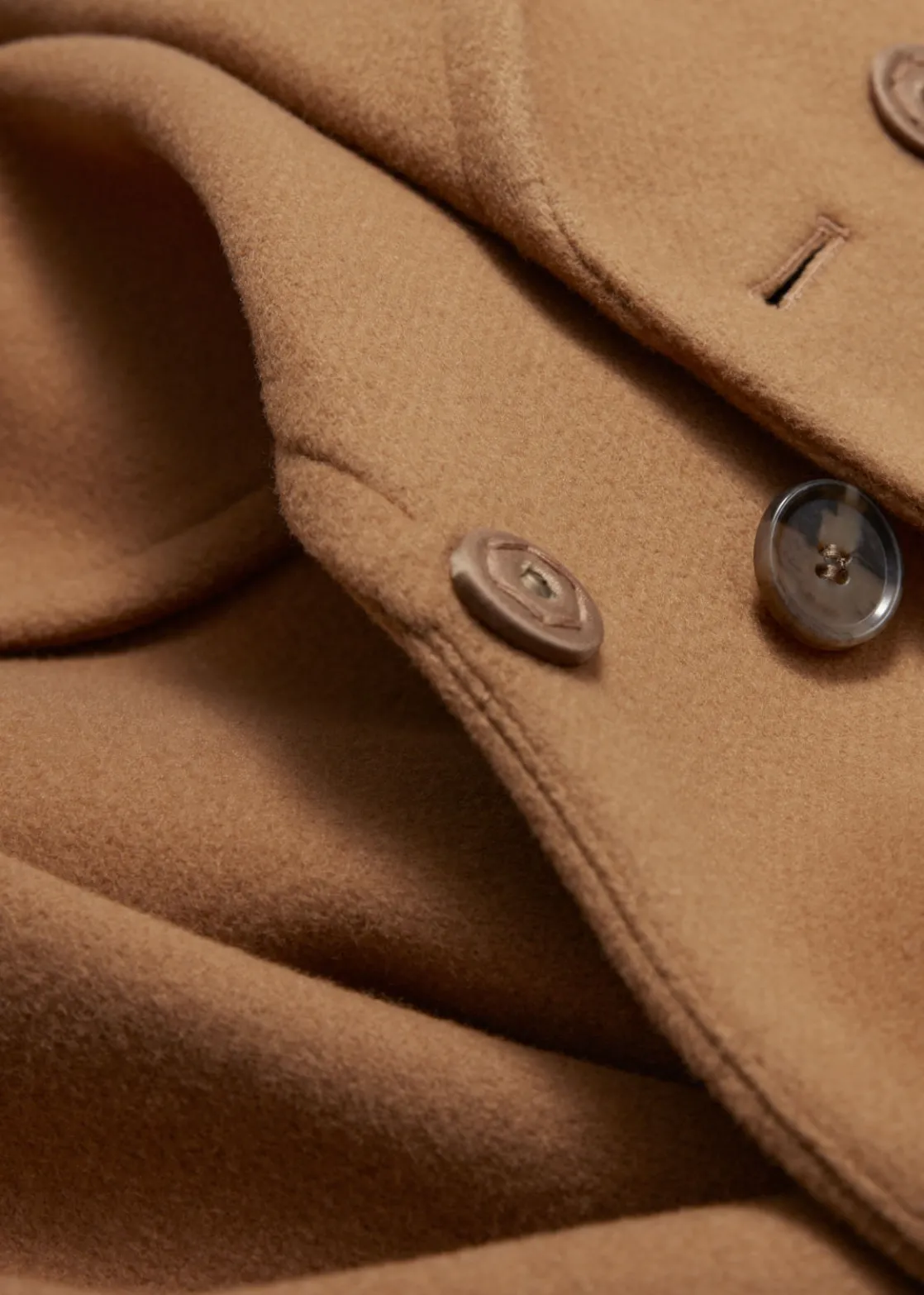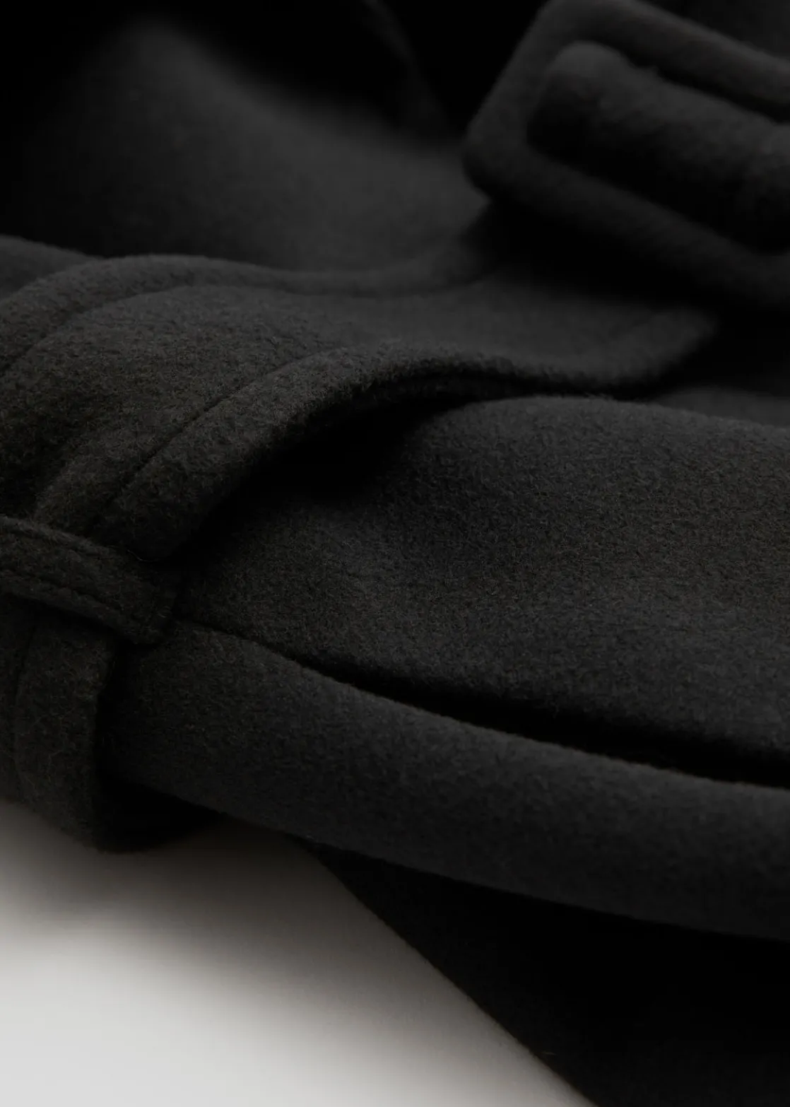 Relaxed wool jacket featuring padded shoulders and a buckle belt.