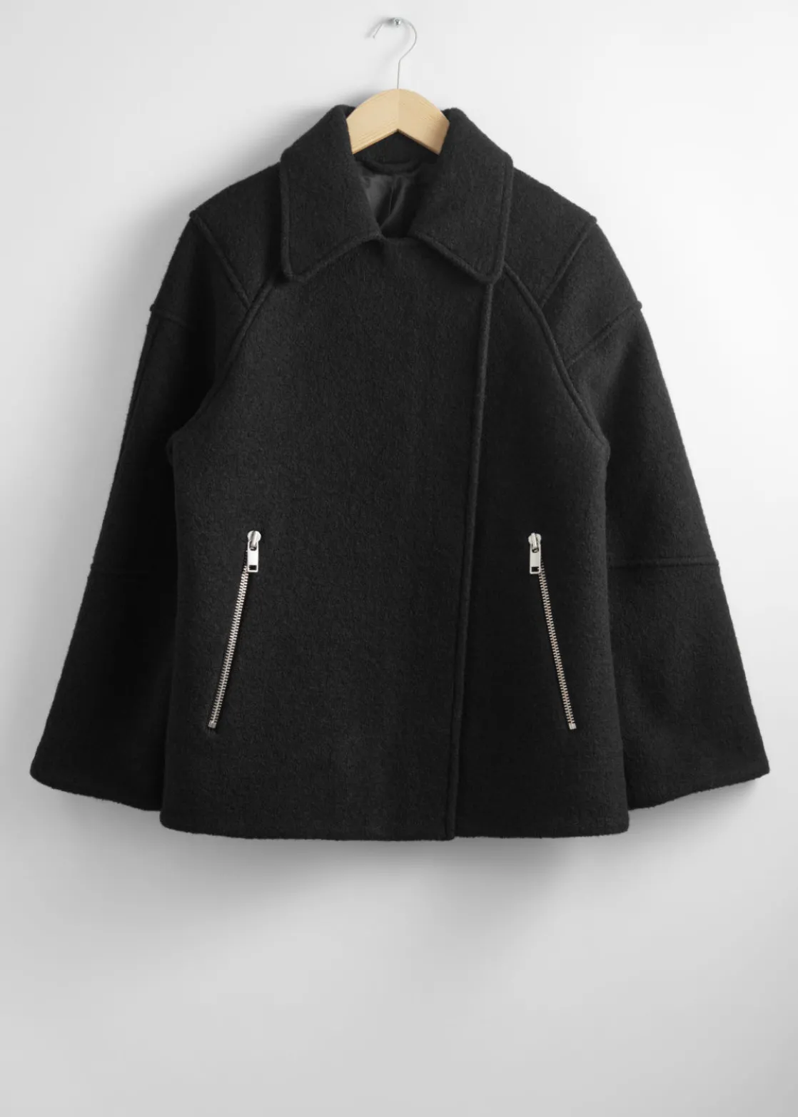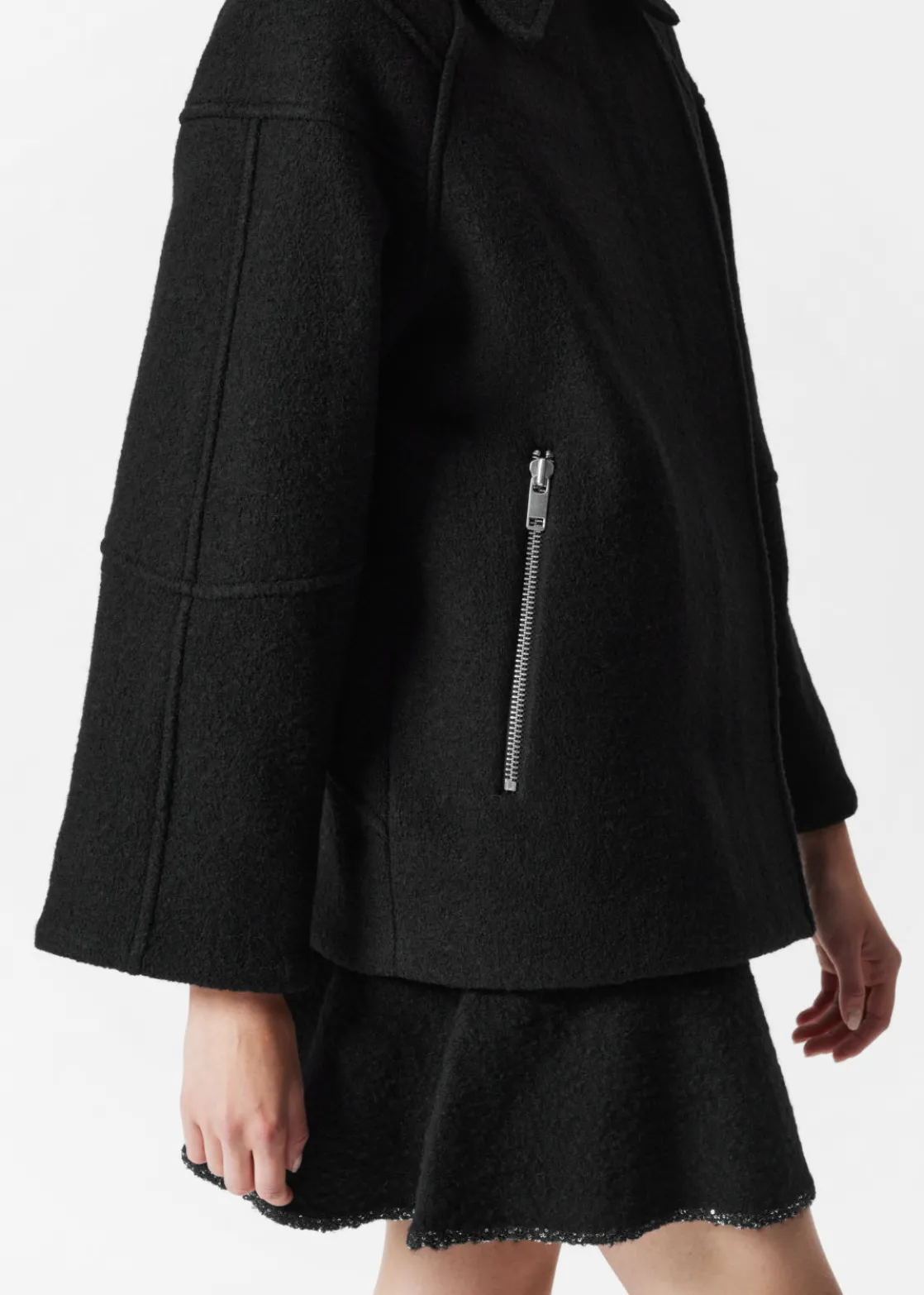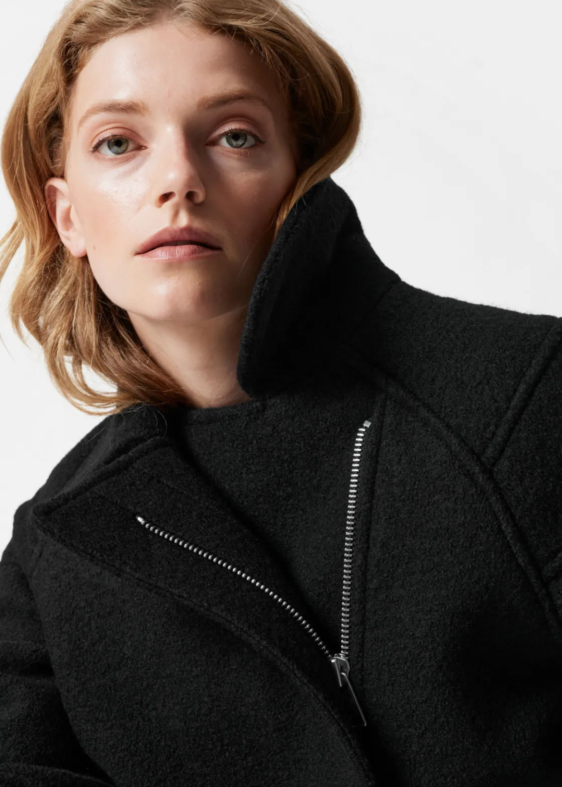 Wool jacket featuring a biker-inspired finish, secured with an asymmetric zipper.