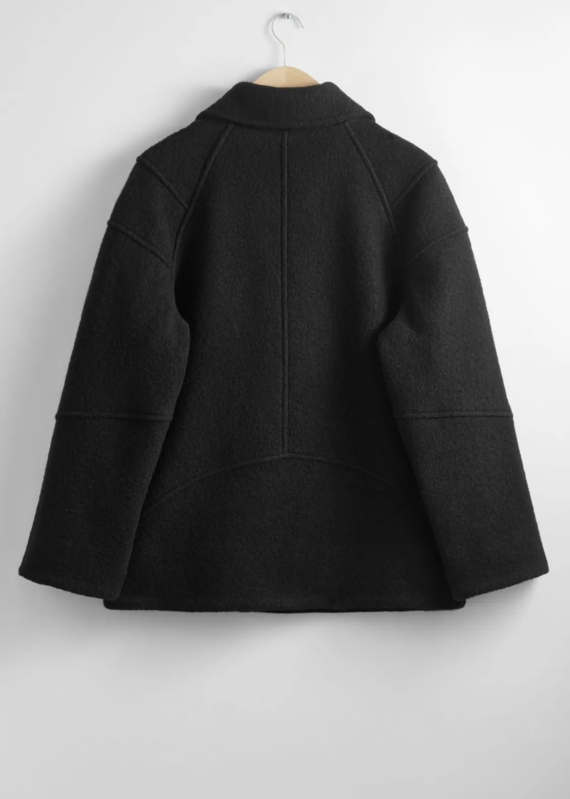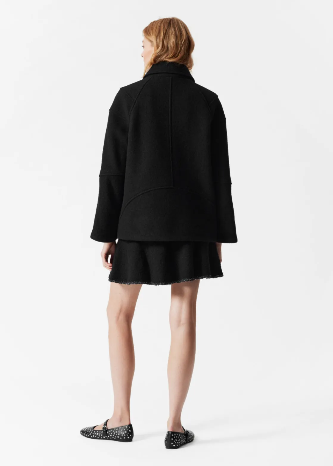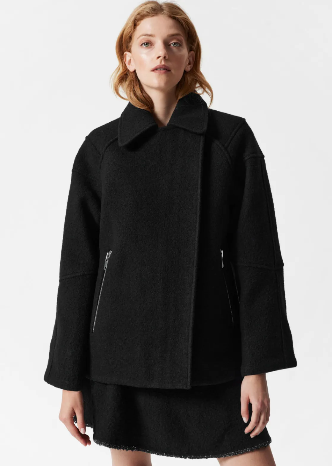 Wool jacket featuring a biker-inspired finish, secured with an asymmetric zipper.