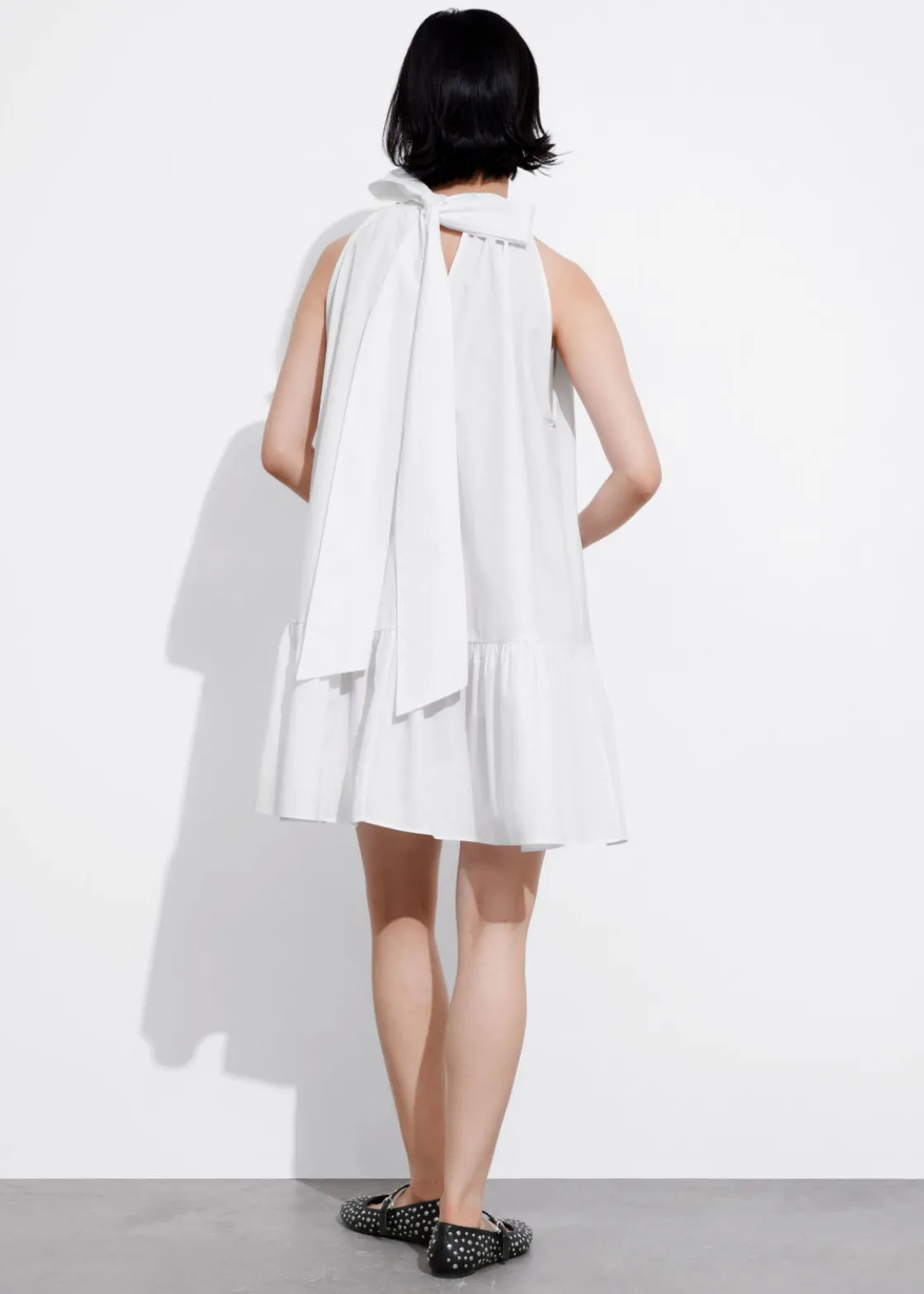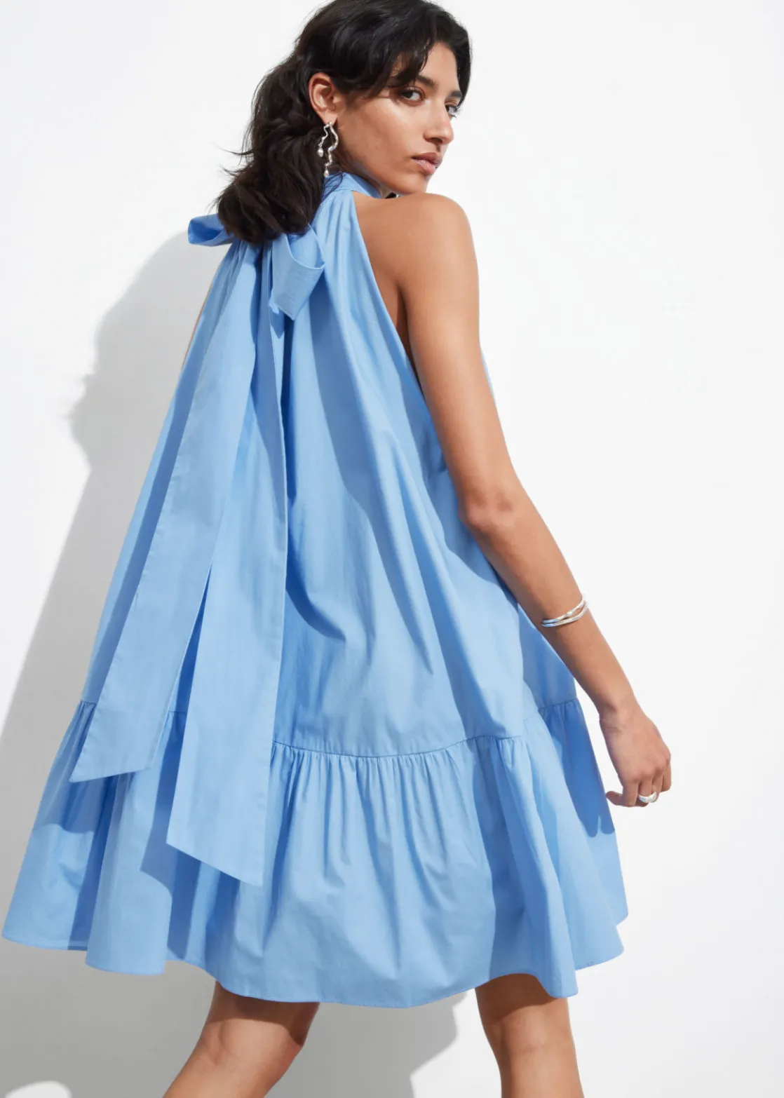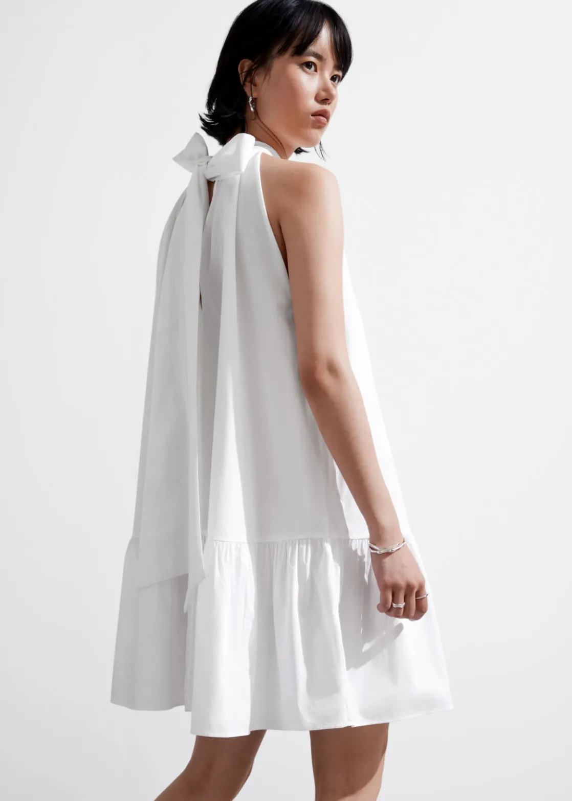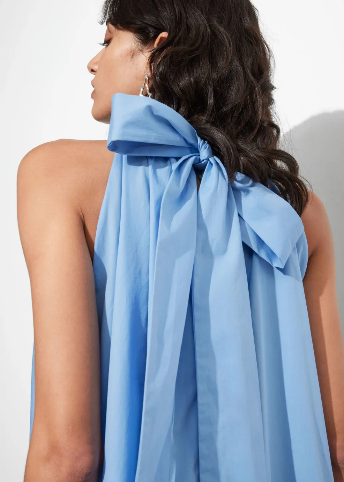A-line halterneck mini dress defined by a large bow at the neck. Featuring a tiered hemline.