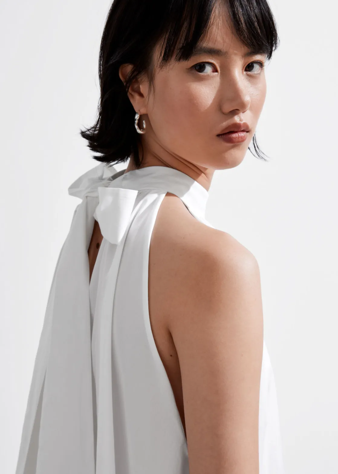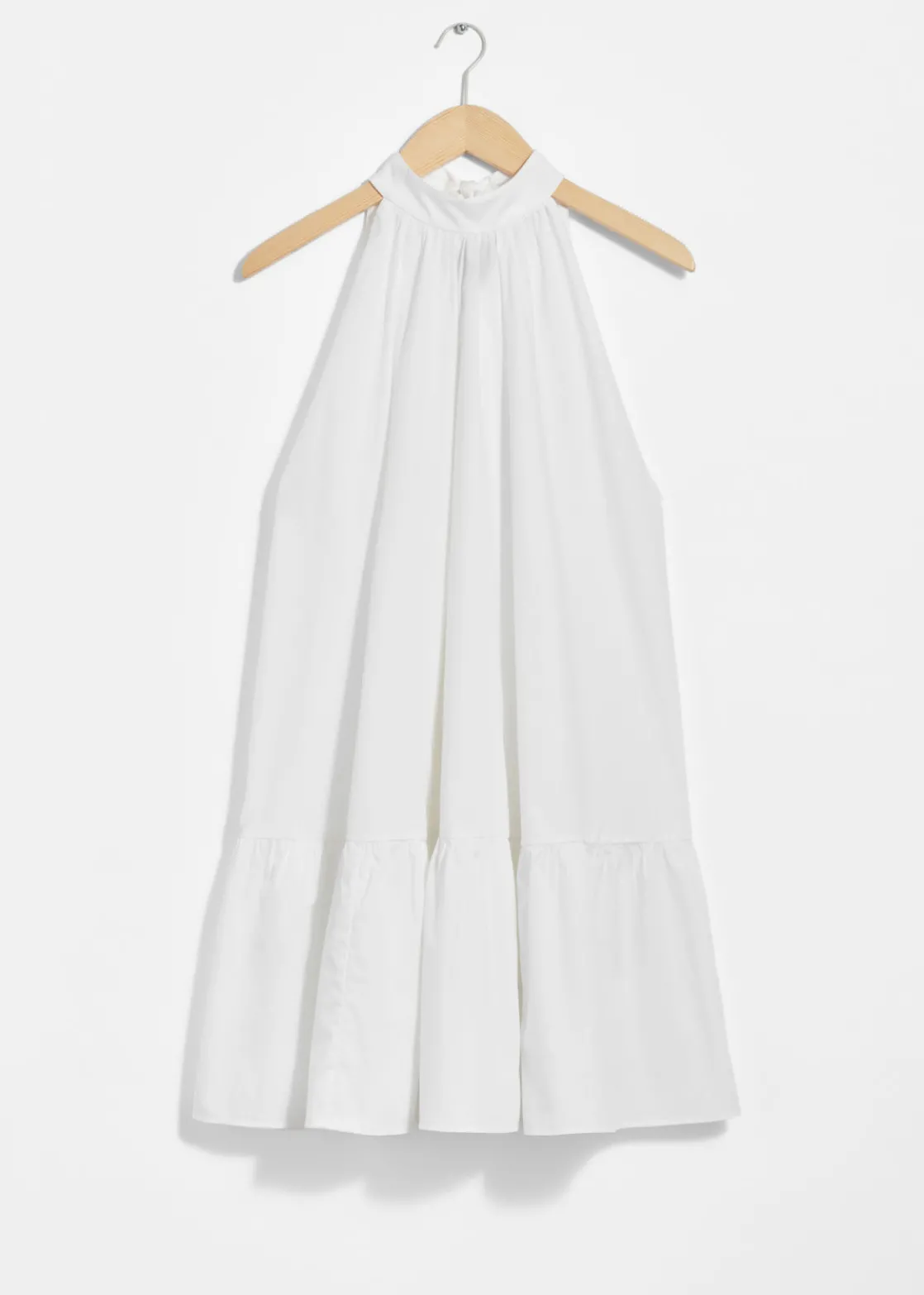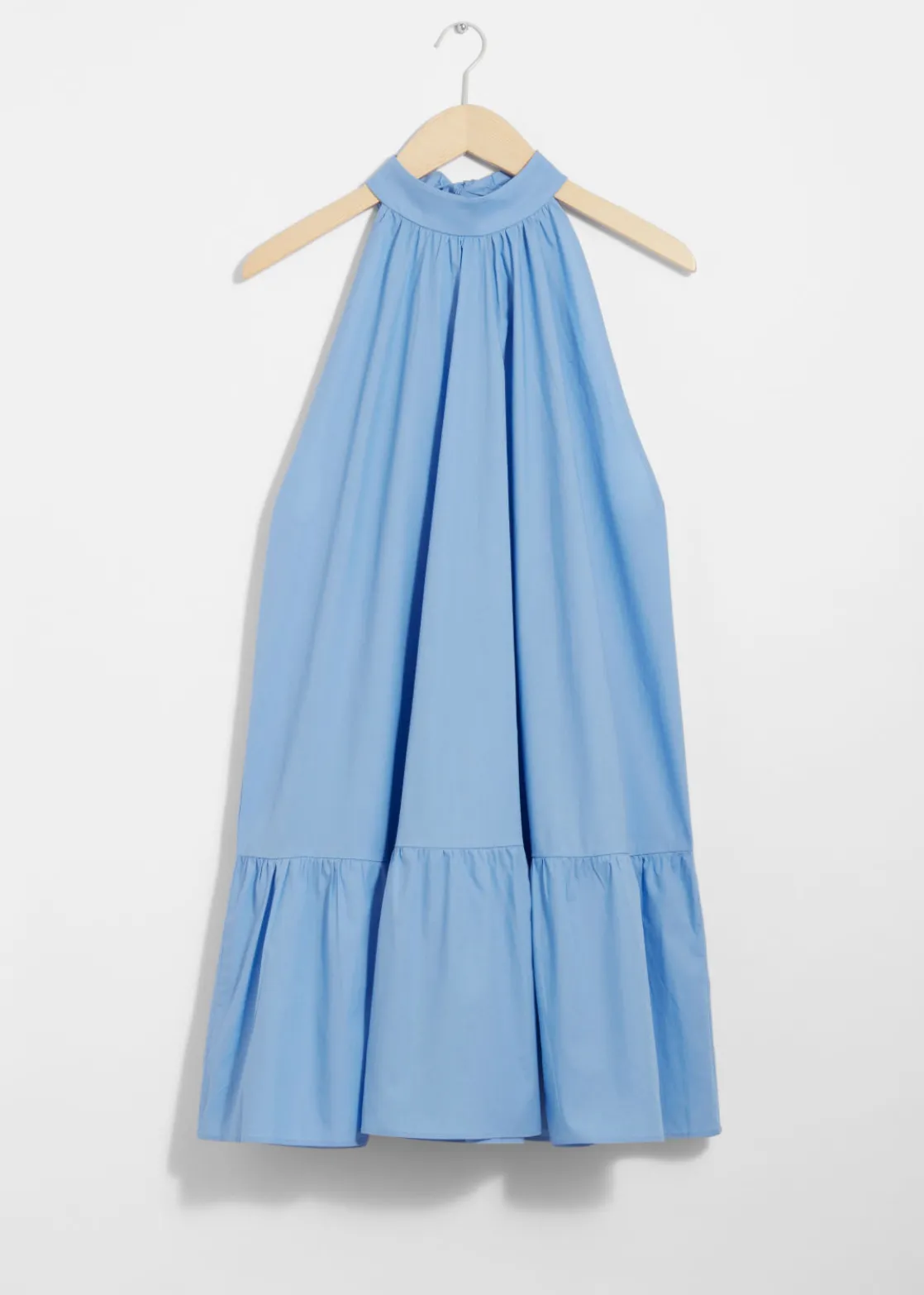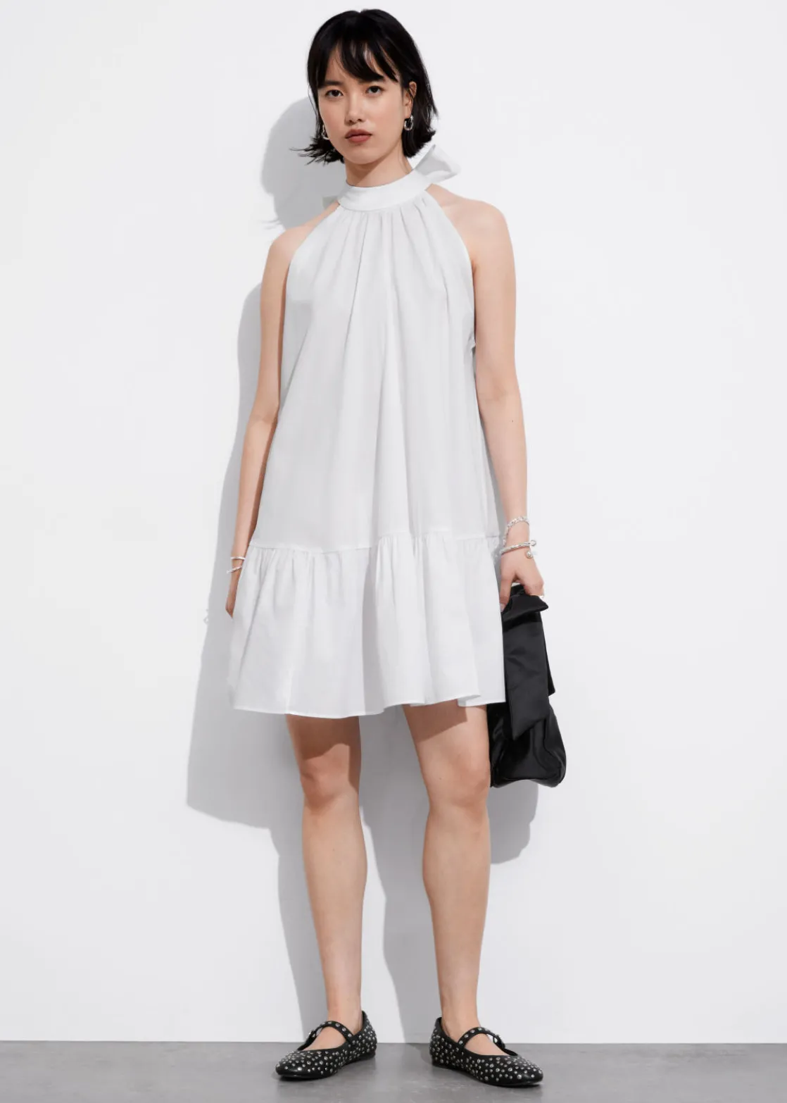A-line halterneck mini dress defined by a large bow at the neck. Featuring a tiered hemline.