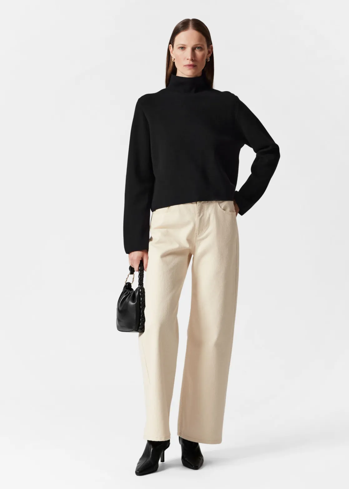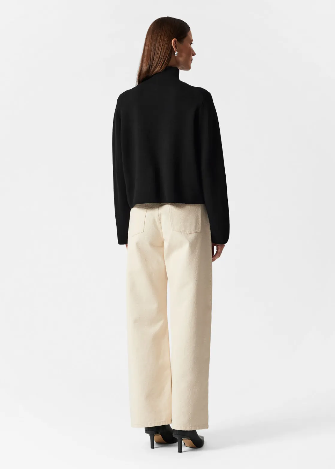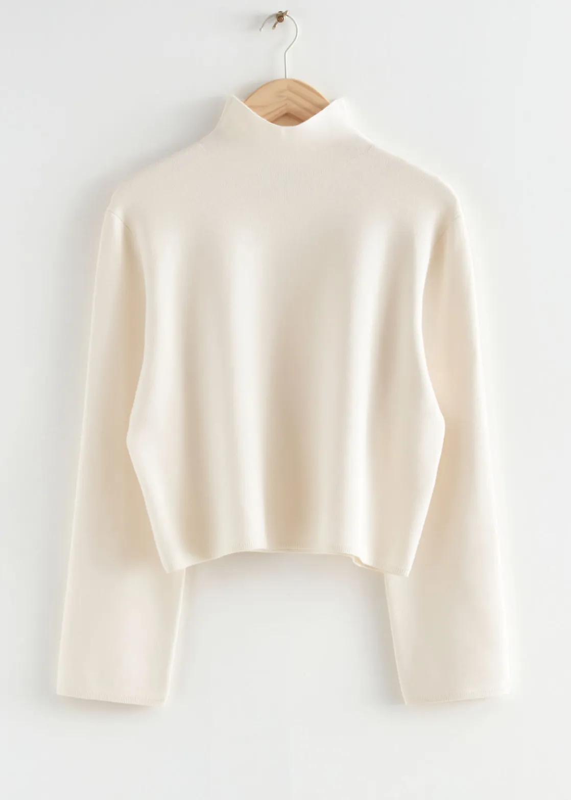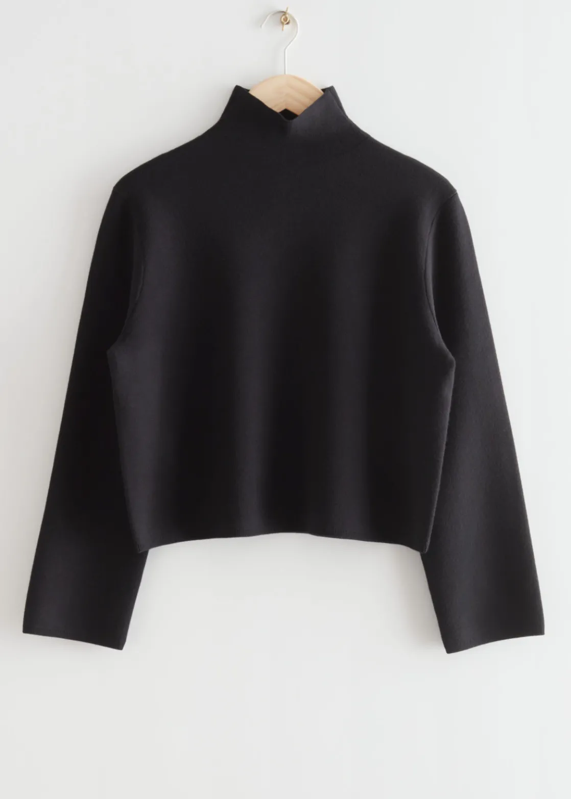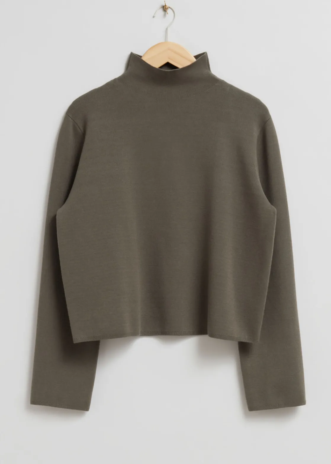 Turtleneck knit sweater with a cropped, boxy silhouette.