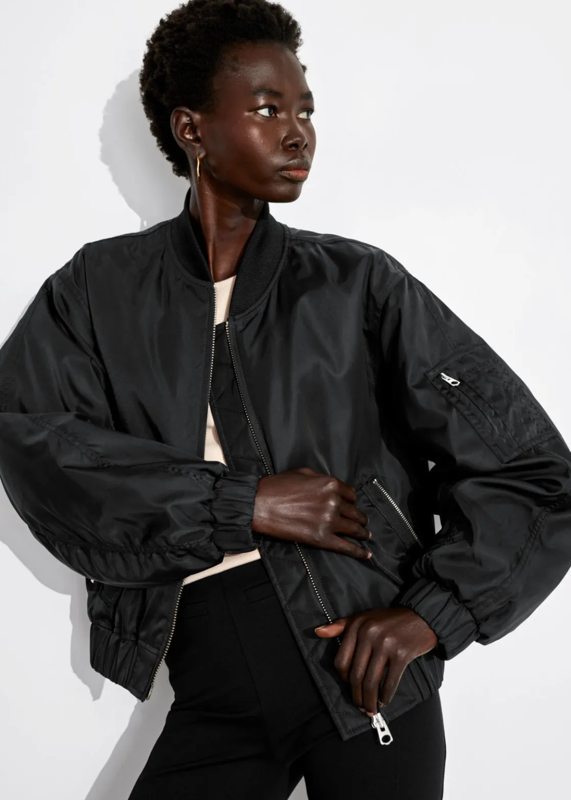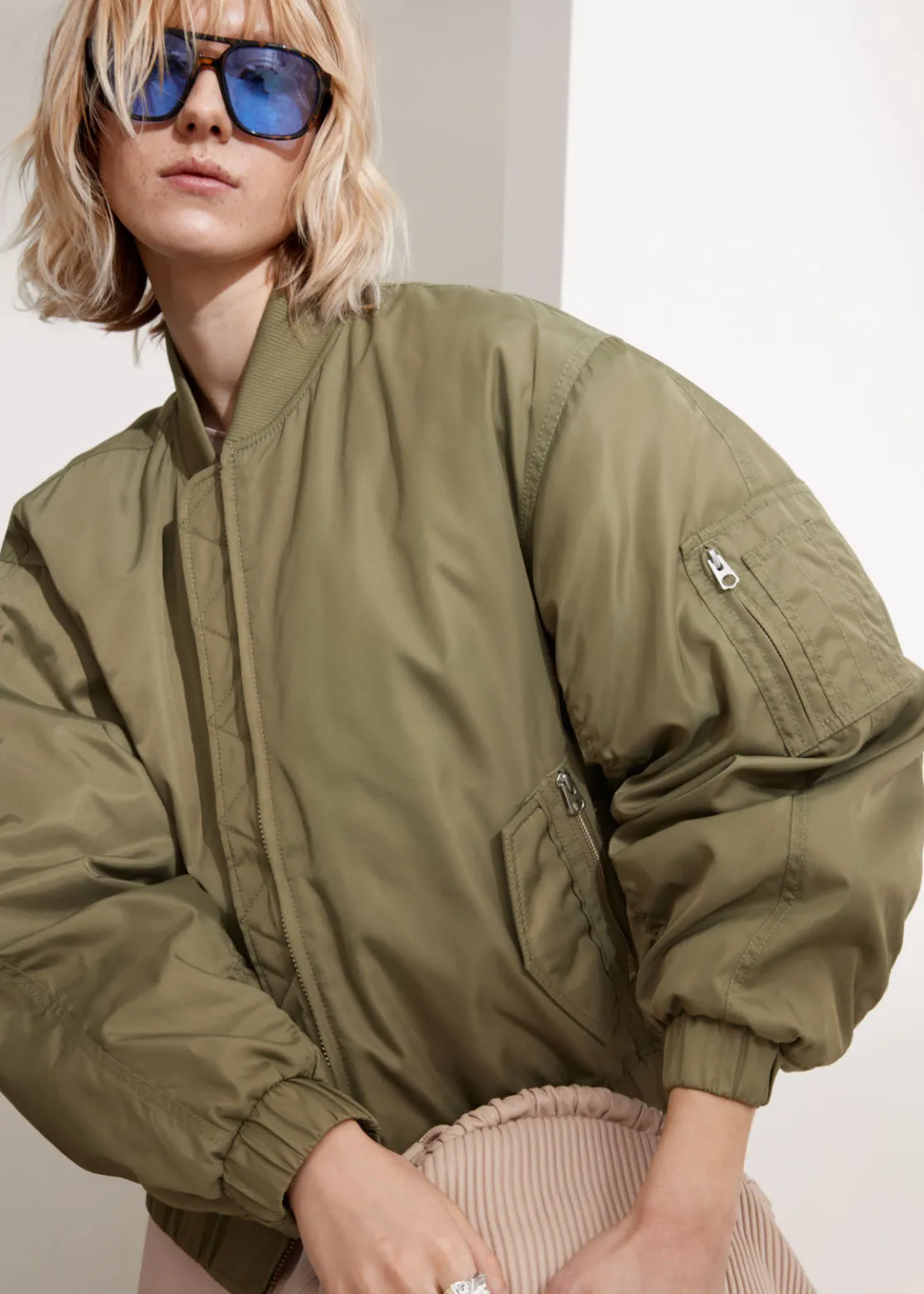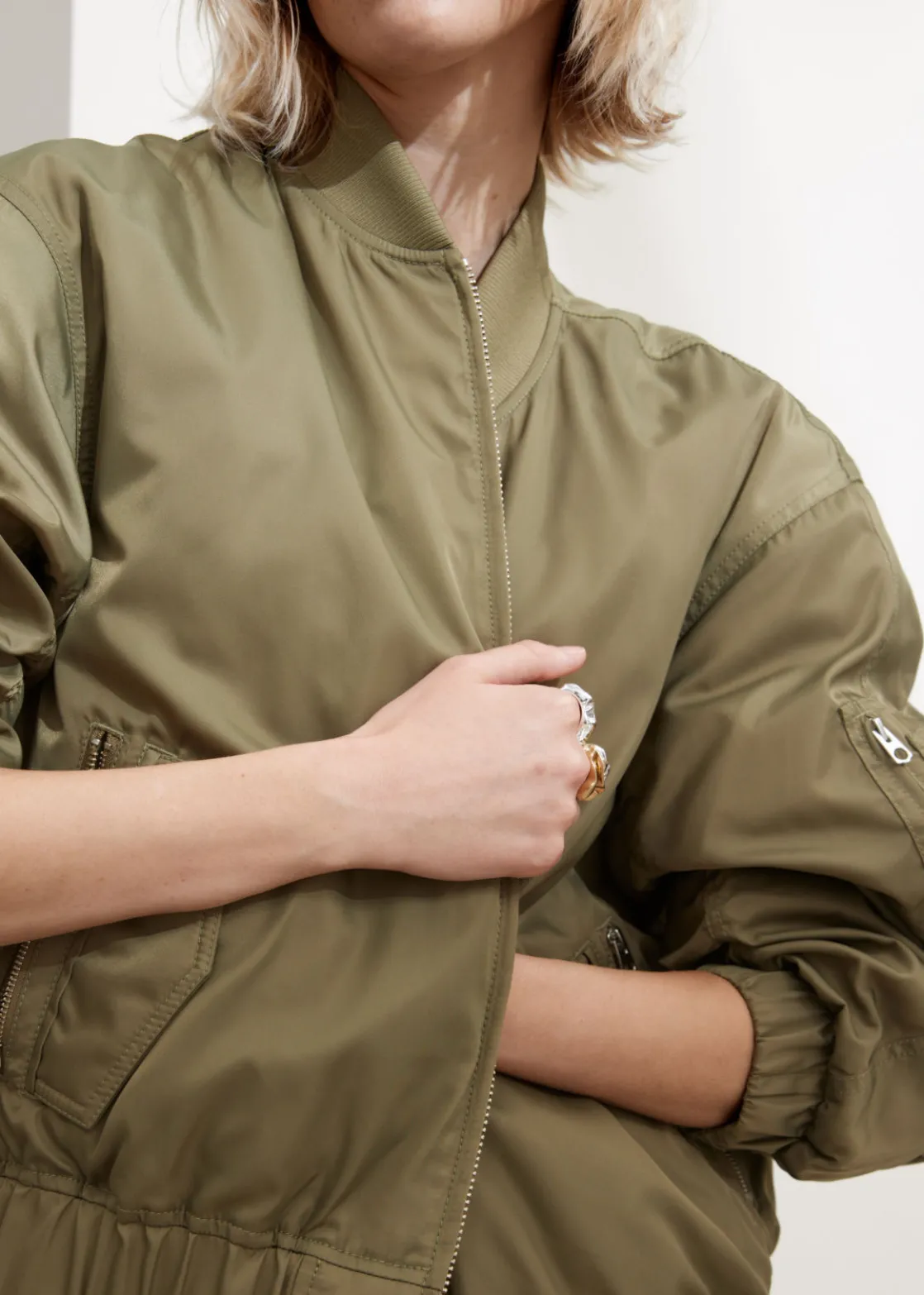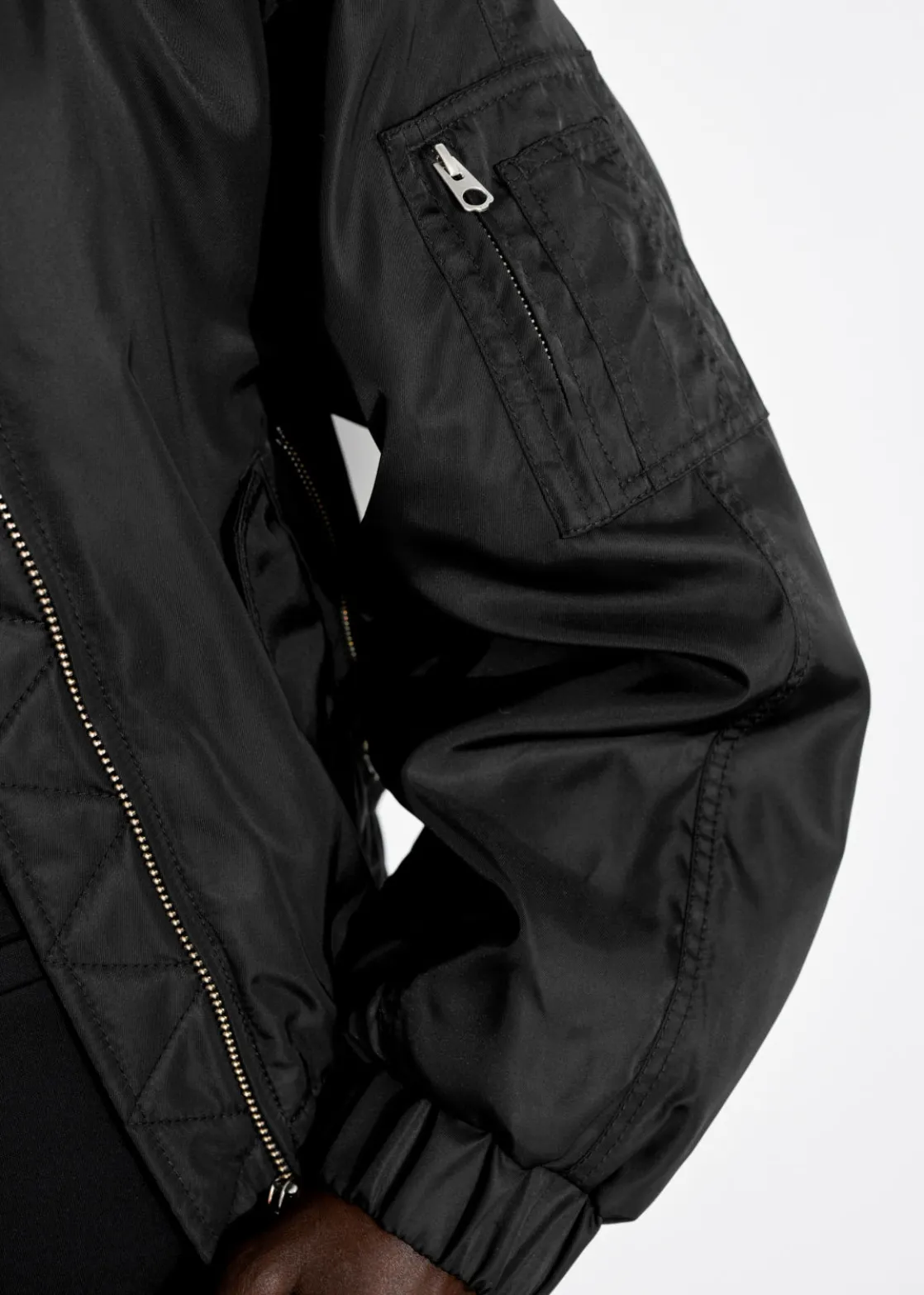 Boxy jacket detailed with duo zip-pockets and fastened with a two-way zipper.