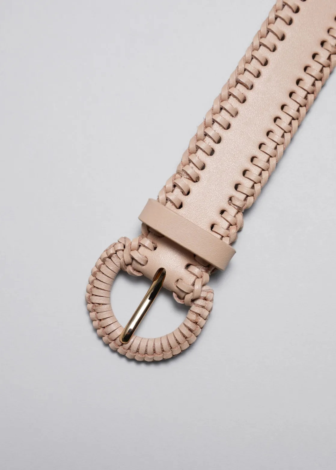 This belt, made from soft leather, has been crafted in a braided design. It features a rounded buckle trimmed with tonal leather for a sleek finish.