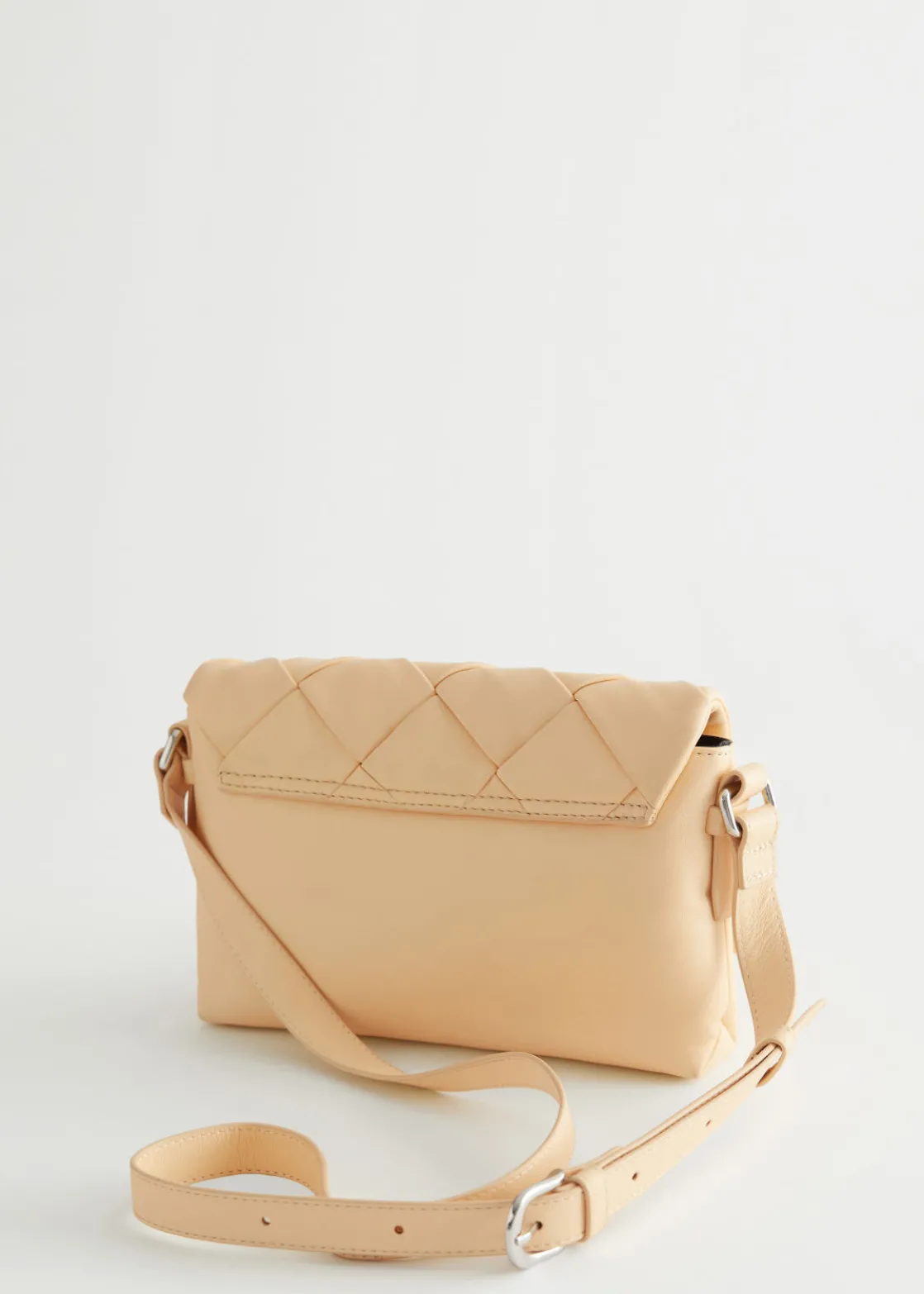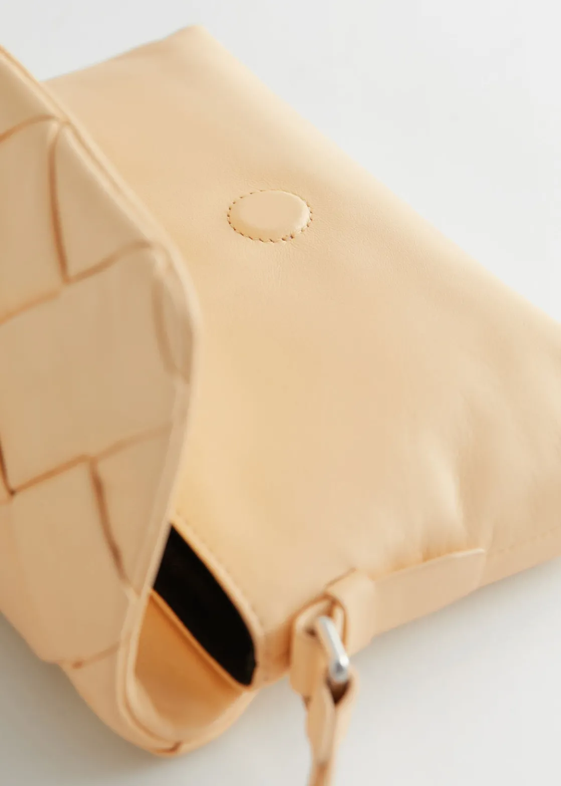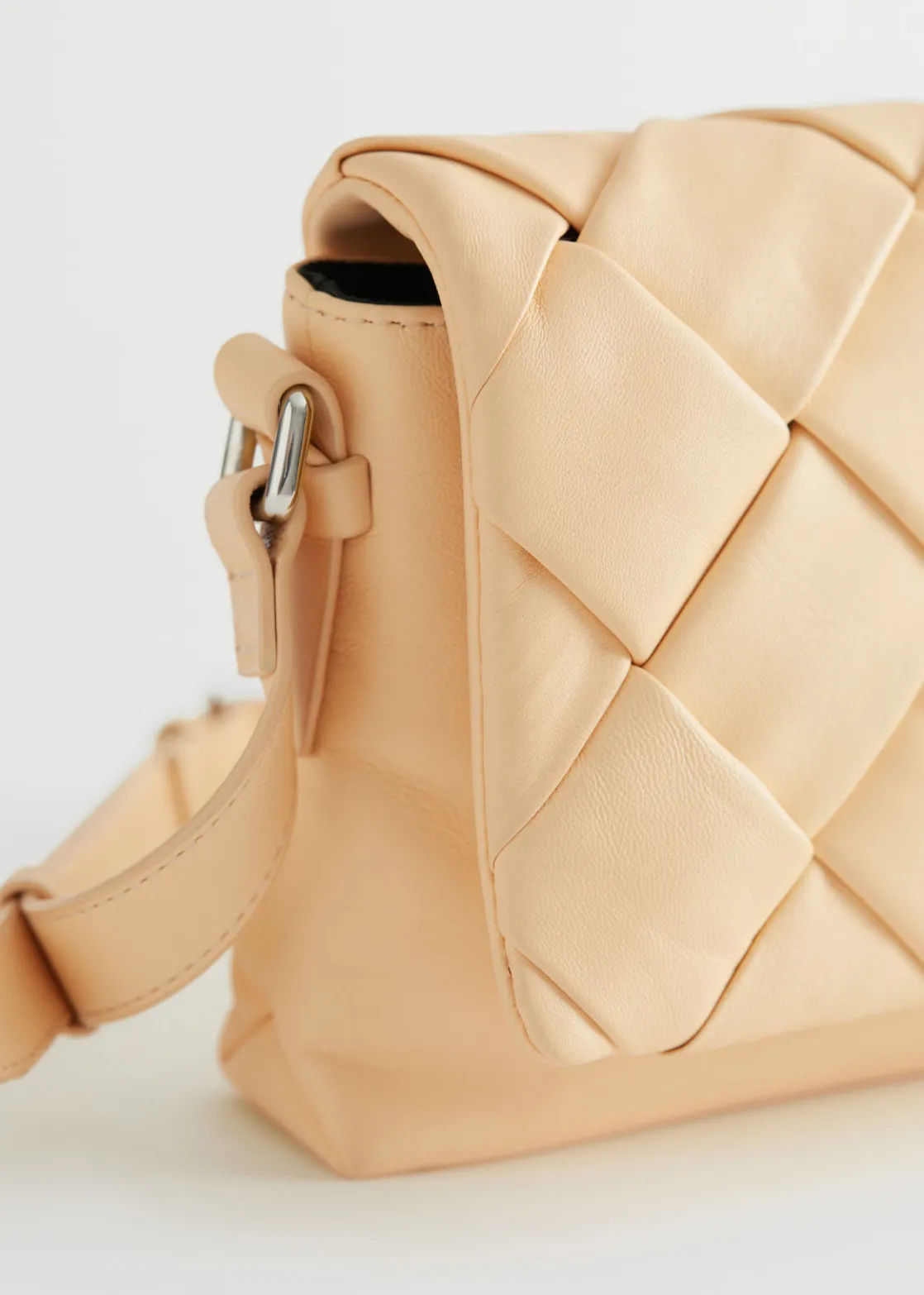 Leather crossbody bag with a braided flap, adjustable strap and an inner zipper pocket.