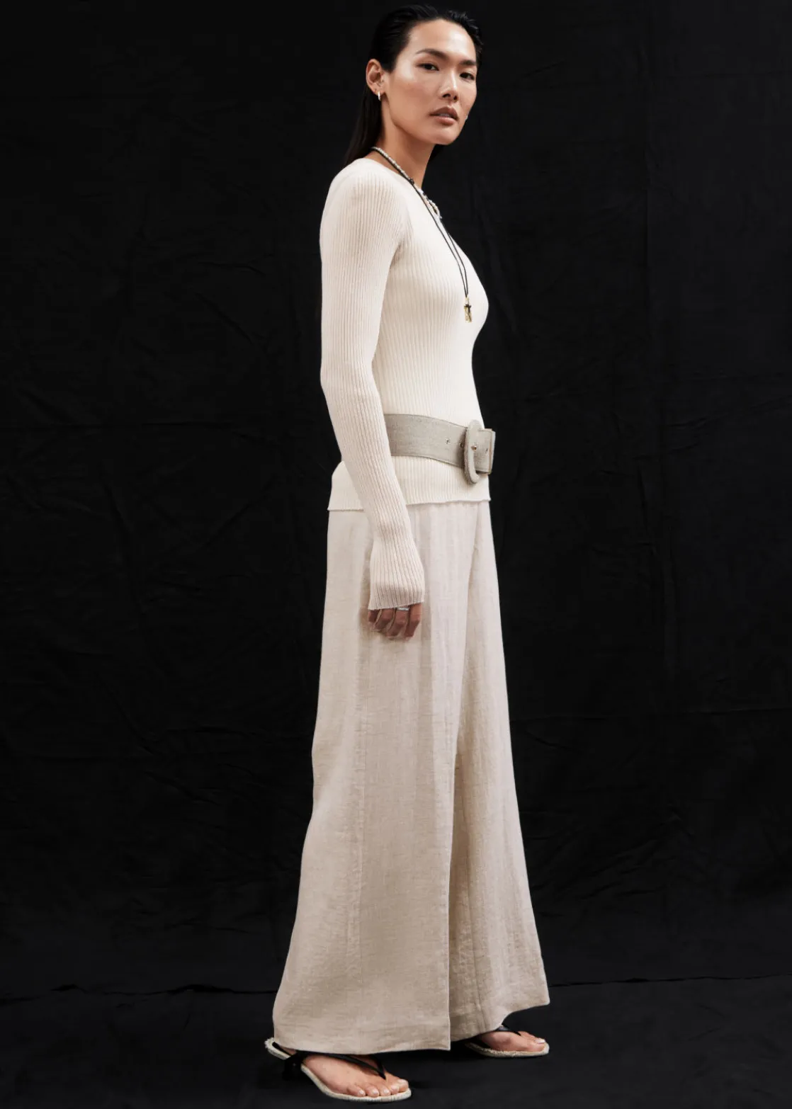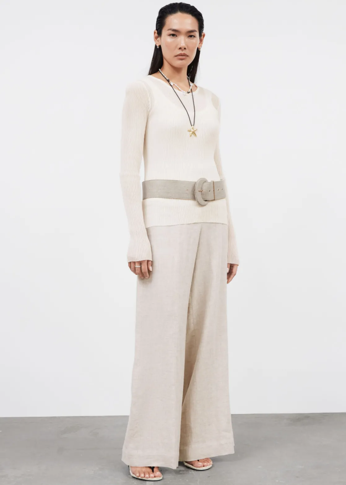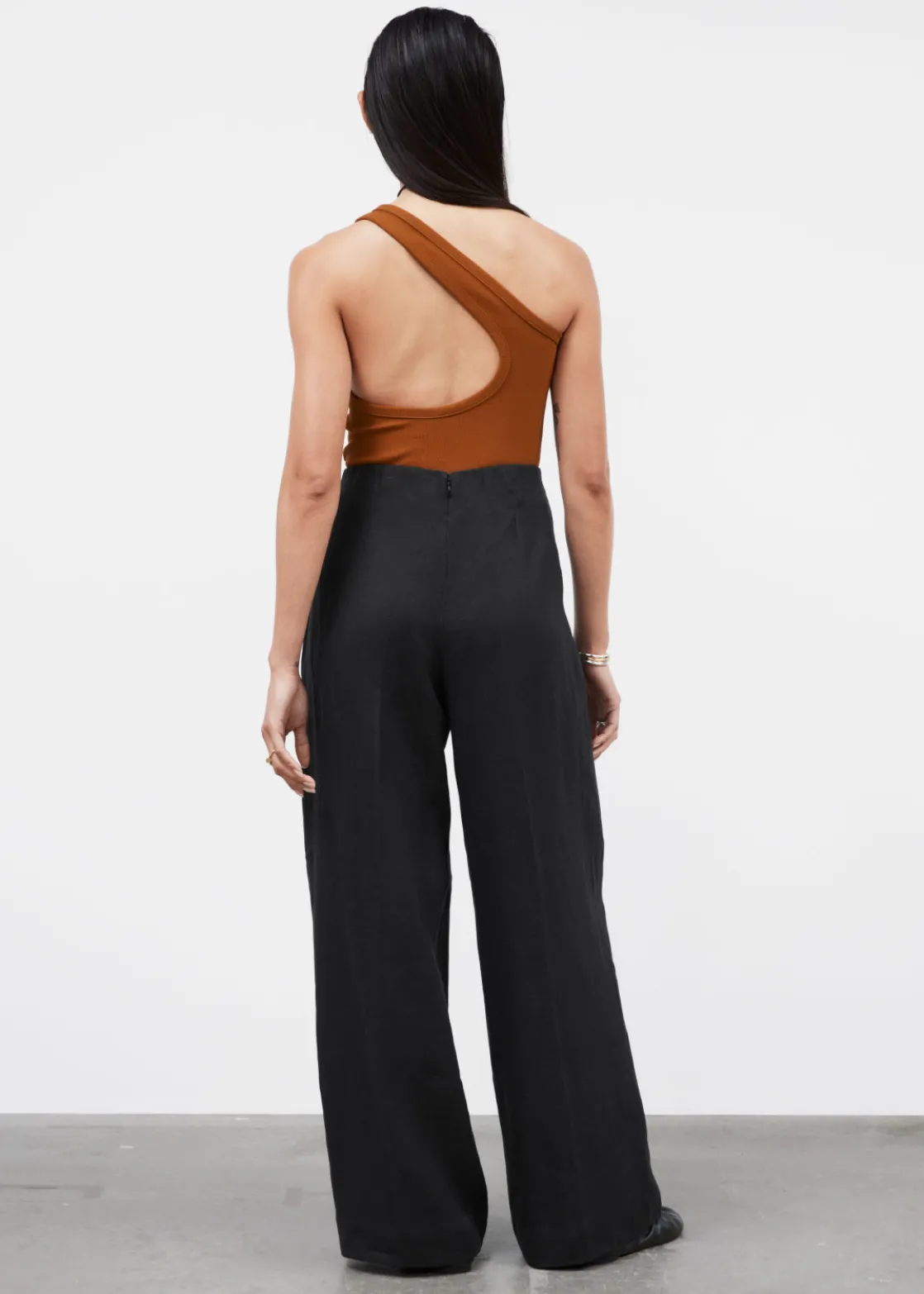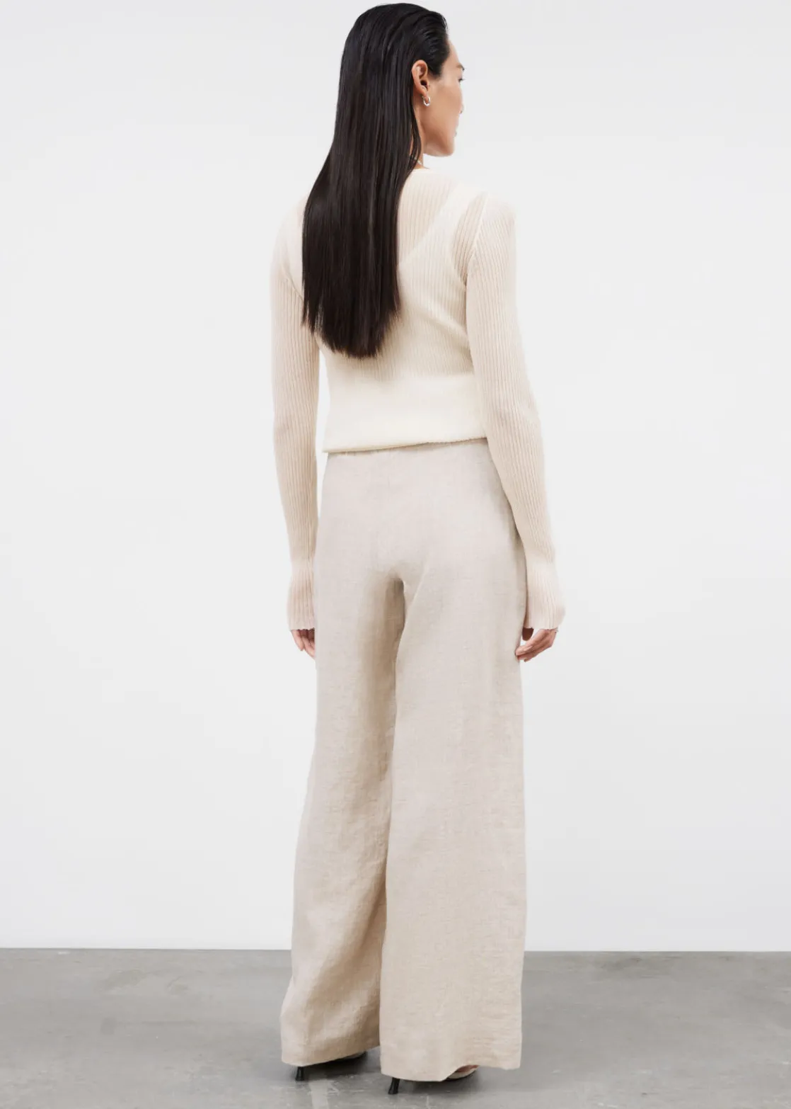 Relaxed high-waist trousers cut from a breezy material. Finished with a clean waistline.