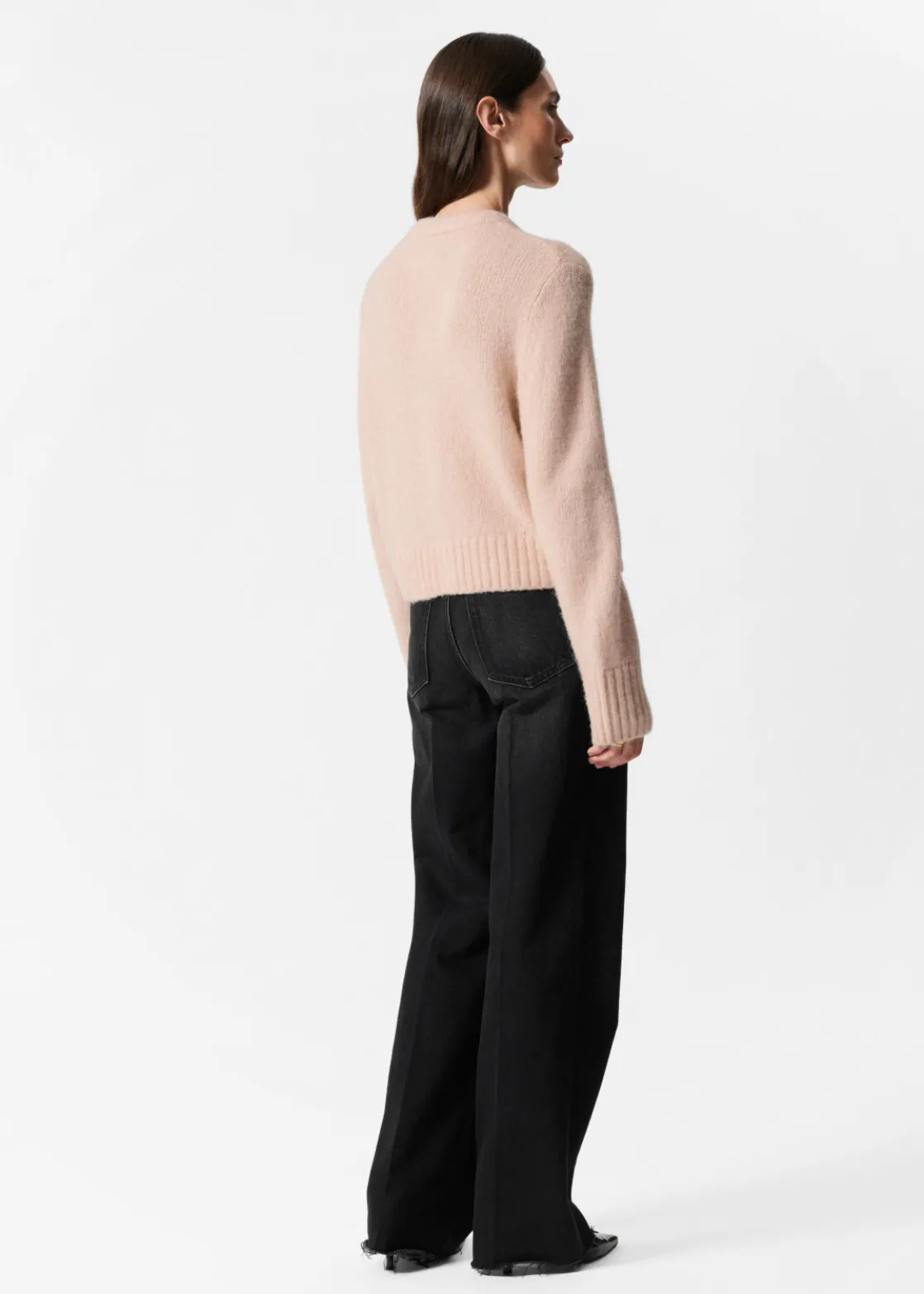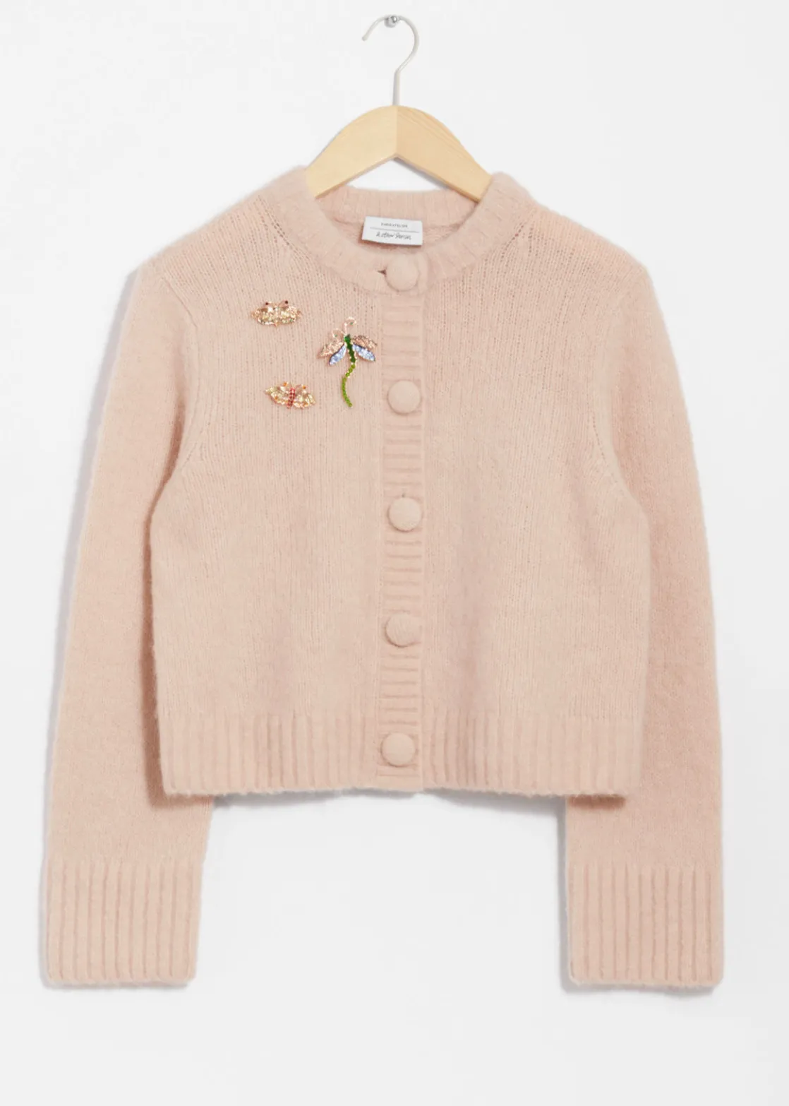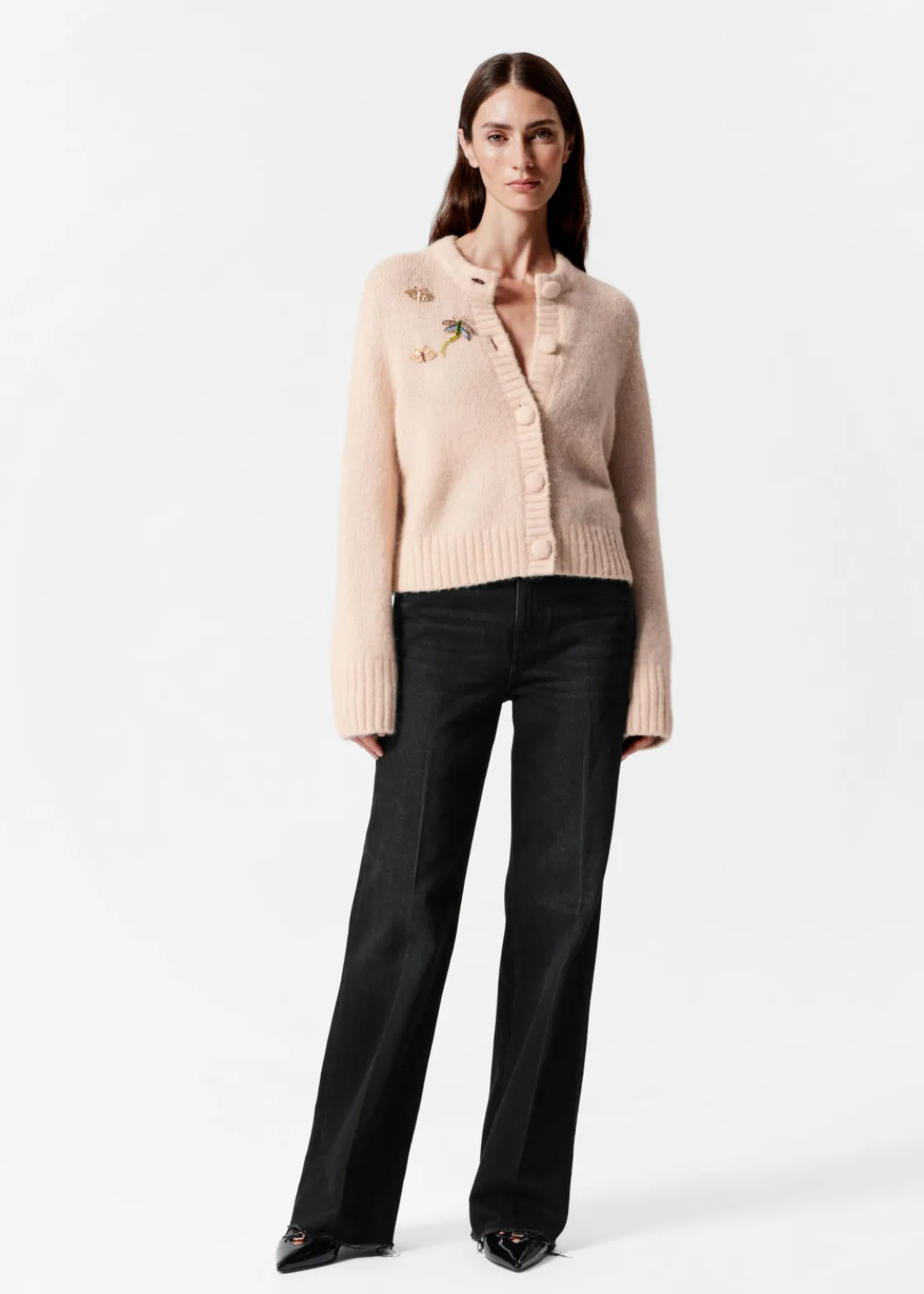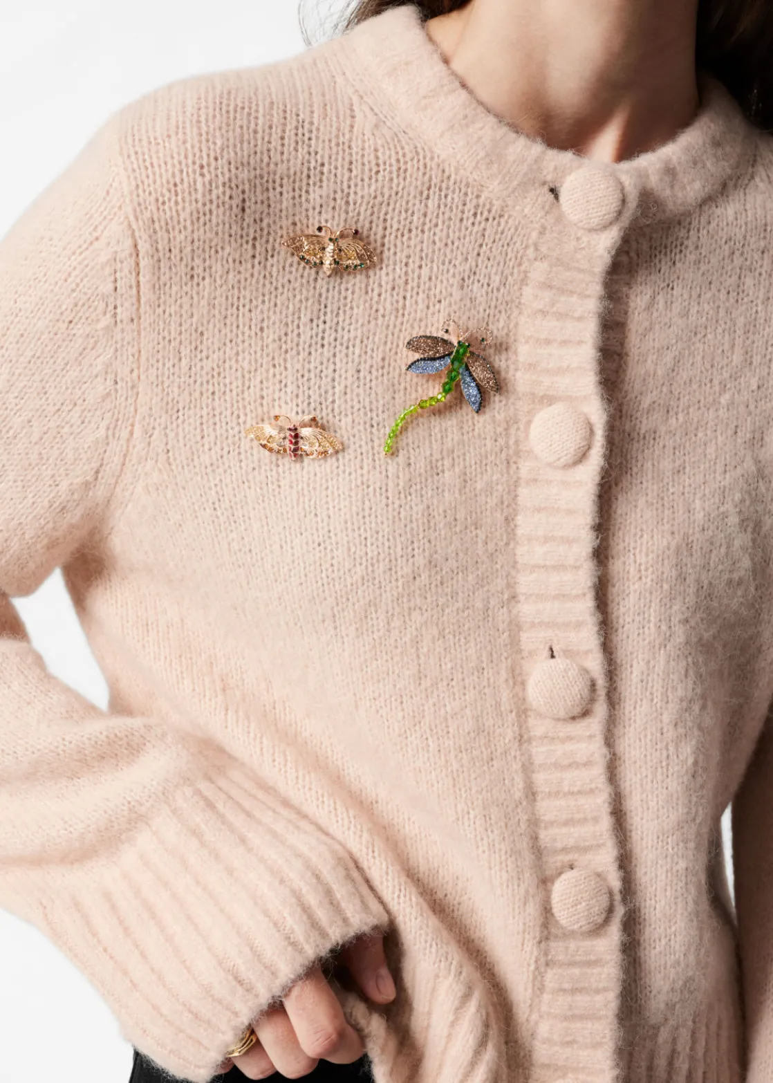 Long-sleeve cardigan knitted from a merino and alpaca wool blend. Accented with playful brooches at the chest.
