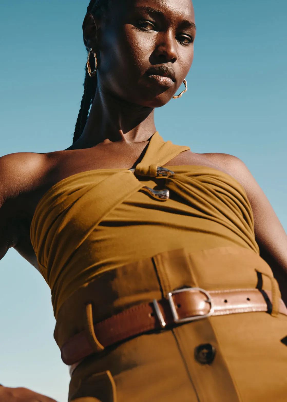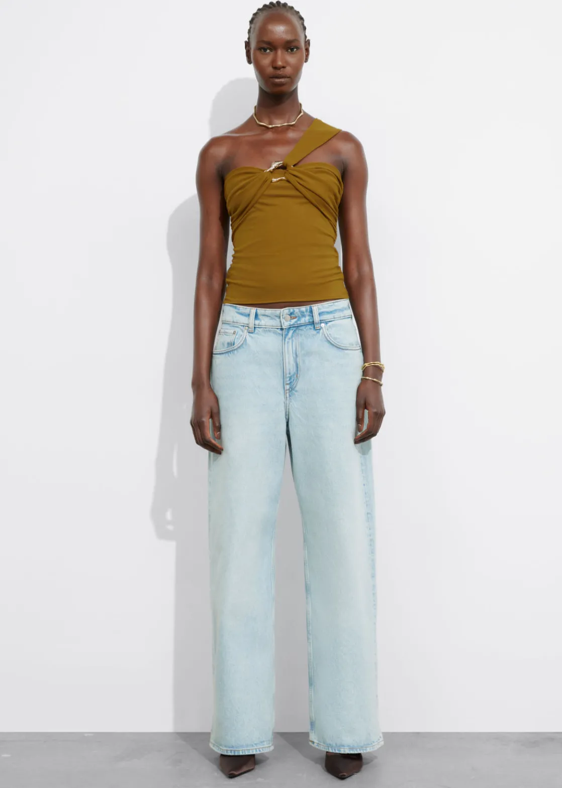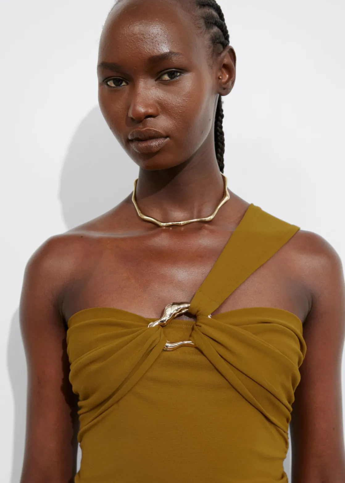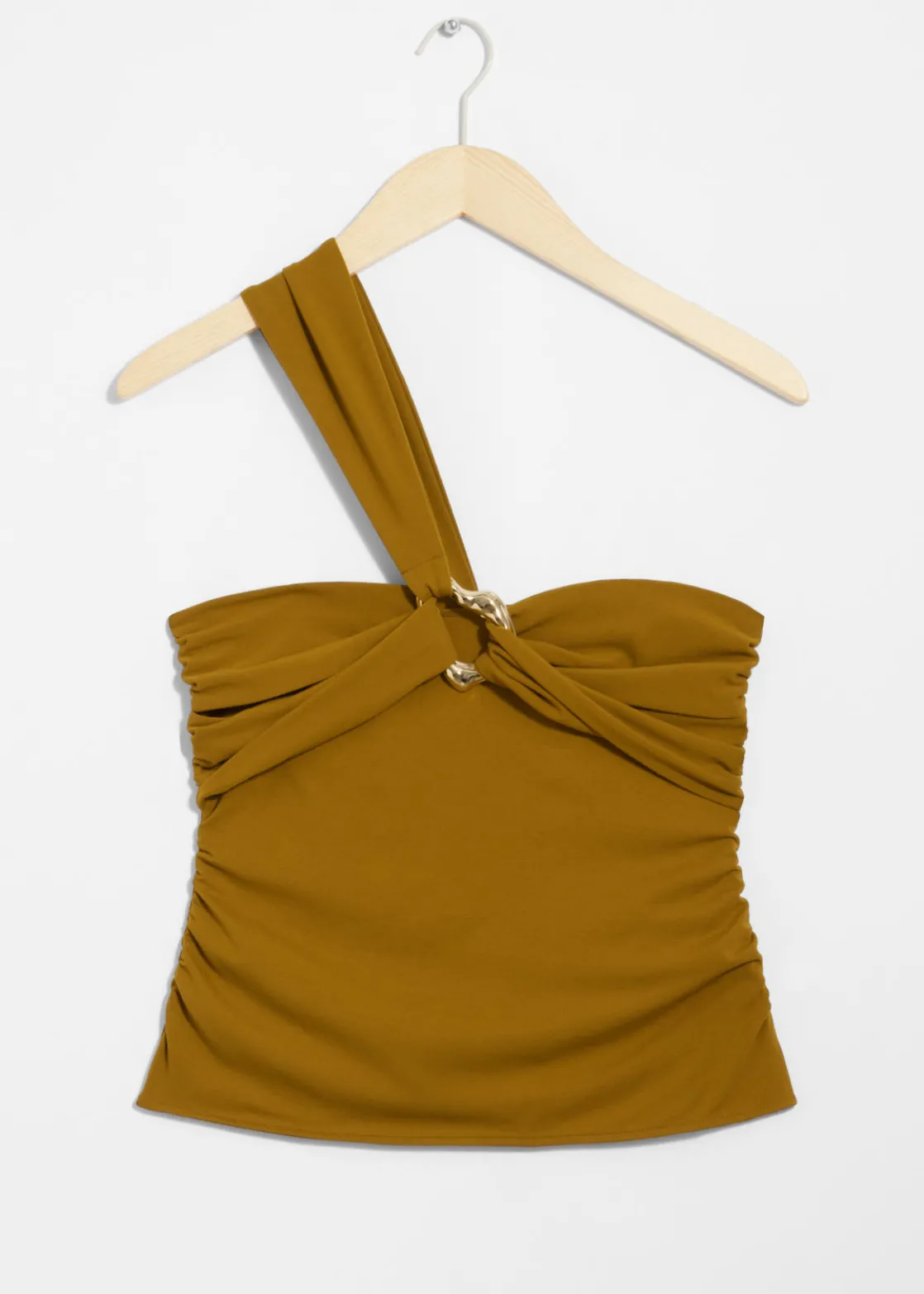 Top featuring a one-shoulder finish and allover gathered detailing. Accented with a gold-toned buckle at the chest.