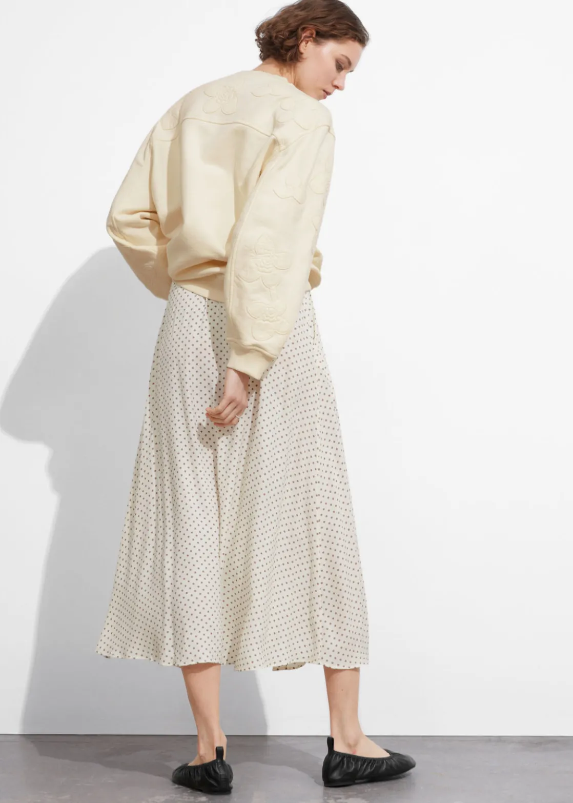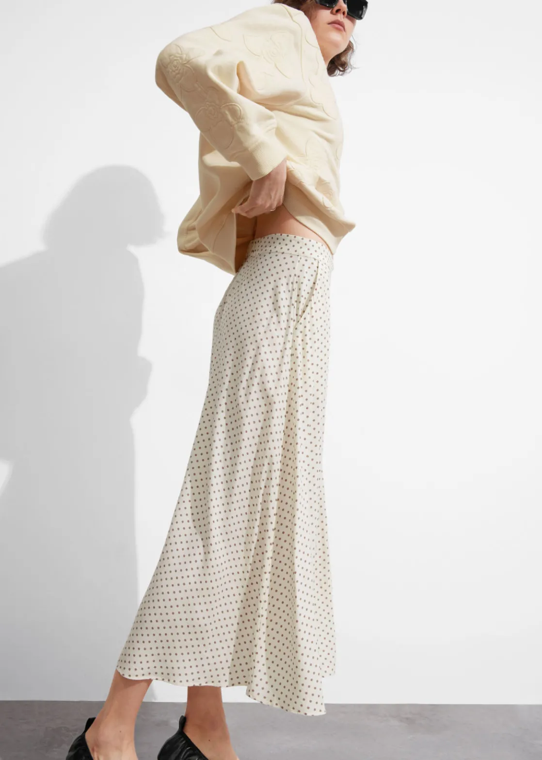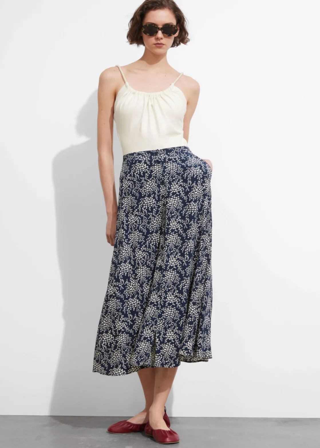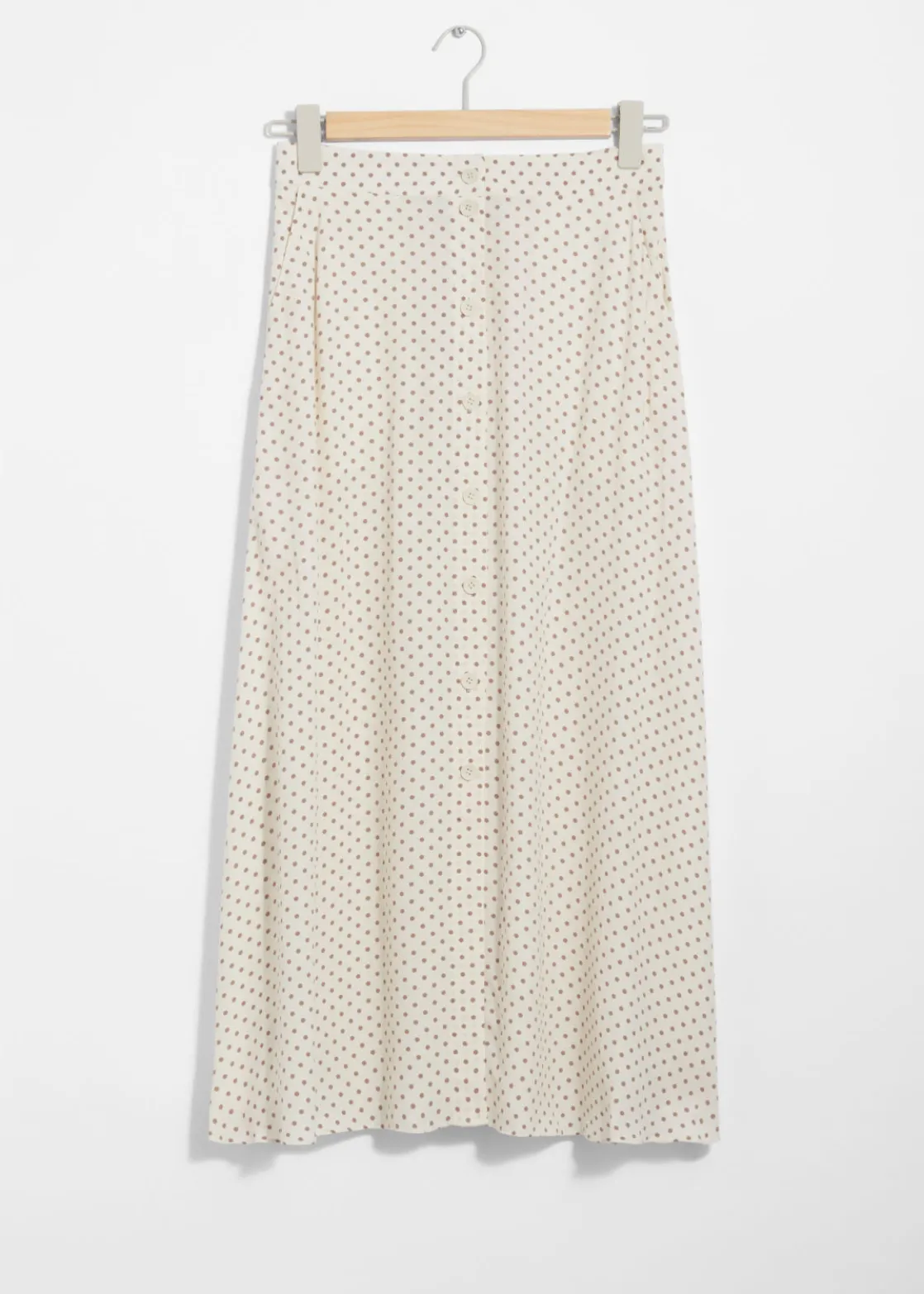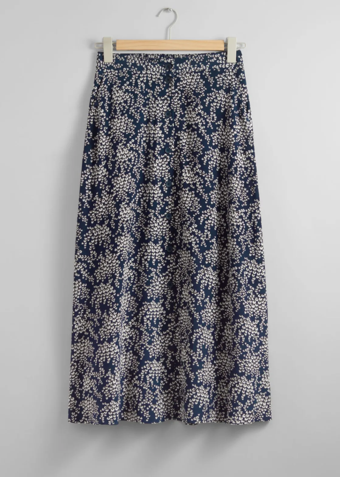 High-waist A-line midi skirt designed with a buttoned front and an elasticated waistline.