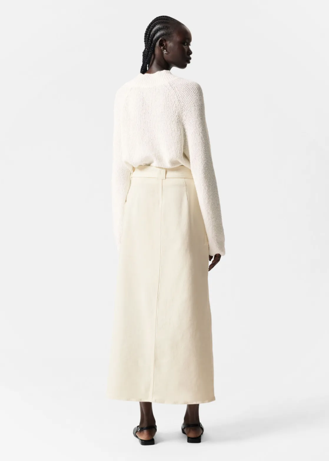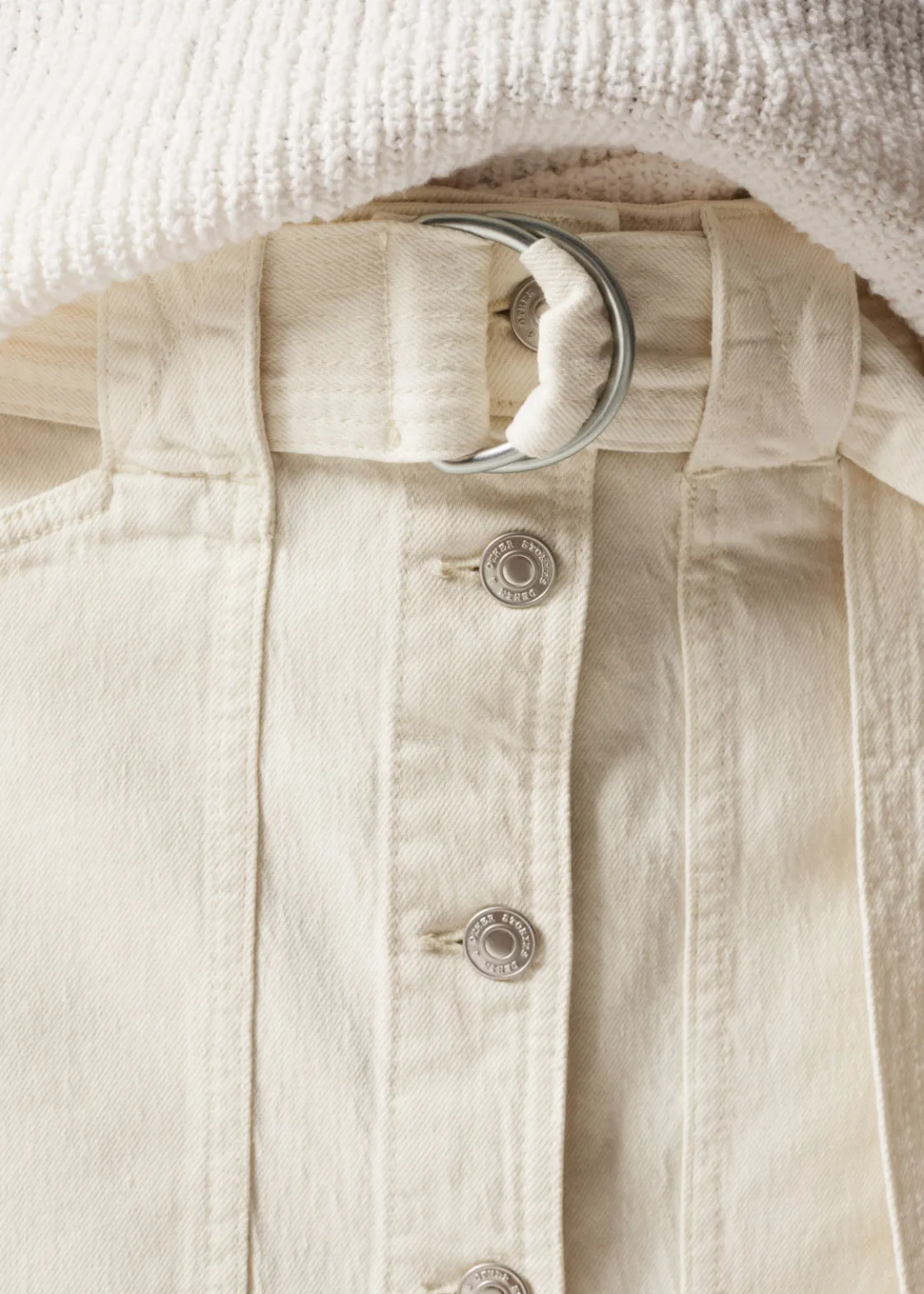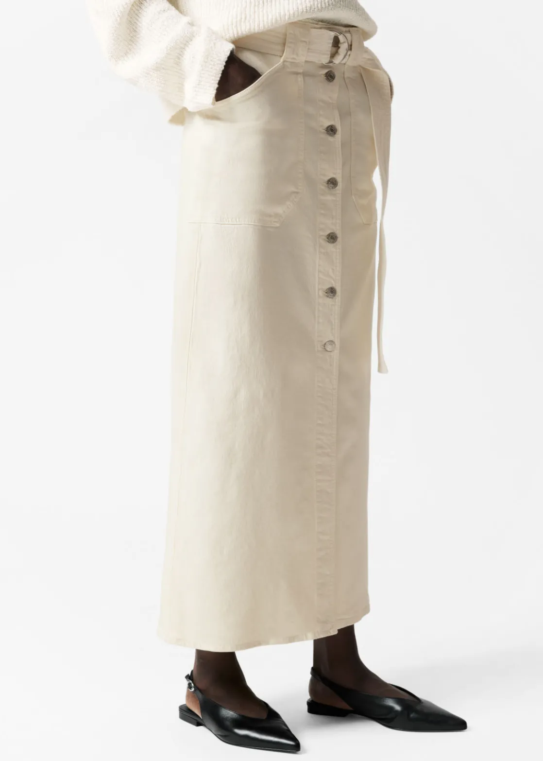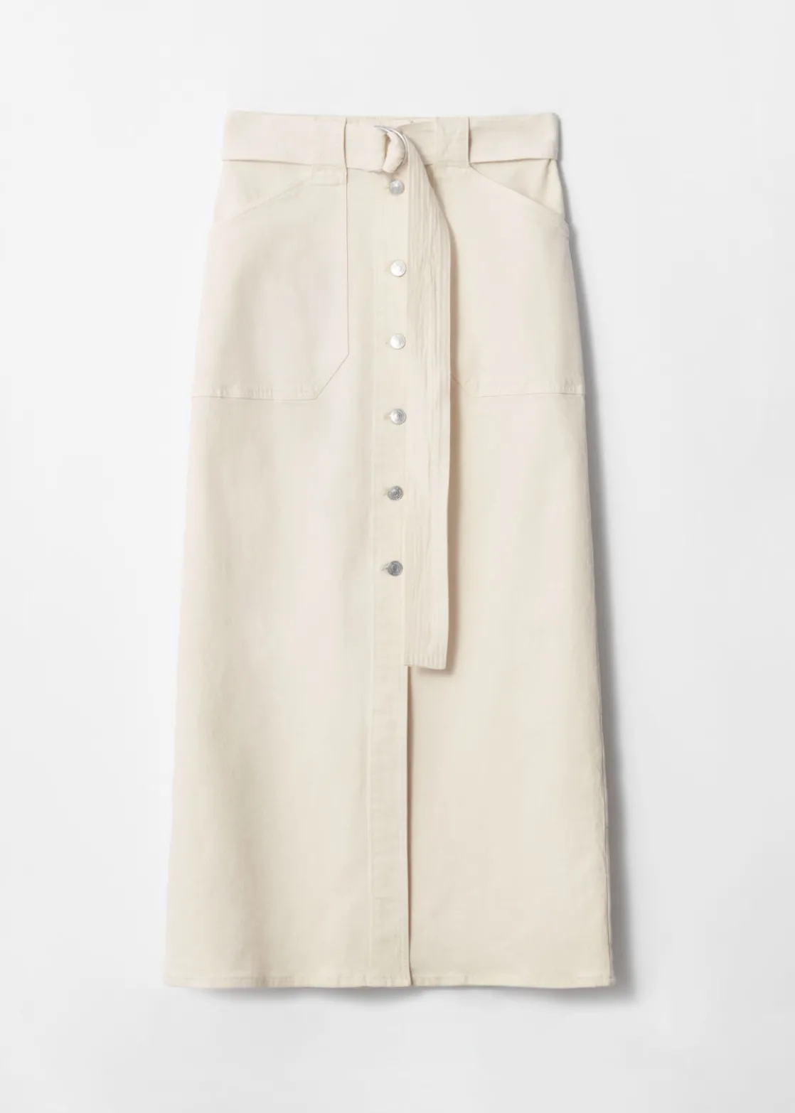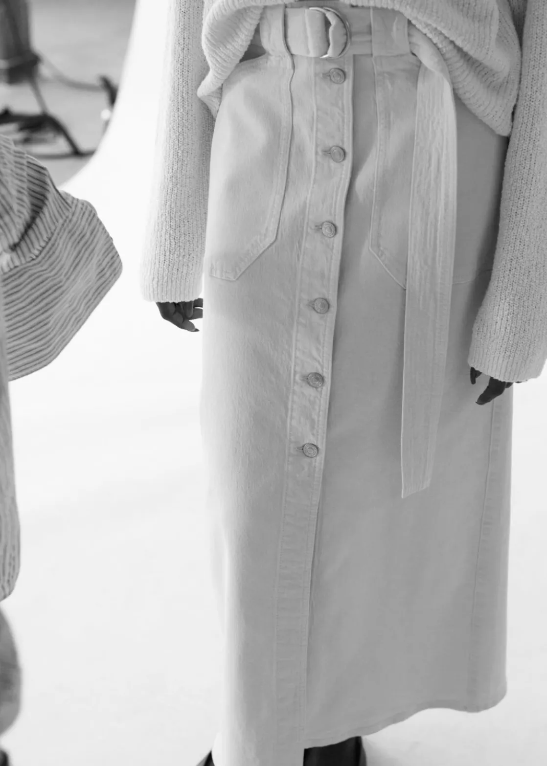 High-waist denim midi skirt featuring with a D-ring belt and duo large patch pockets. Traced with jeans buttons along the front.