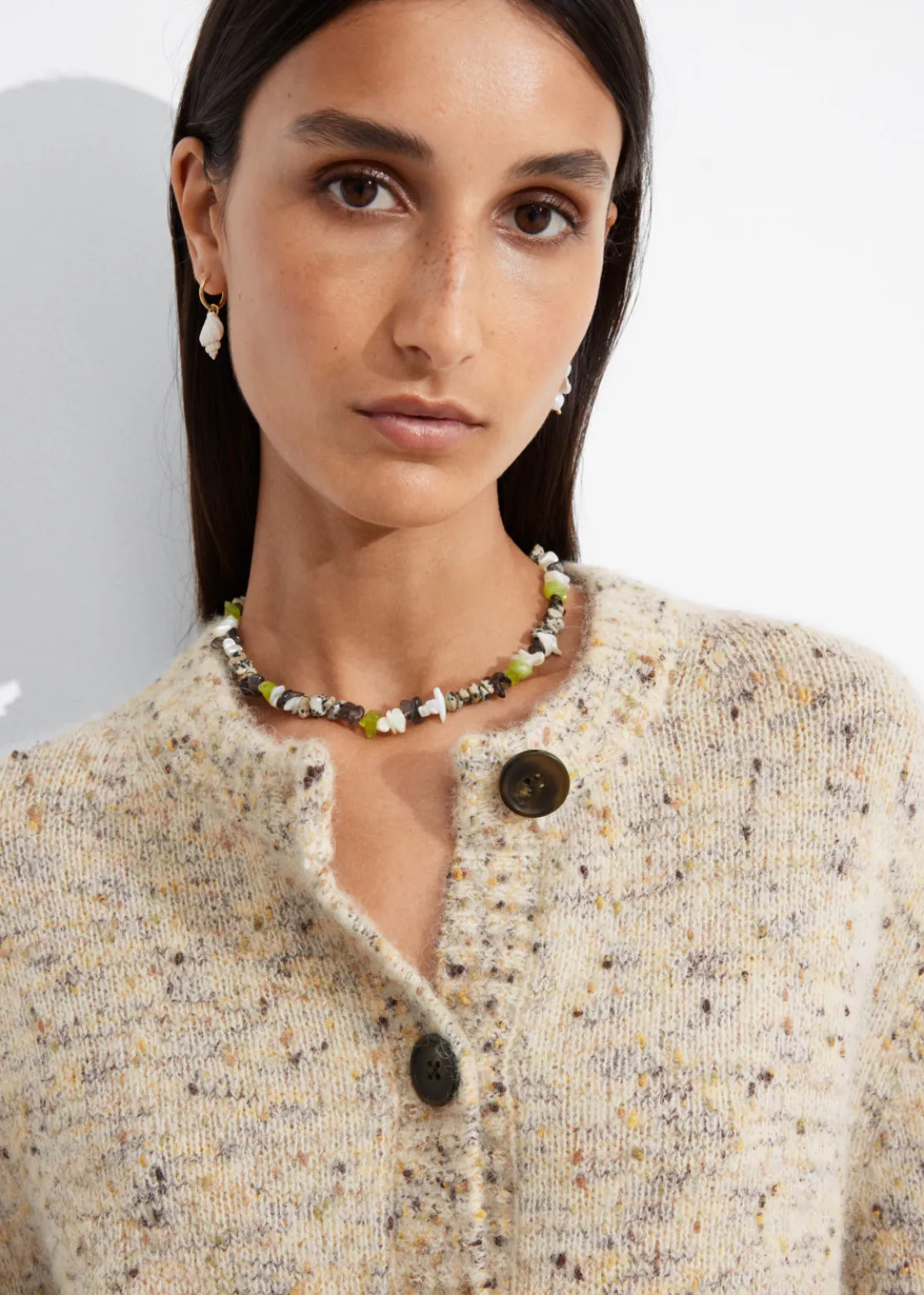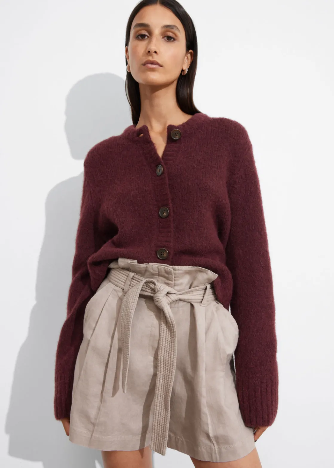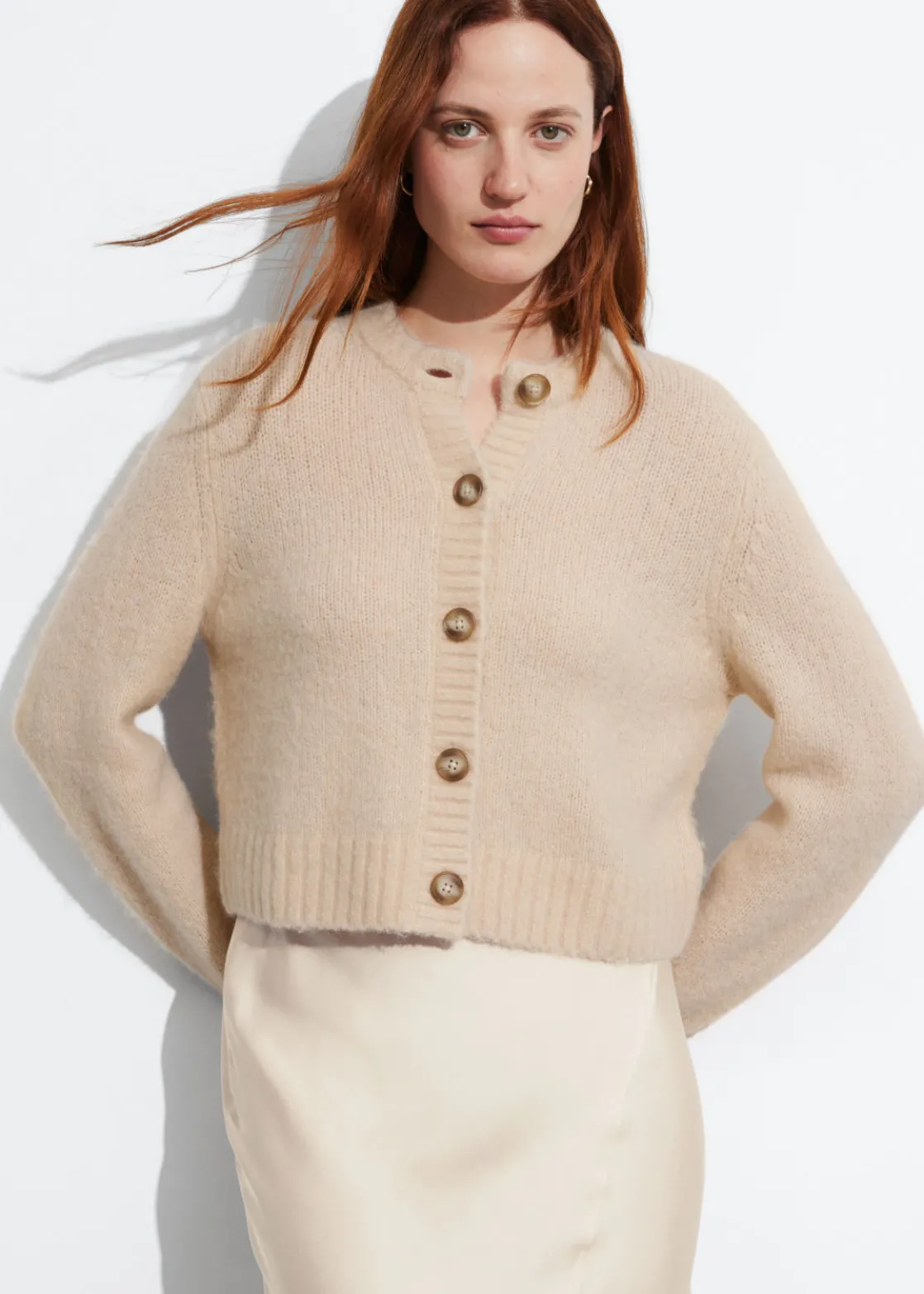 Cardigan knitted from a wool and alpaca blend. Traced with five button closures.