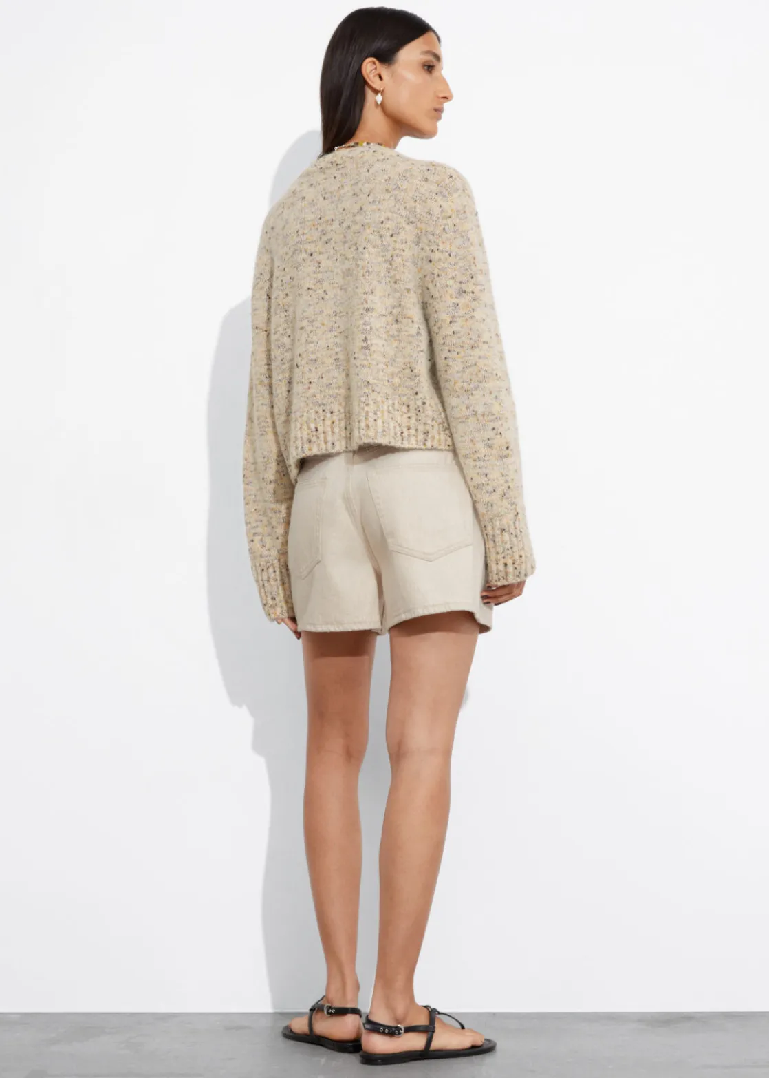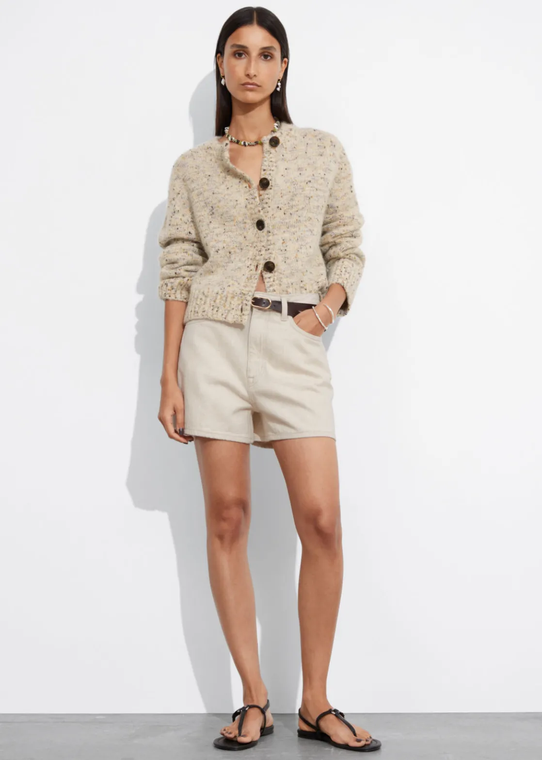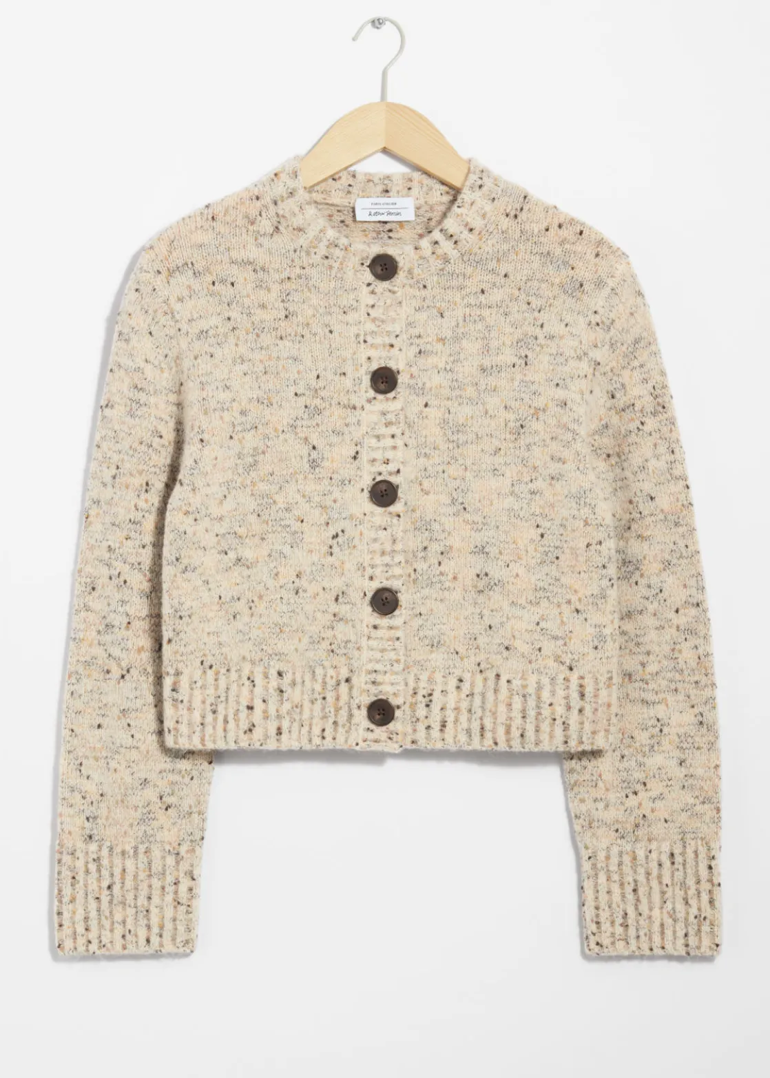 Cardigan knitted from a wool and alpaca blend. Traced with five button closures.